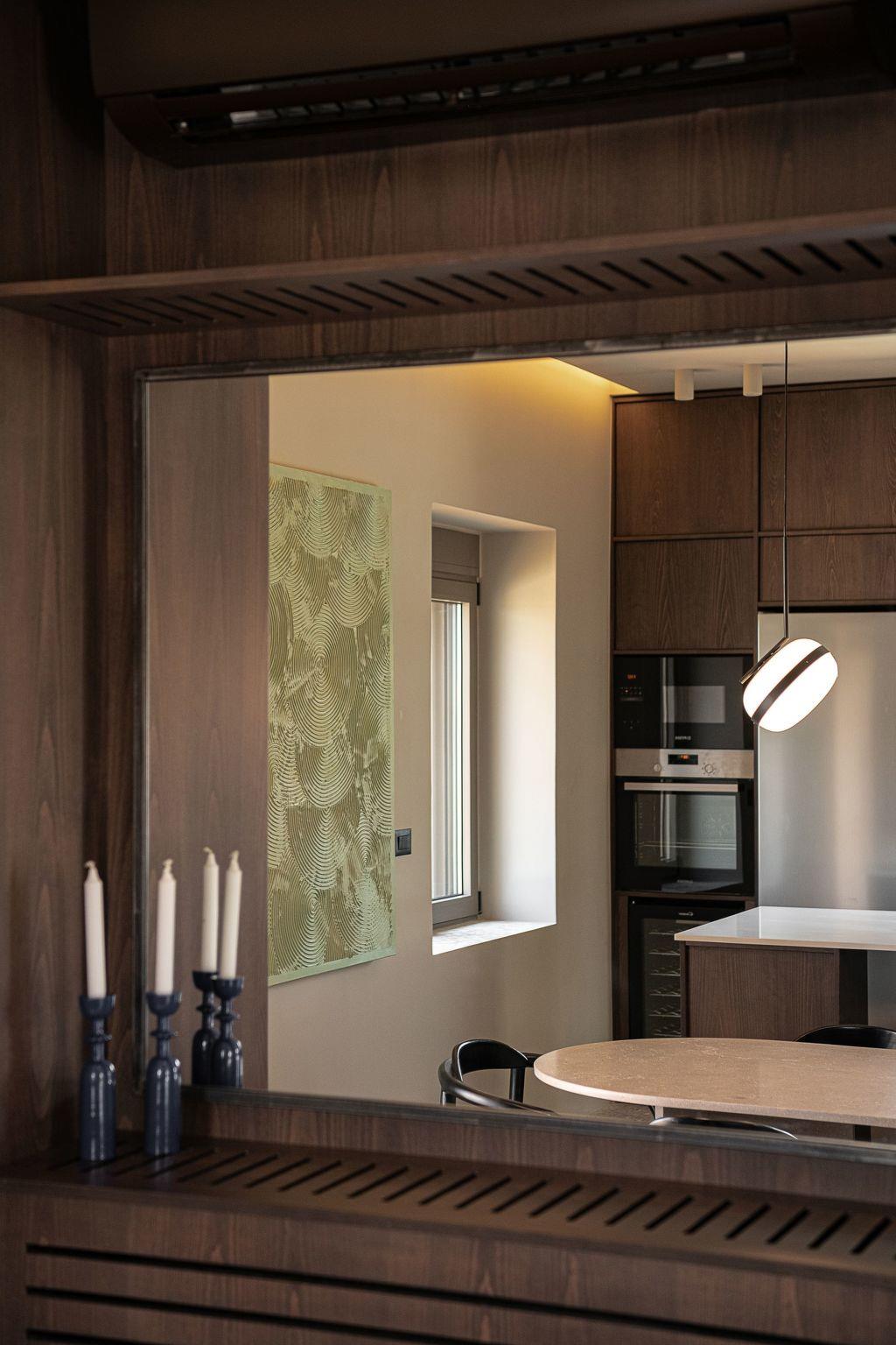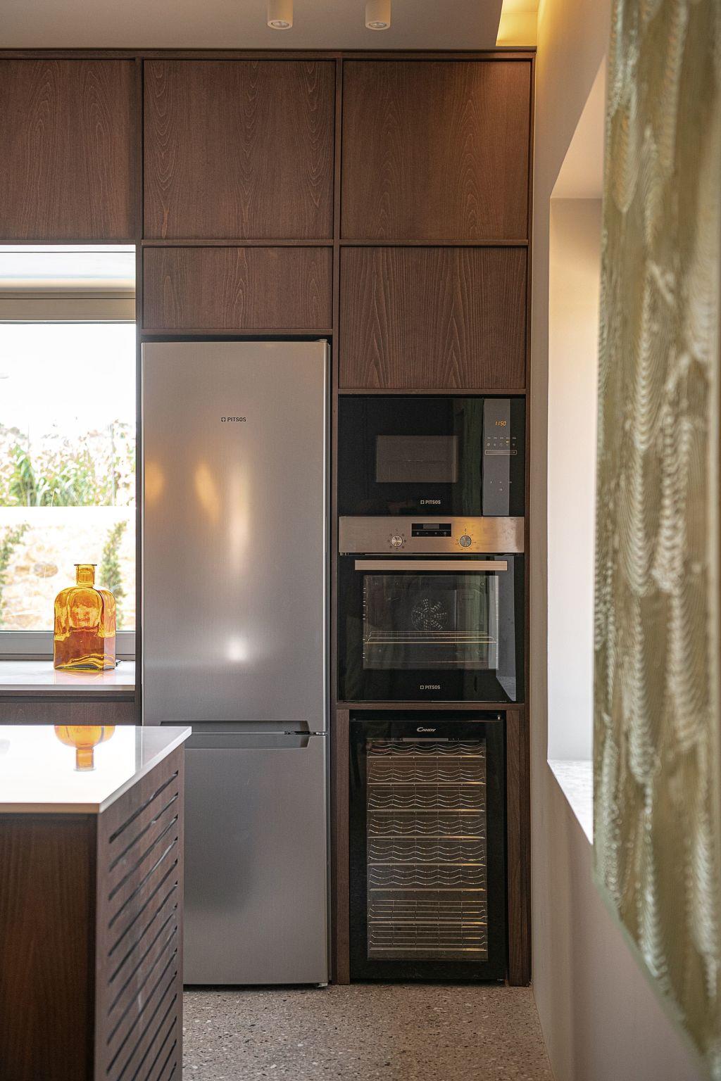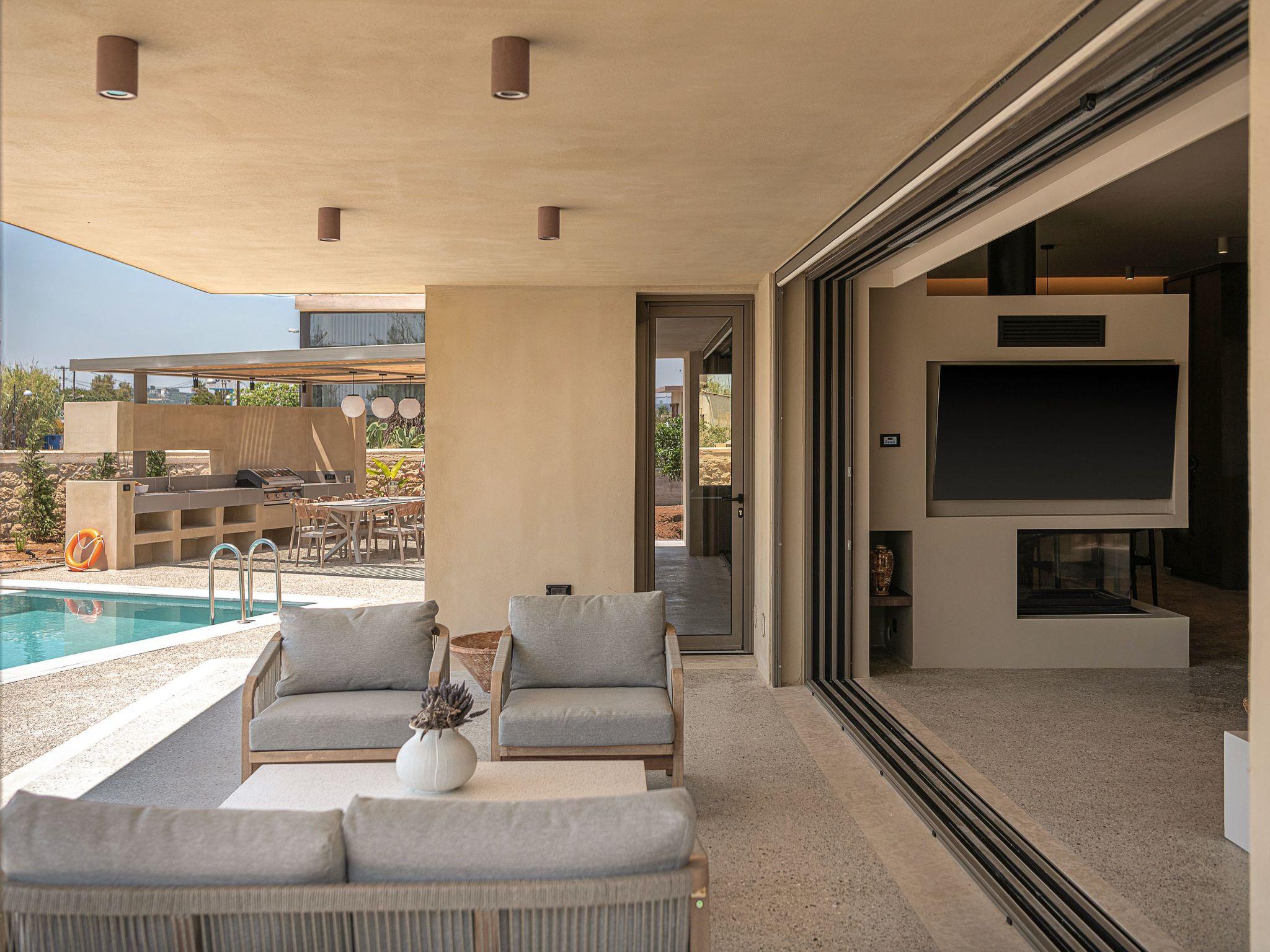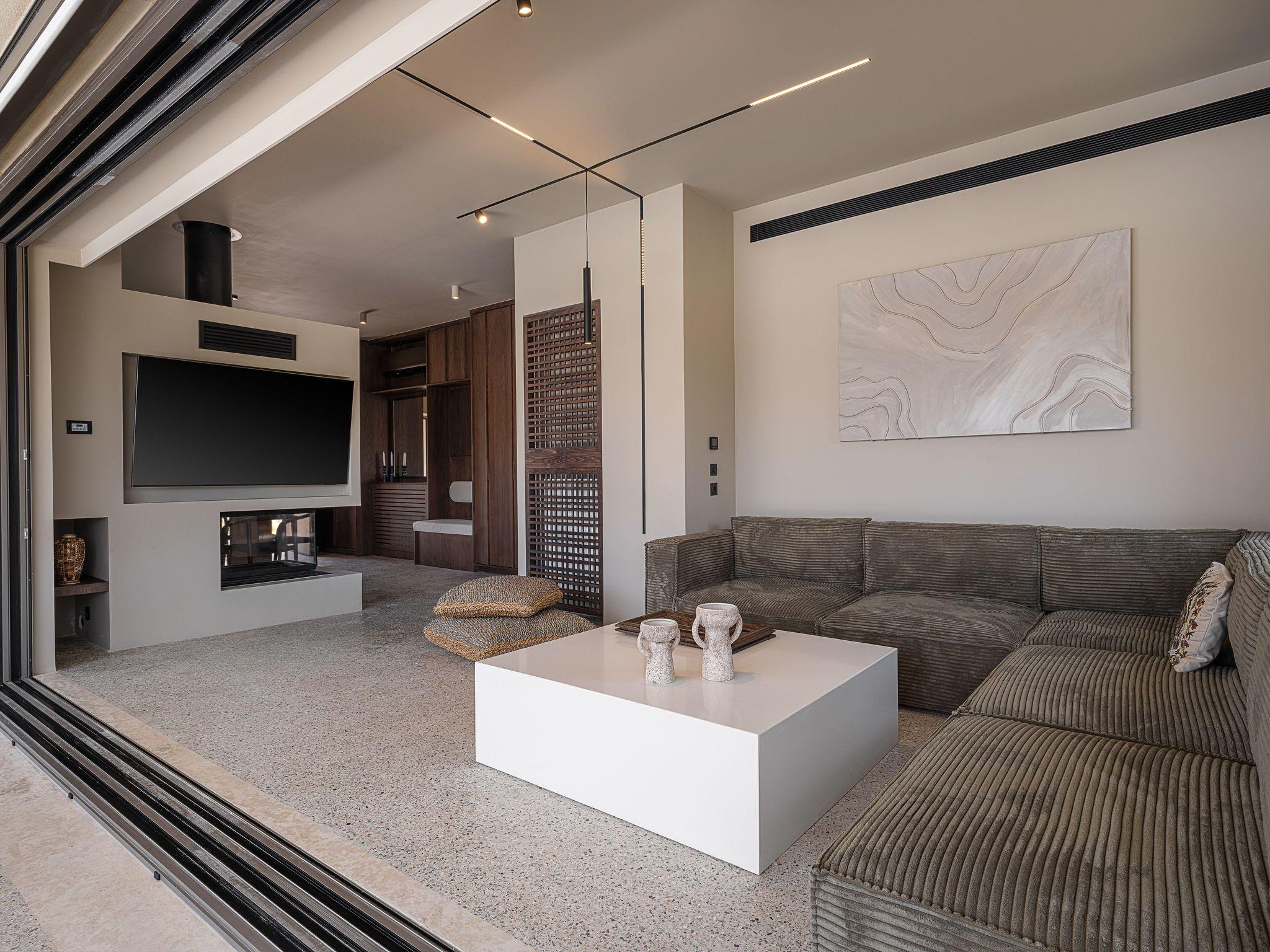 The fully equipped kitchen includes an oven, stovetop, dishwasher, espresso machine, toaster, and everything you need for slow, leisurely meals. Gather around the indoor dining table for 6–8 or step outside to dine under the stars.Living AreaWarm and minimal, the living room invites you to unwind. With a sleek fireplace, cozy sofa corner, lounge chairs, TV, and open views of the pool, it’s the perfect space to reconnect and relax.