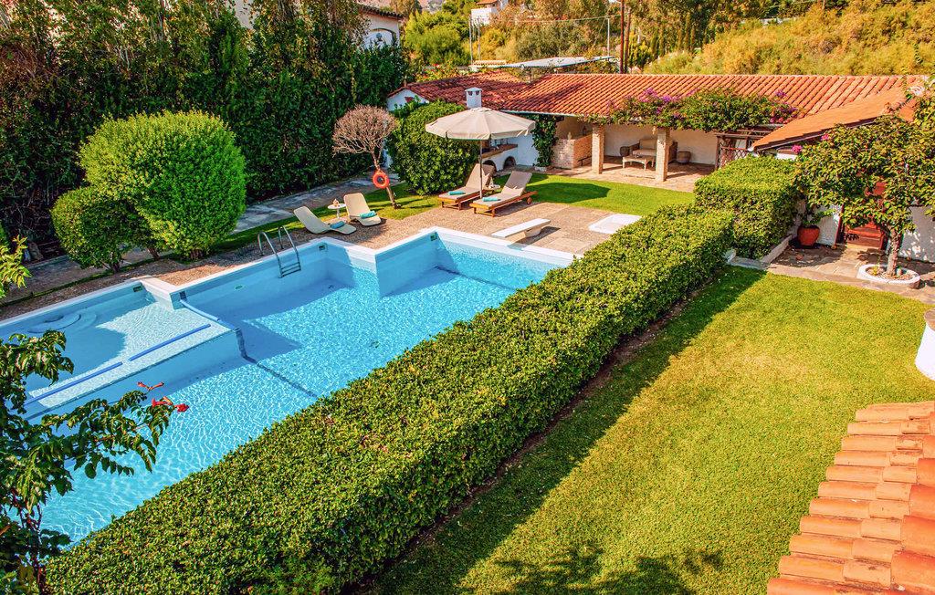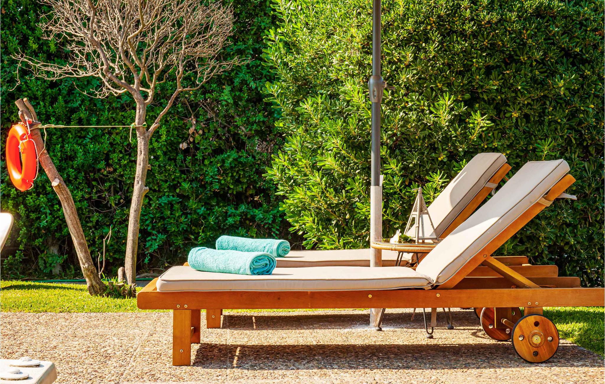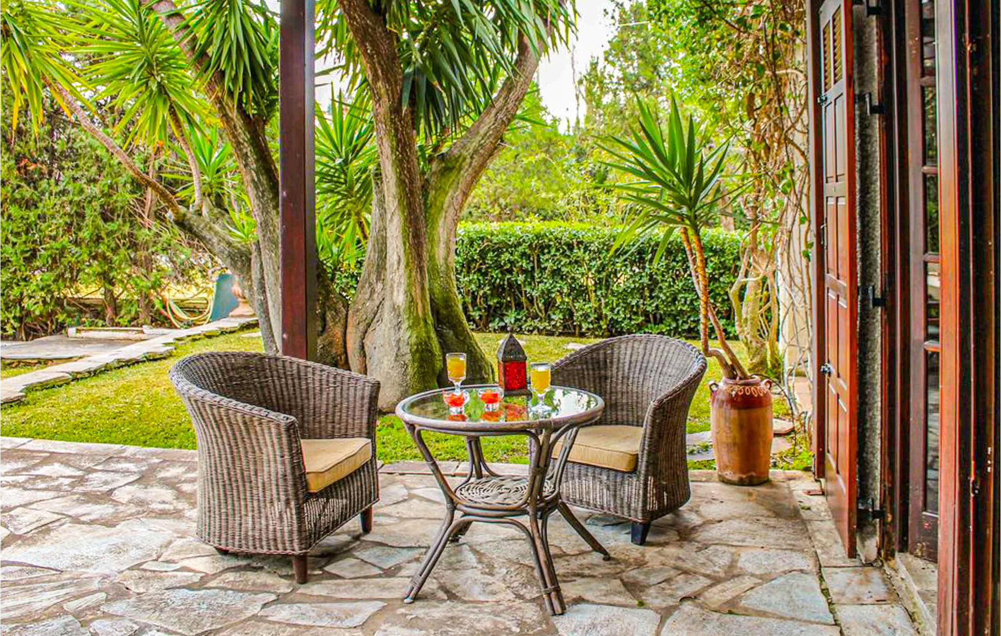 Huset er omgivet af en betagende have med træer og blomster i alle regnbuens farver. På husets højre side er der en grillplads med havemøbler, hvor I kan lave lækker mad. På den store terrasse ligger poolen, her er også solsenge, bord og stole – og det er et oplagt at spise morgenmaden samme sted. Senere på dagen kan I nyde en kølig drink fra baren og sætte jer i skyggen.
