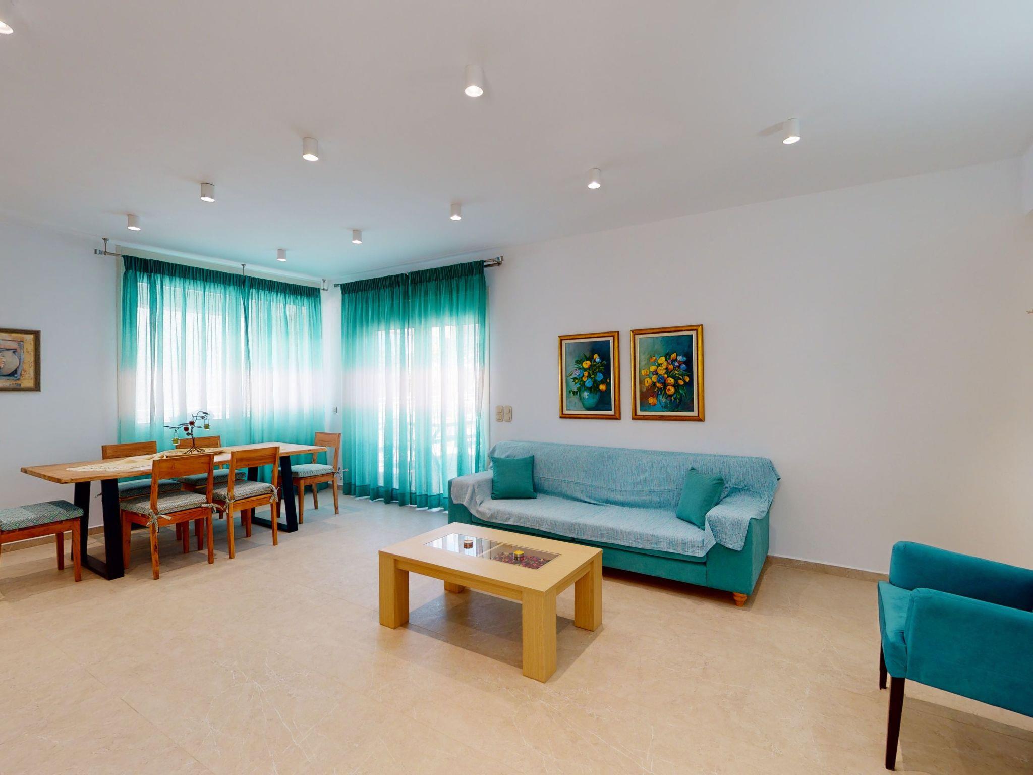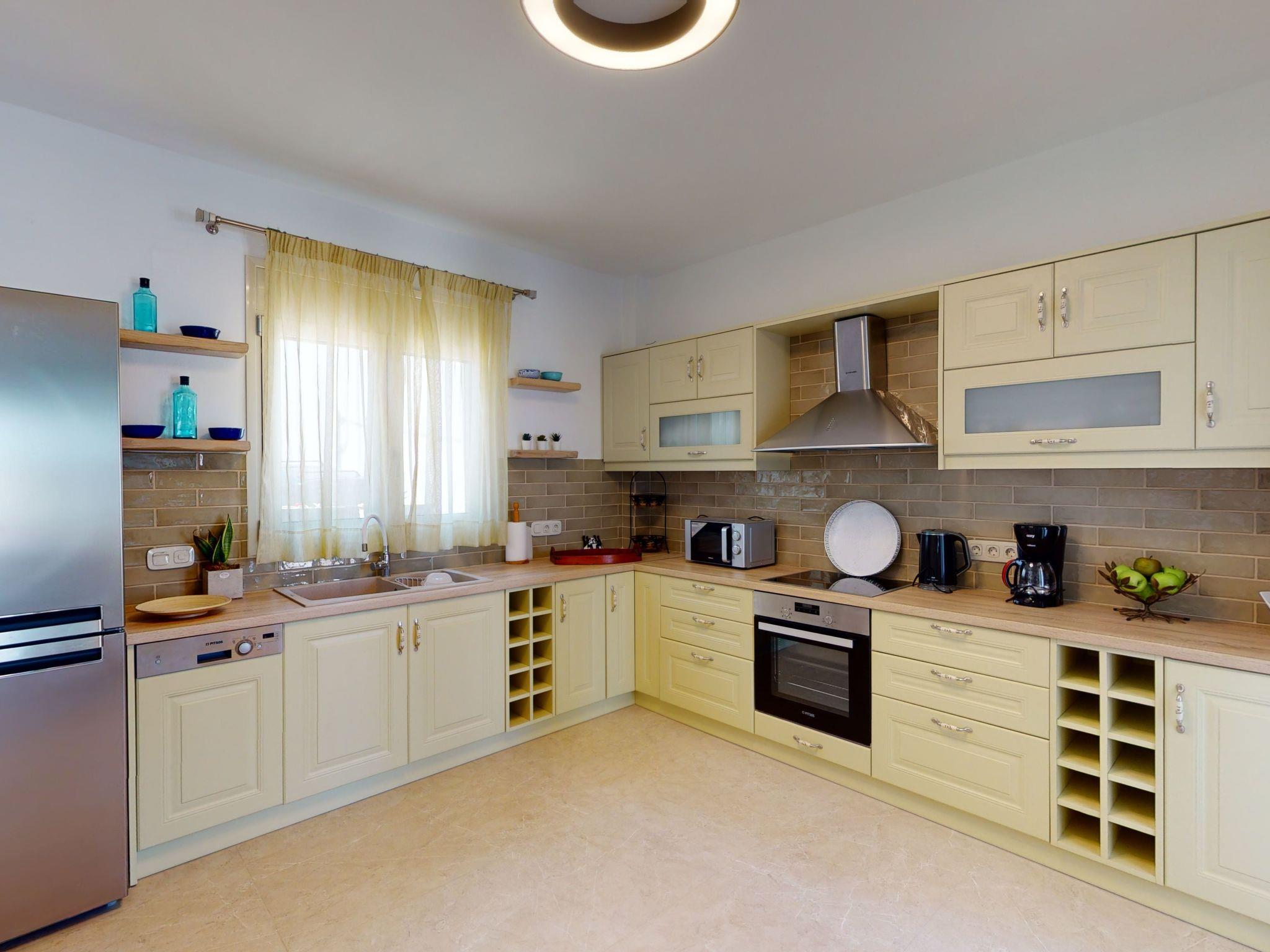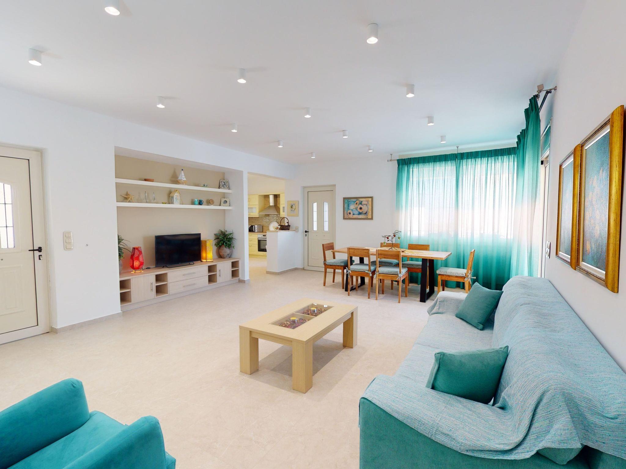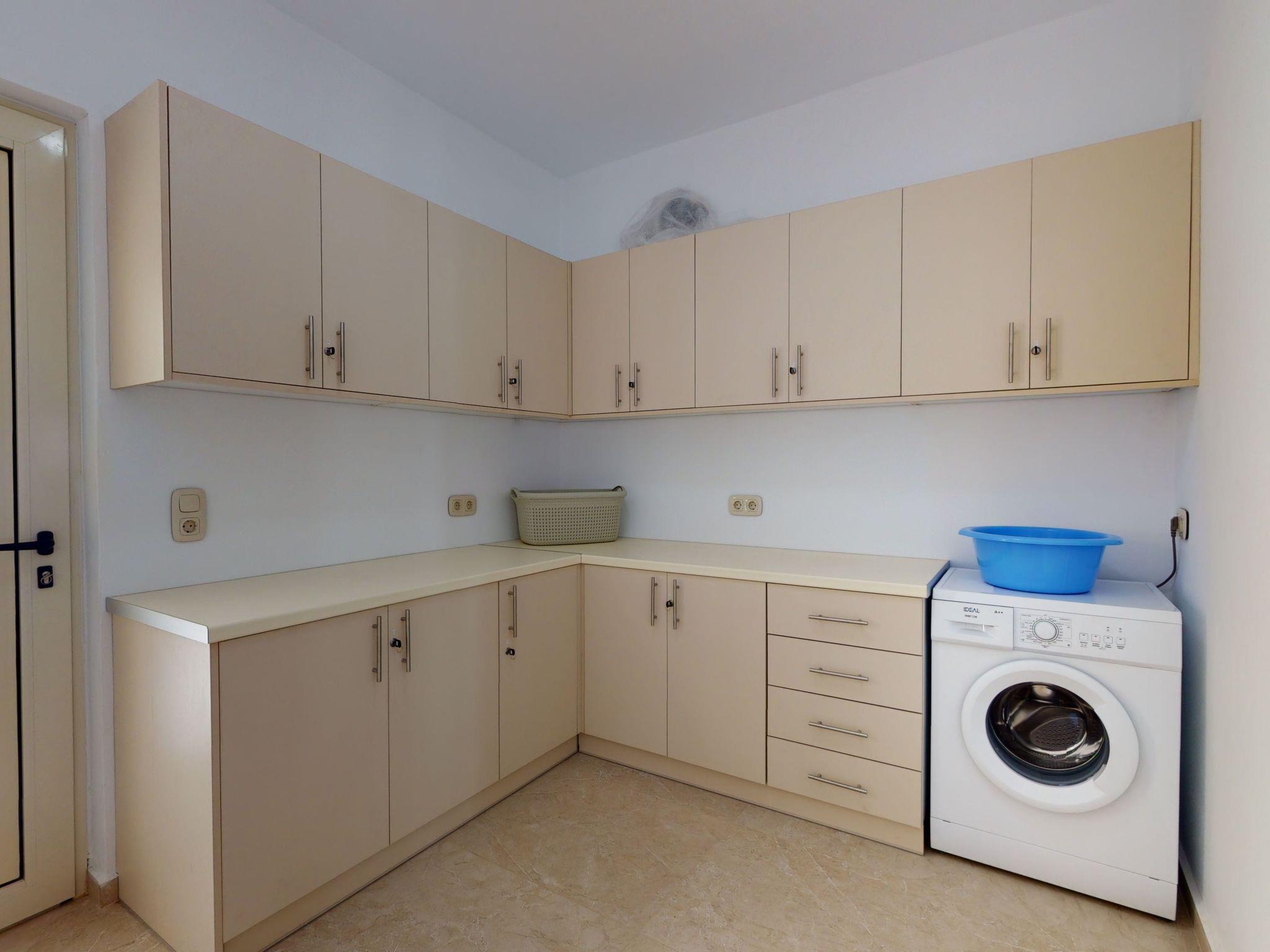 Inside, the villa impresses with a harmonious balance of comfort and functionality across its three bedrooms and spacious living areas. Each bedroom is fitted with air conditioning, ensuring a comfortable climate year-round. The living spaces are thoughtfully designed to foster gatherings and shared moments, with ample seating and a welcoming ambiance. For added convenience, the villa is equipped with a washing machine and clothes dryer, alongside kitchen essentials such as a dishwasher, coffee machine, and electric kettle, ensuring a hassle-free stay.