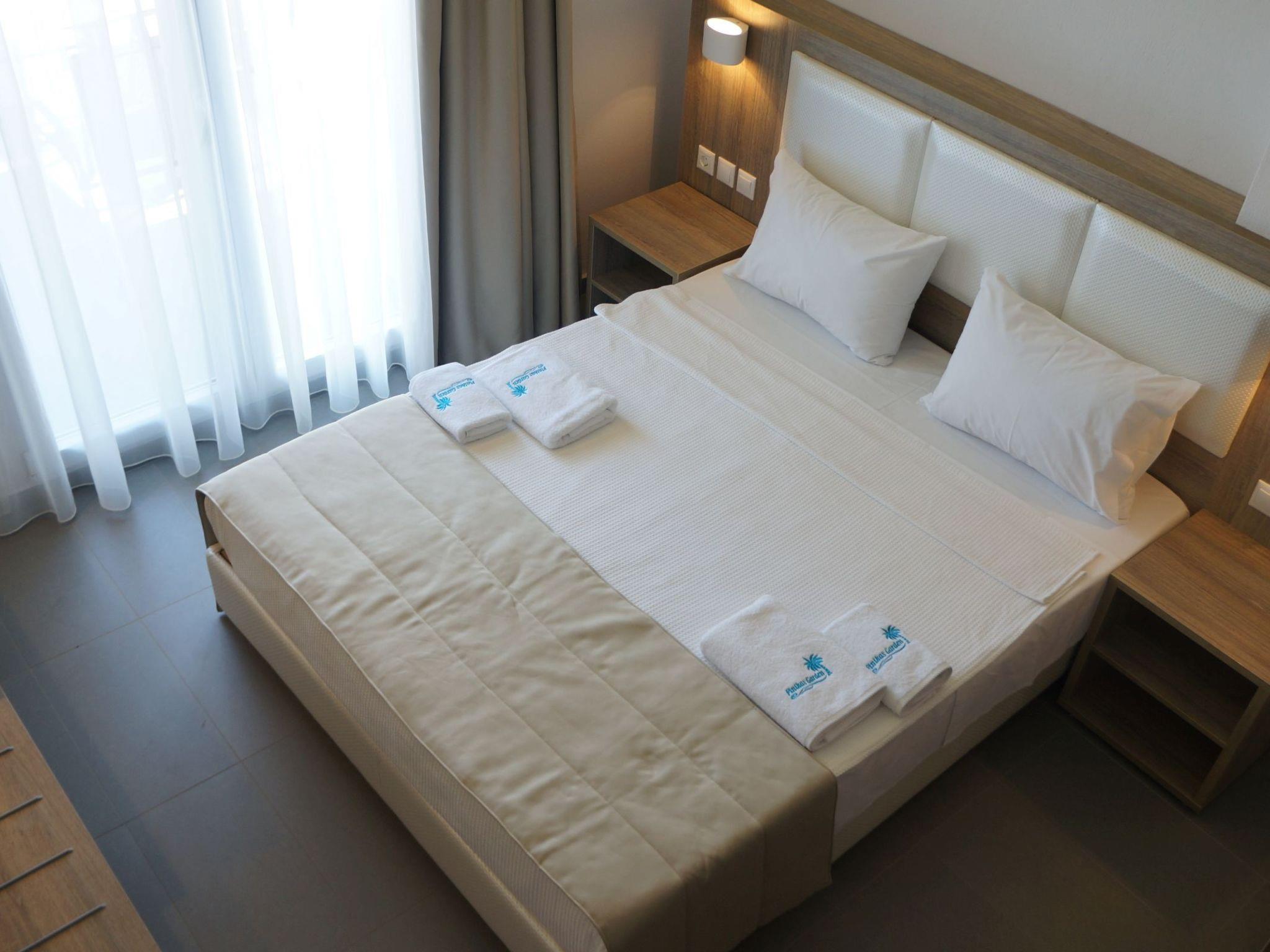 Family flat with shared swimming pool and children's playground In the middle of a green oasis, quietly located in Nikiti Beach, Sithonia, Chalkidiki are the flats with palm garden, swimming pool with baby pool, children's playground and private parking. The beach is 150 metres away. The marina is 600 metres away, as are tavernas, supermarkets, cafes, boutiques and all the entertainment you need. The flats are family-friendly and are located away from the main traffic, yet within easy reach of the main road.