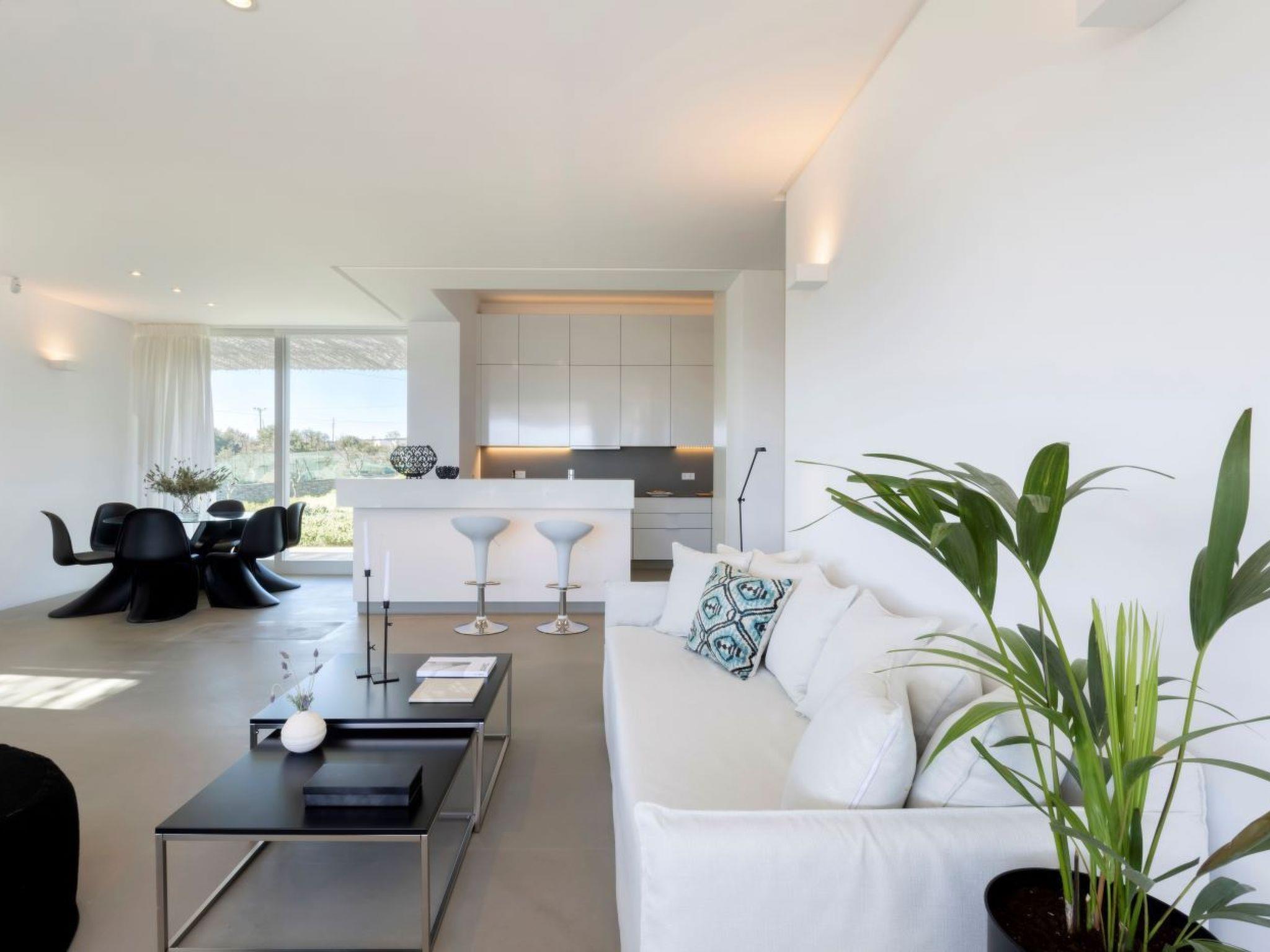 The villa's exterior is equally impressive, showcasing a stunning infinity pool as its centerpiece. A private staircase leads guests to an exclusive top-floor outdoor lounge, outfitted with sunbeds for supreme privacy and relaxation. Here, guests can indulge in the panoramic views of Santa Maria beach and its environs, soaking up the sun or enjoying the tranquil ambiance under the stars.