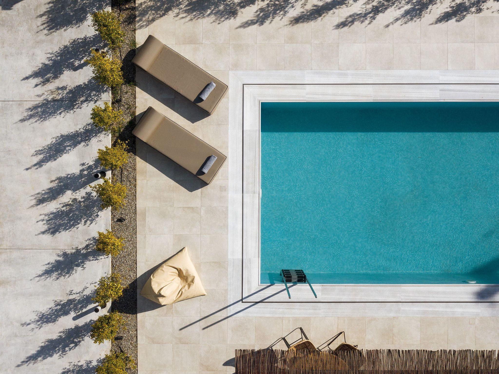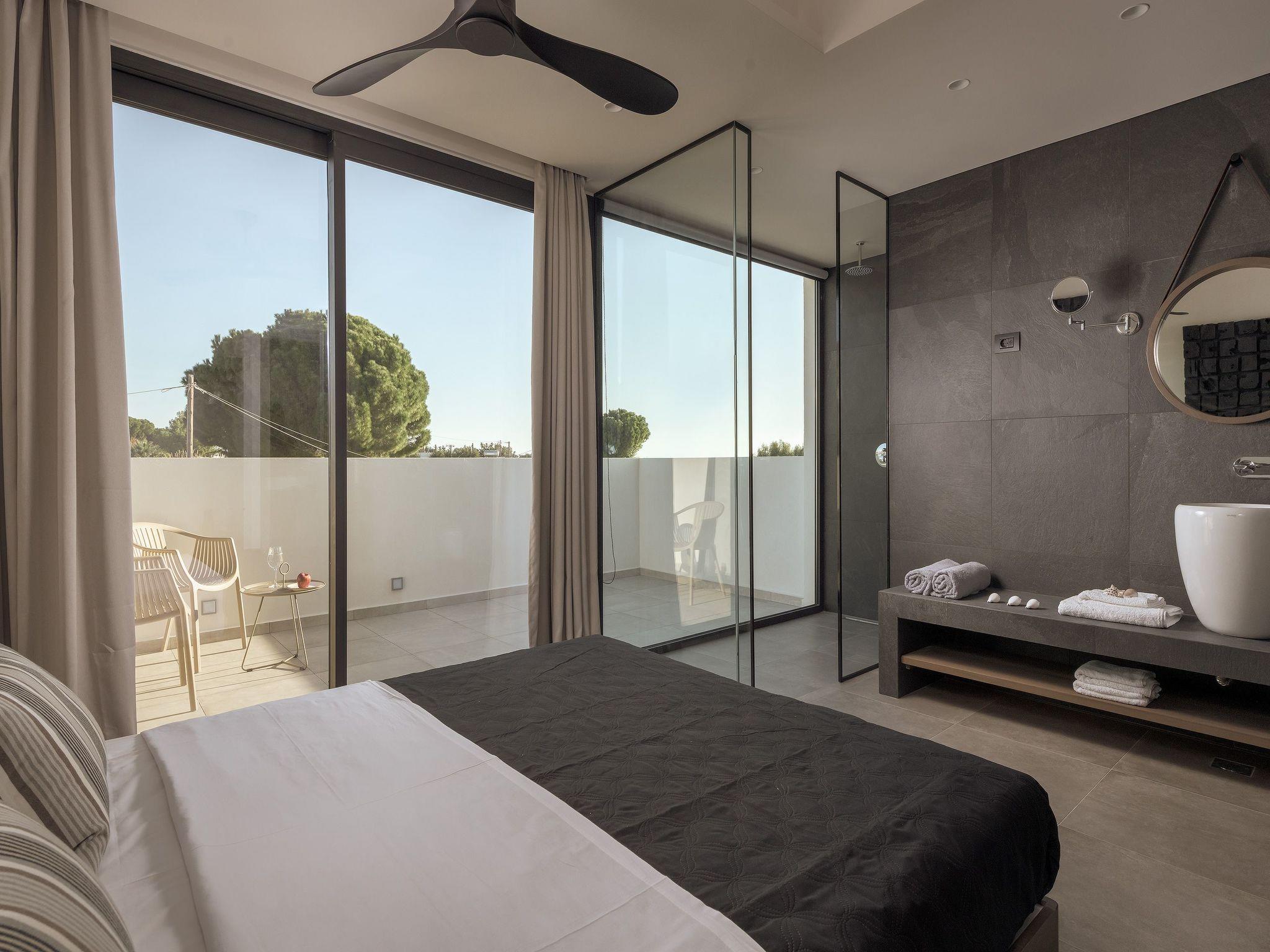 Eva Villa features 3 wonderful bedrooms with ensuite bathrooms and beautiful balconies, some of them offer a sea view. Two of the bedrooms have double beds and the other one has 2 single beds, all of them are fully air-conditioned. The modern living room, along with a siting area, combines luxurious comforts with a clear sense of home. The care that was put to the design of the property was meant to create a welcoming ambience with a warm modern décor. The classy kitchen is fully equipped with every amenity you may need and is complimented by the BBQ facility outside, for you to indulge in culinary. Guests can enjoy free Wi-Fi access throughout the property. Outdoors, you will find the amazing private swimming pool along with its stylish sunbeds. There, you can enjoy the summer sun; without doubt you’ll get the island feeling. The surrounding of the tastefully designed pool is quite pleasant, with a sitting area allowing you to enjoy any meal with your loved ones.