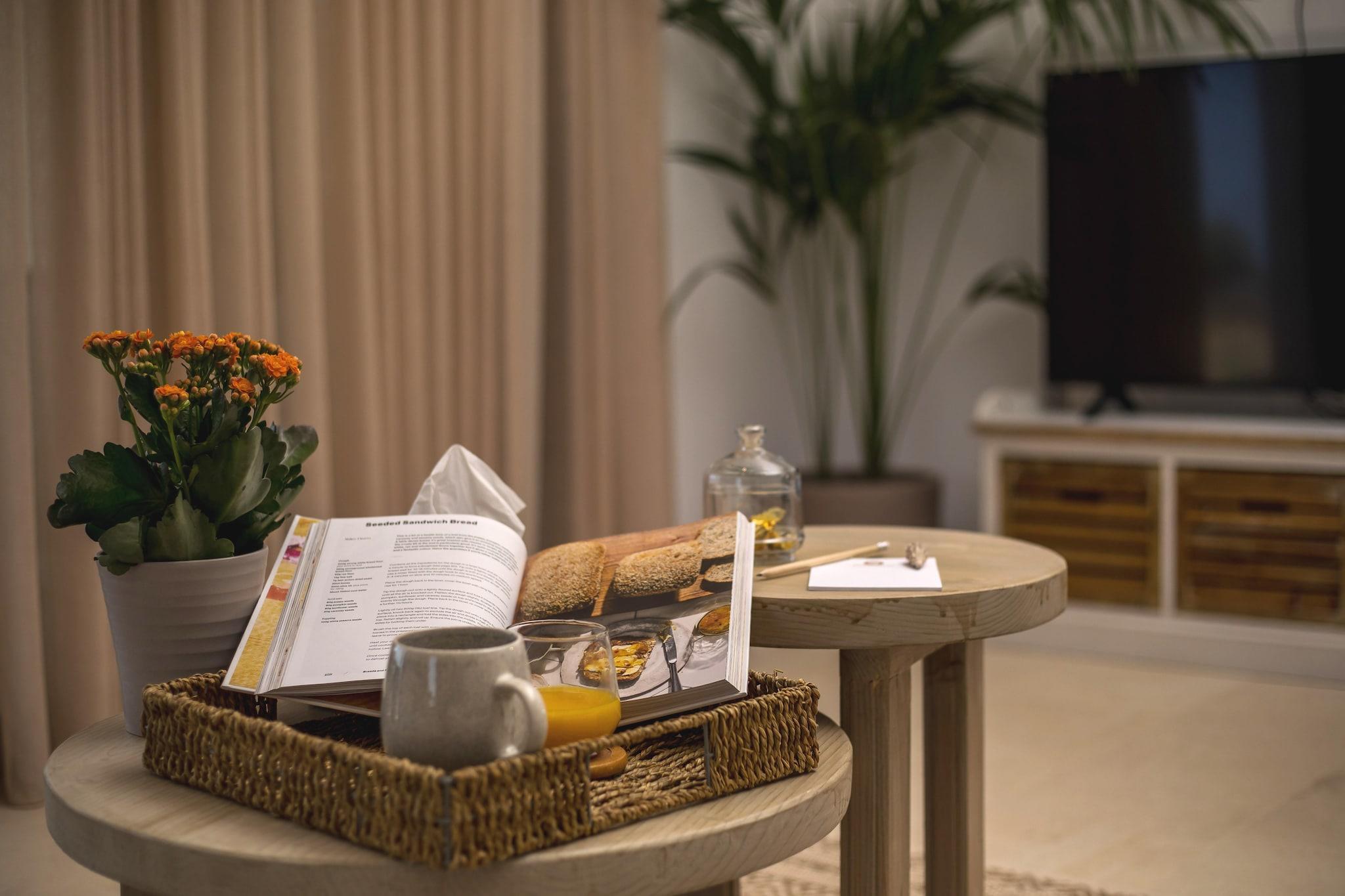 Køkken(kogeplade, elkedel, brødrister, kaffemaskine(espresso, kaffetragt), ovn, mikrobølgeovn, opvaskemaskine , køle-fryseskab, Blender, Stavblender, , ), stue / spisestue(Fjernsyn(fladskærm), spisebord, sofahjørne), soveværelse(dobbeltseng), soveværelse(king size-seng), badeværelse(bruser, håndvask, toilet), Internetadgang, tremmeseng, patio, klimaanlæg, havemøbler, grill, parkering