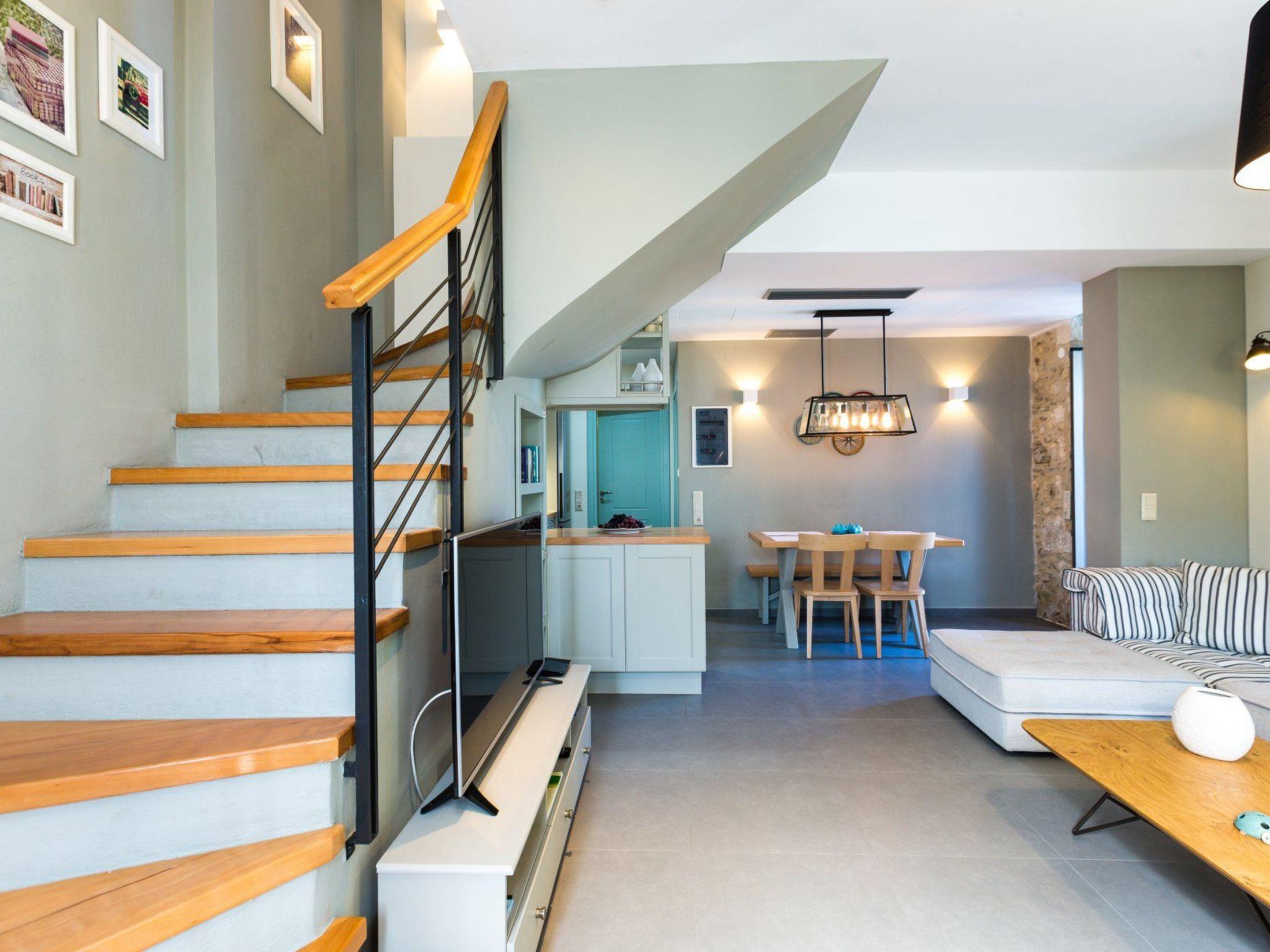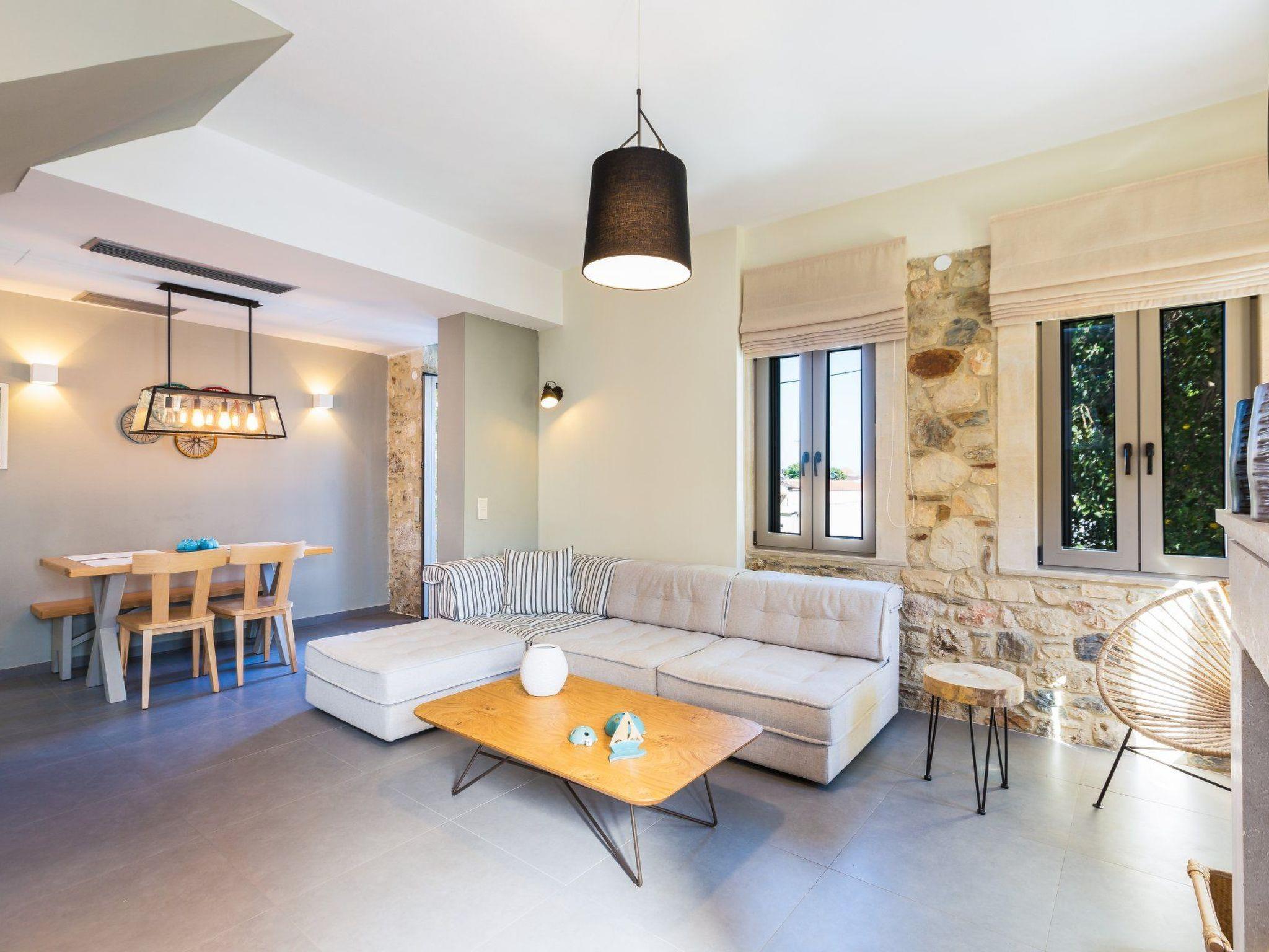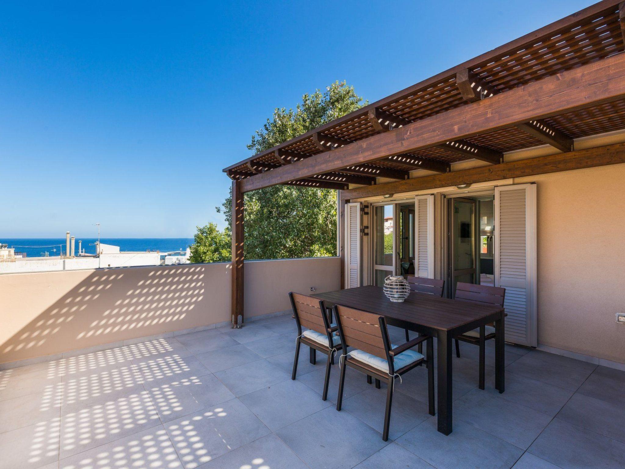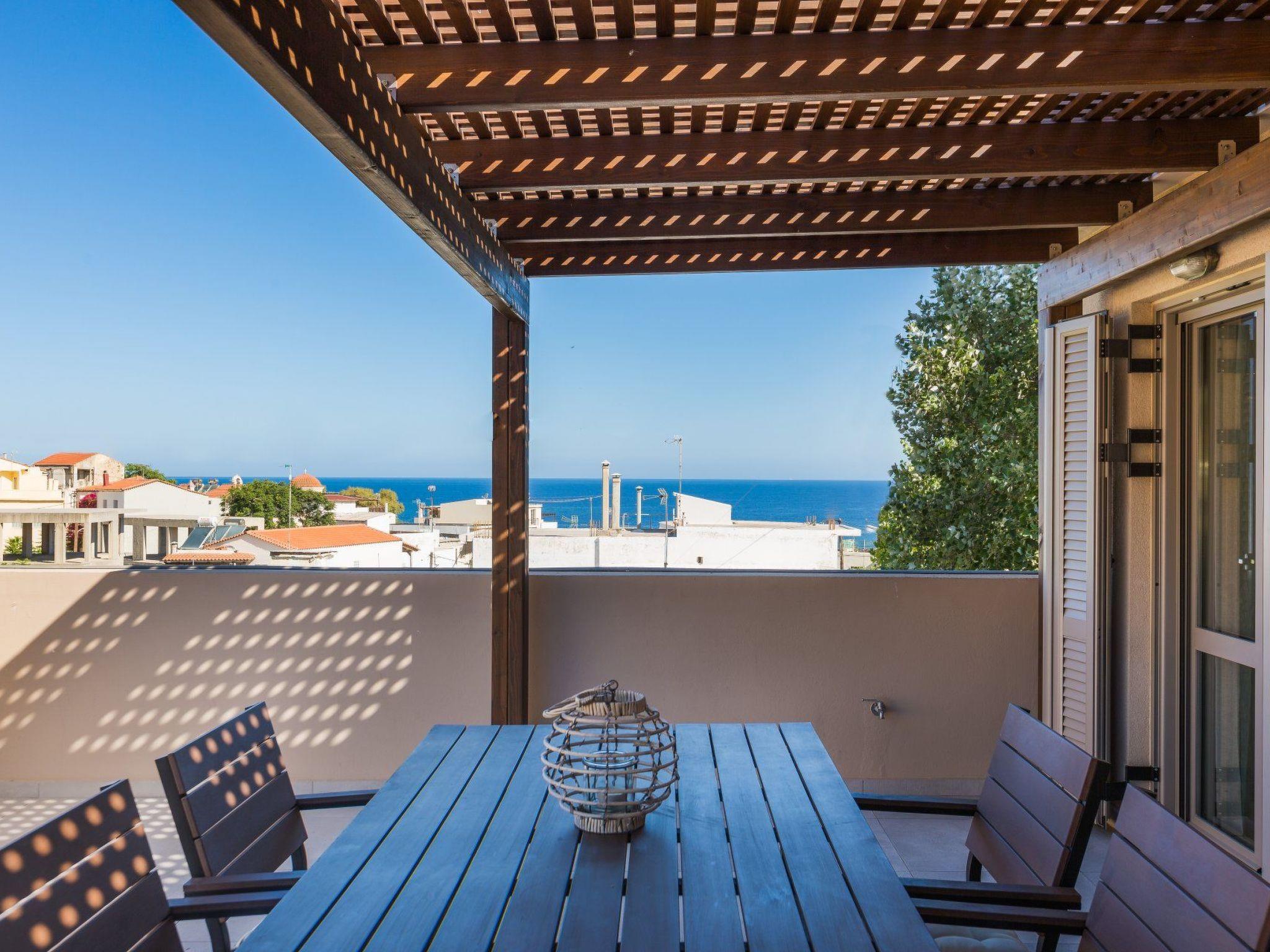 At the upper level there is one master bedroom with a large double bed and one more bathroom with bathtub. The upper level gives you access to a beautiful terrace with amazing sea view. The terrace is equipped with a large dinning outdoor table with chairs and a wooden pergola offering relaxing moments under the Cretan sky.
