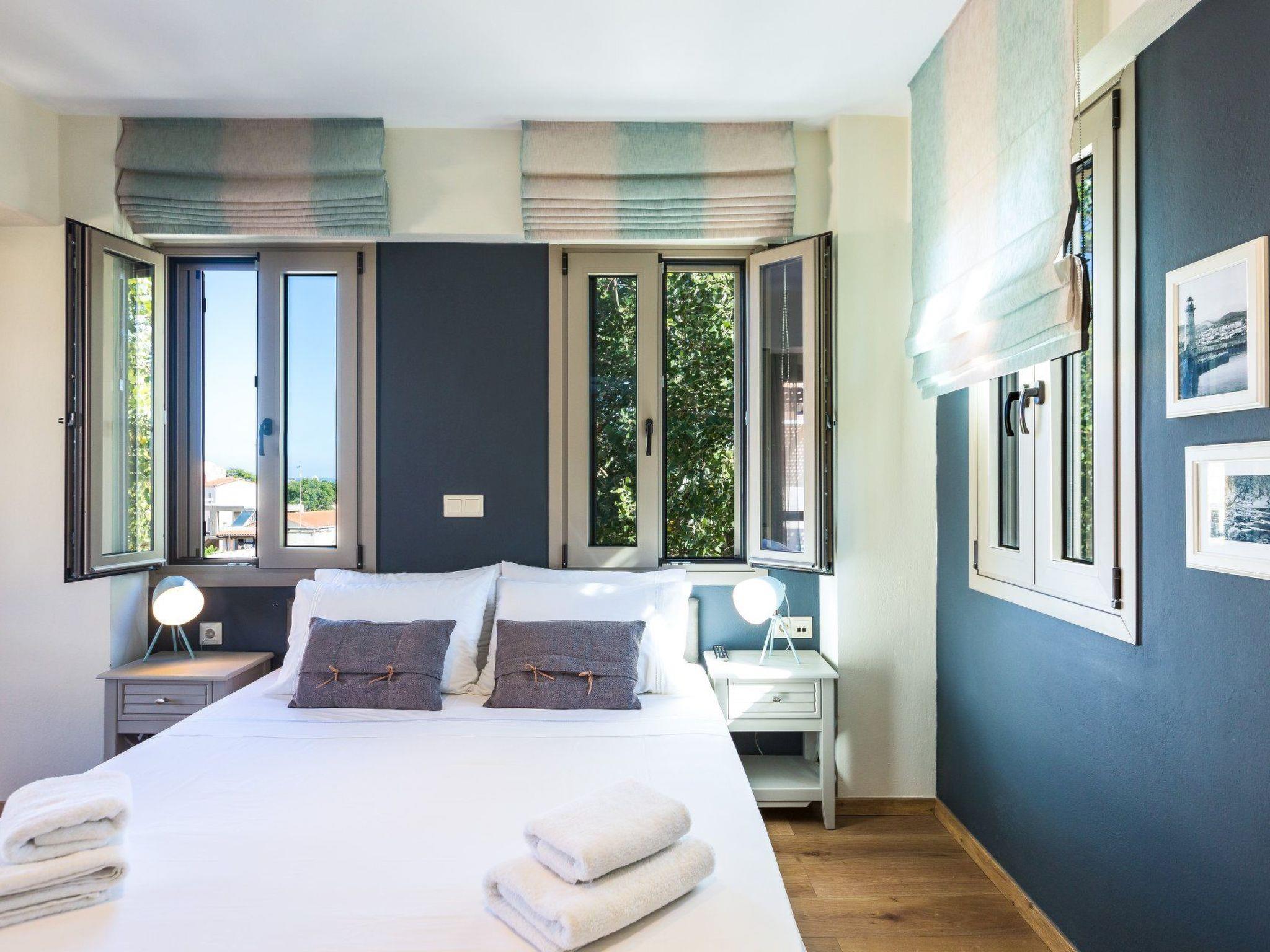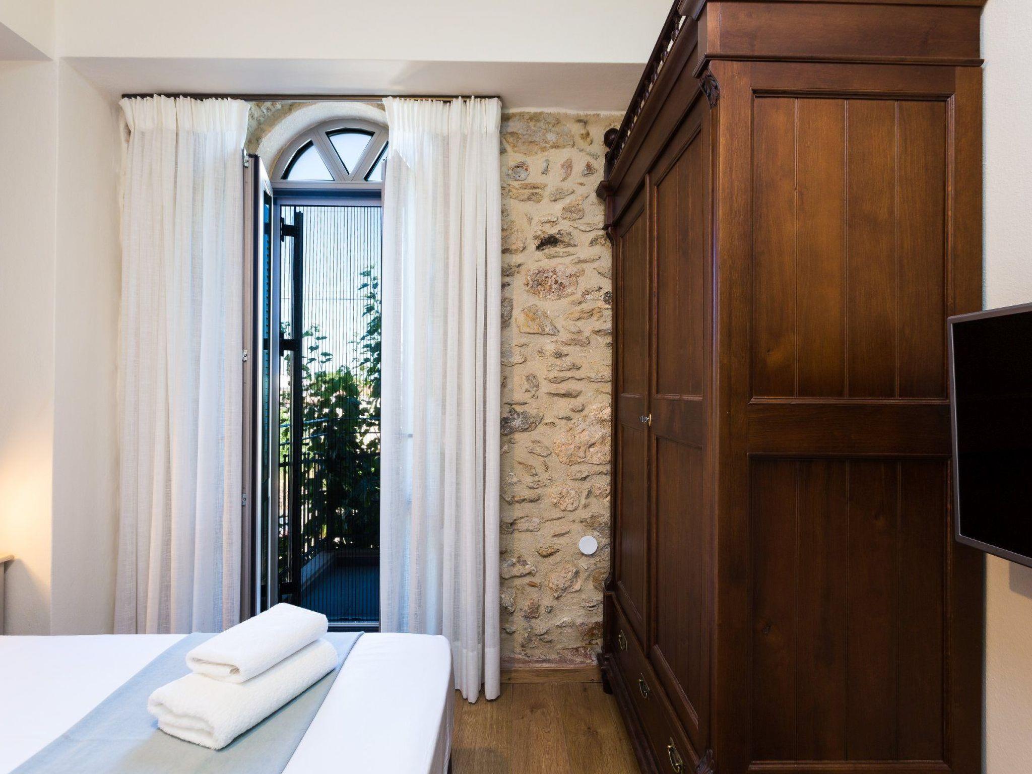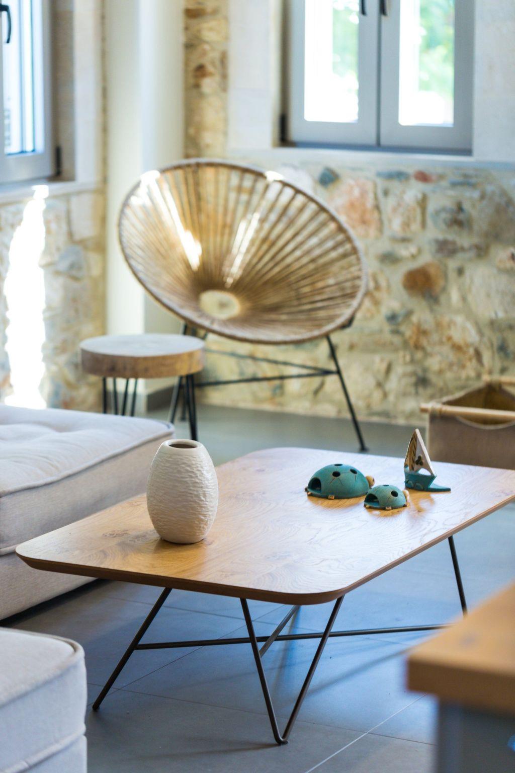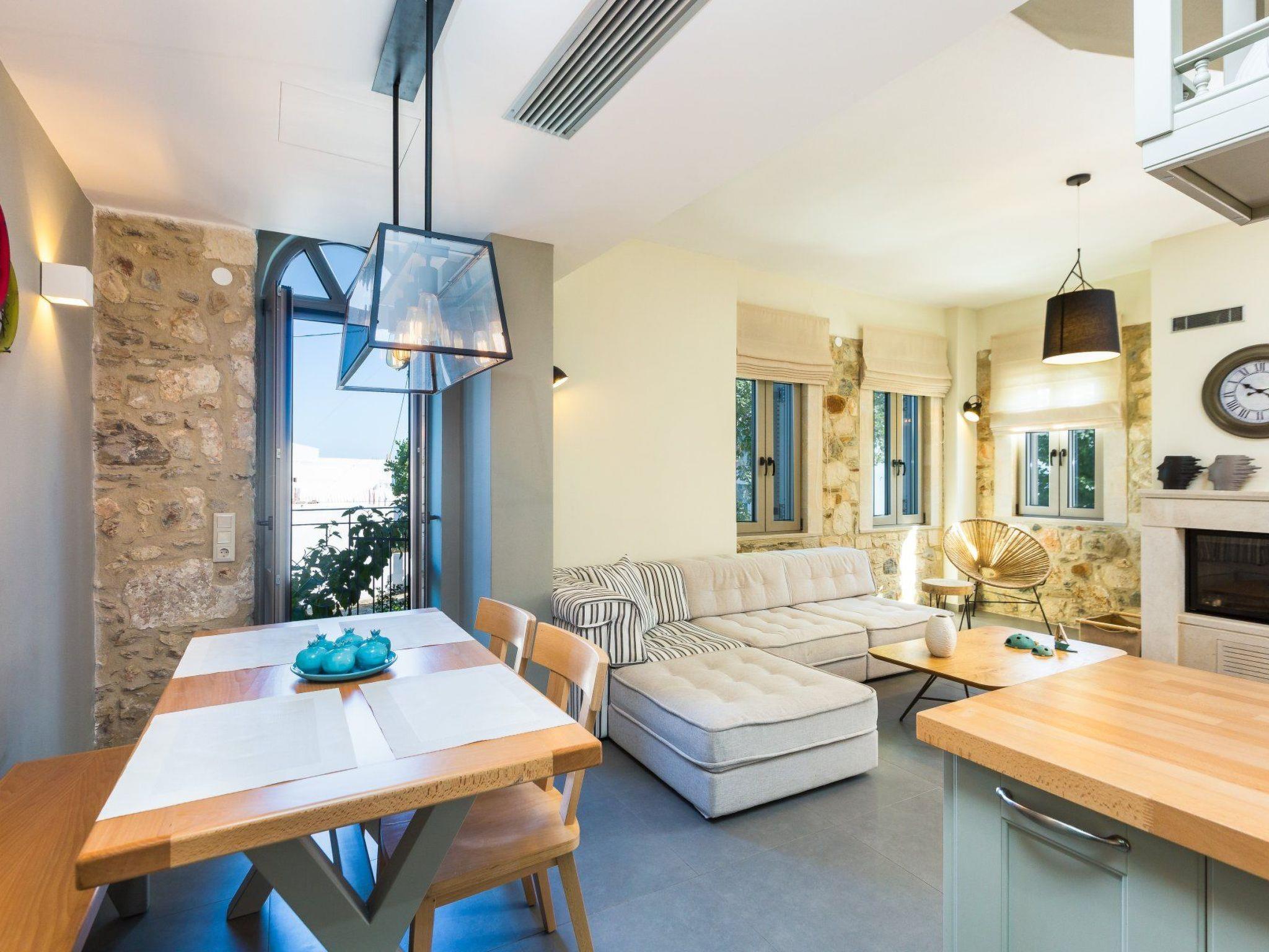 At the upper level there is one master bedroom with a large double bed and one more bathroom with bathtub. The upper level gives you access to a beautiful terrace with amazing sea view. The terrace is equipped with a large dinning outdoor table with chairs and a wooden pergola offering relaxing moments under the Cretan sky.