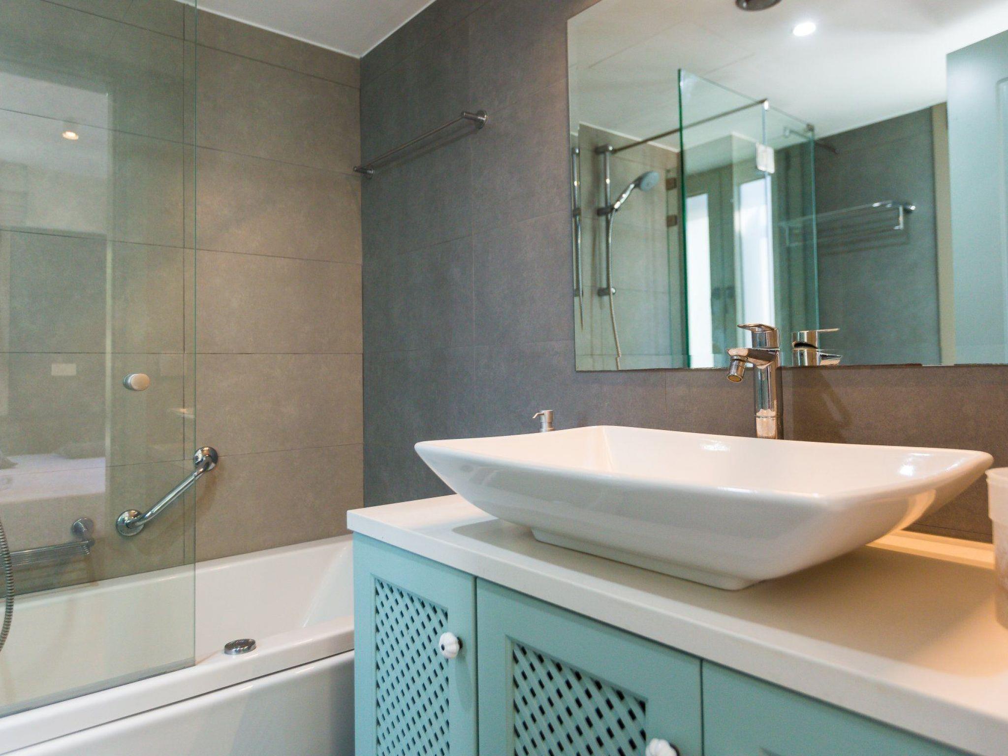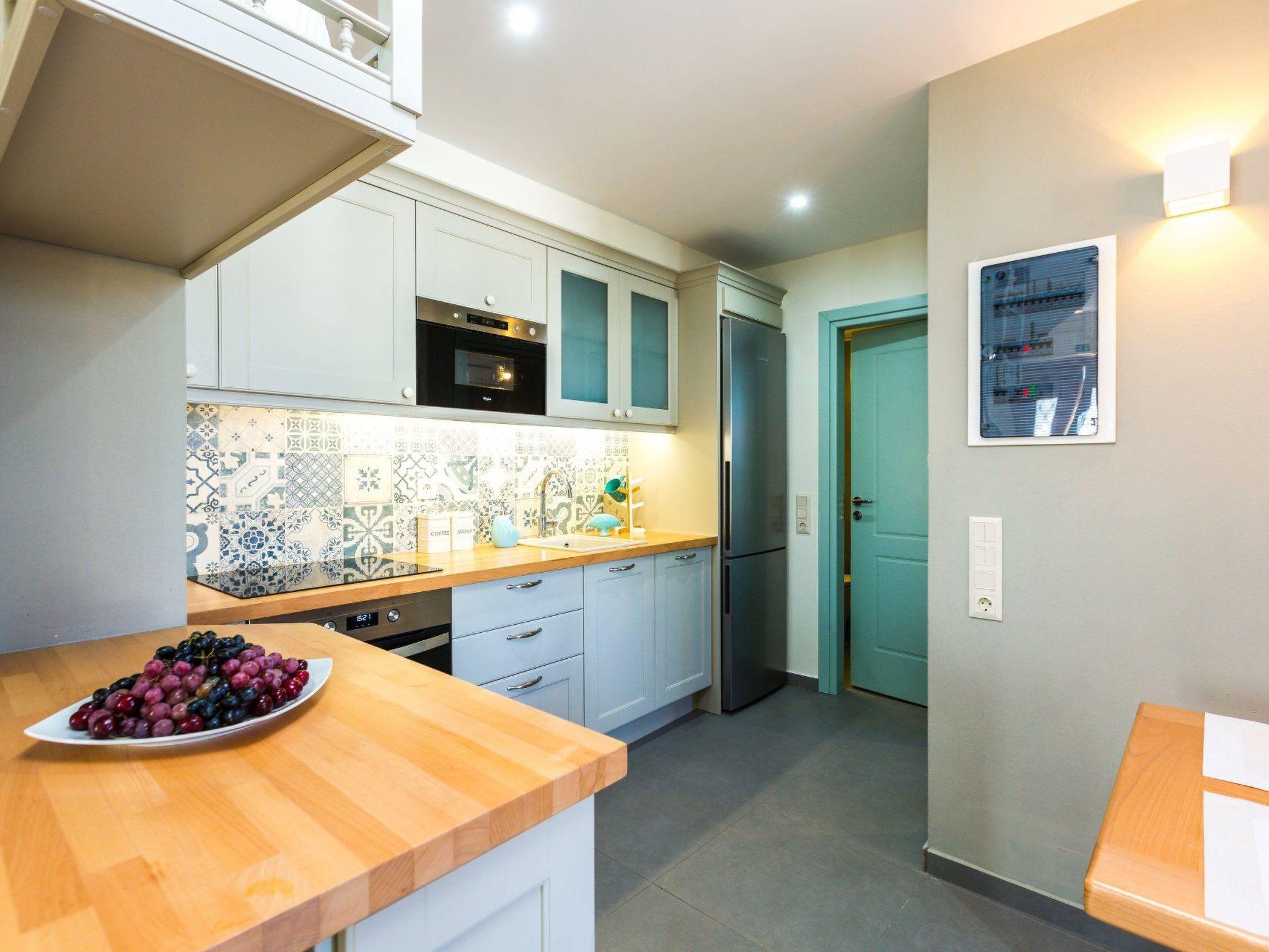 At the lower level there is one bedroom with two single beds and a bathroom with shower. You can also find an open-plan space featuring a large kitchen area with all the necessary electric appliances and a living room with three-seated sofa (could be used to accommodate one person), armchair and fireplace. Kitchen is fully equipped with all the necessary facilities, and a large satellite TV is placed at the living room area. Last but not least, the lower level gives you access to a lovely balcony overlooking the Panormo village, and equipped with a table and two chairs.