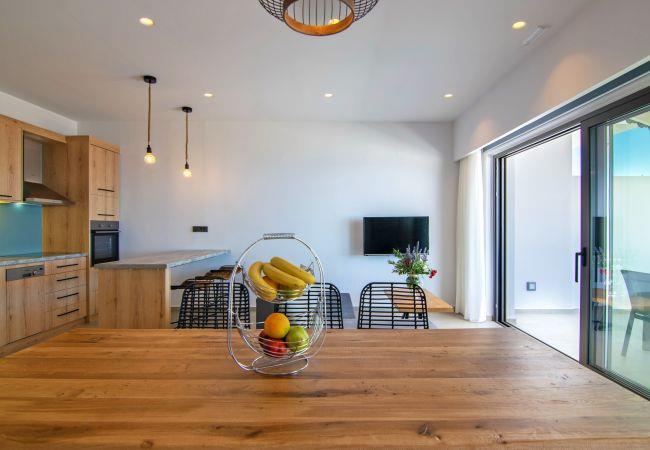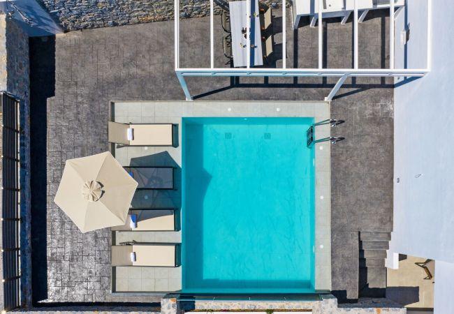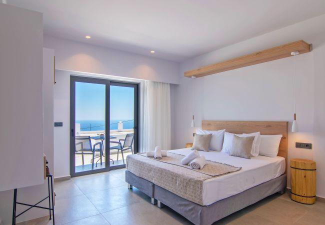 Petasos Villa has a total area of 80 sqm and features 2 bedrooms and 2 bathrooms. On the ground floor, there is a double bedroom with twin beds that can be converted into a double bed, along with an en-suite bathroom with a spacious shower and WC. Additionally, you'll find a beautiful open-plan living and dining area that connects to a fully equipped modern kitchen. This level features large French windows that lead to a spacious veranda with patio furniture, offering marvelous views of the Libyan Sea and the surrounding area. An internal staircase leads to the upper floor, where you'll discover the second bedroom and a spacious shower/WC.