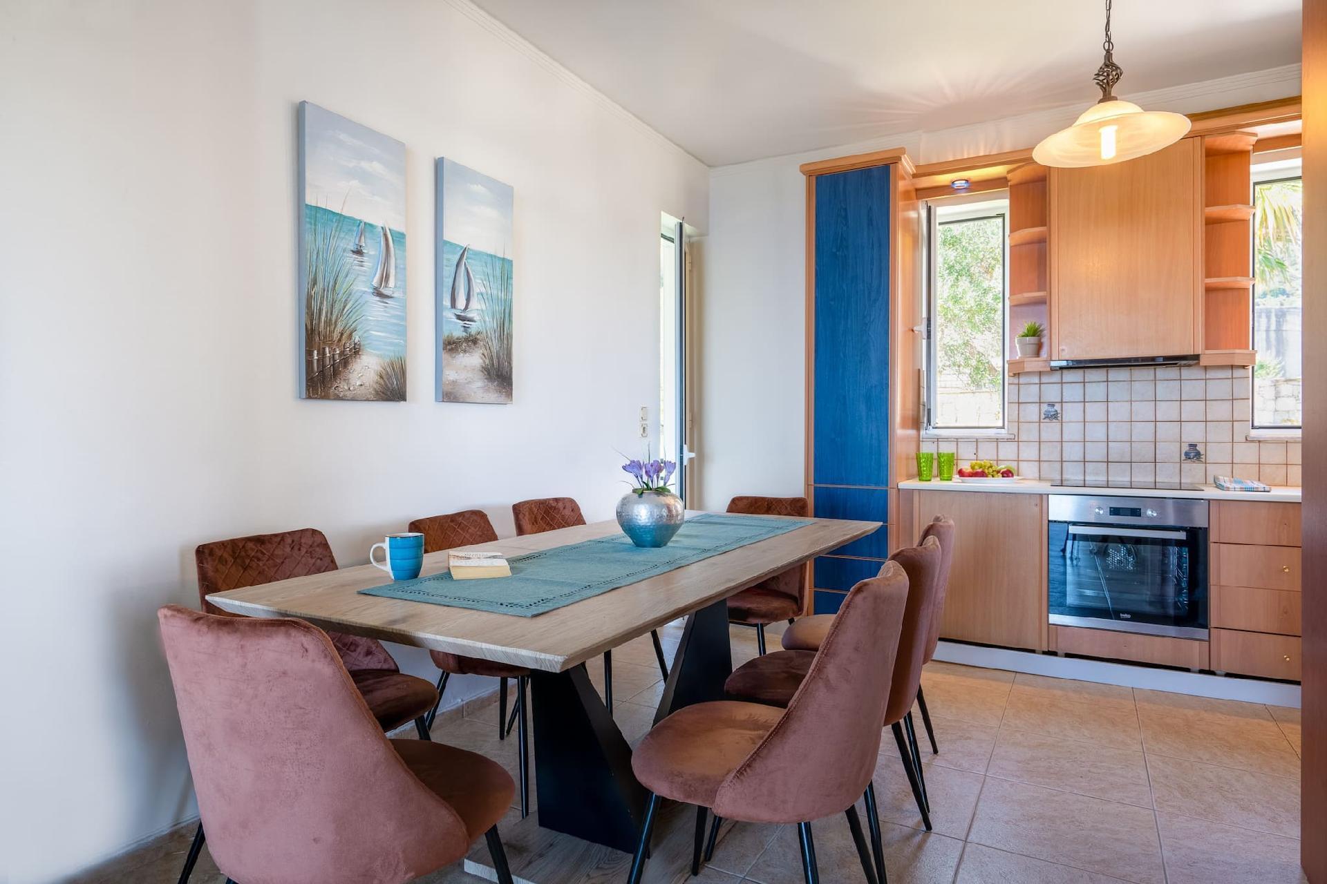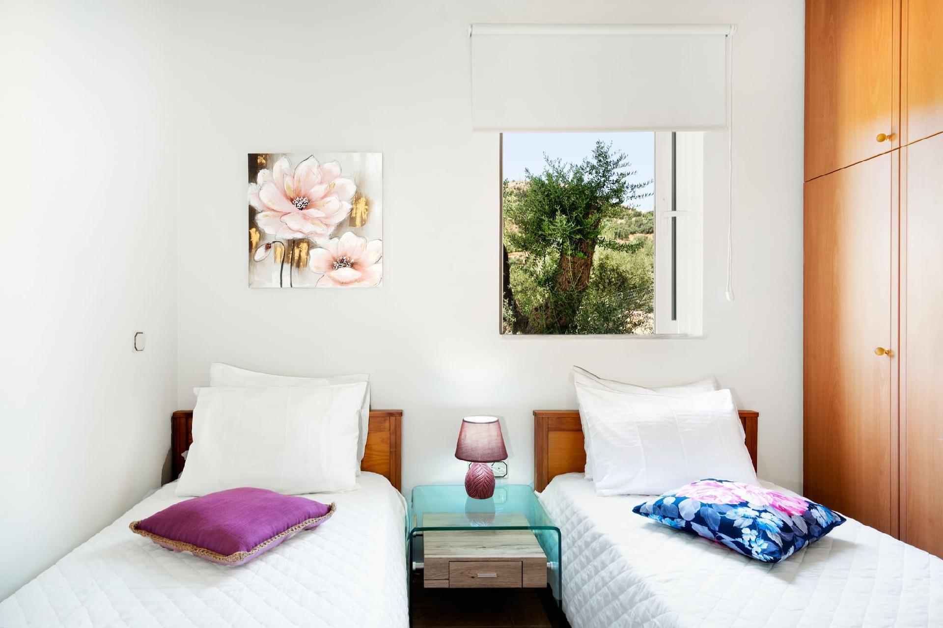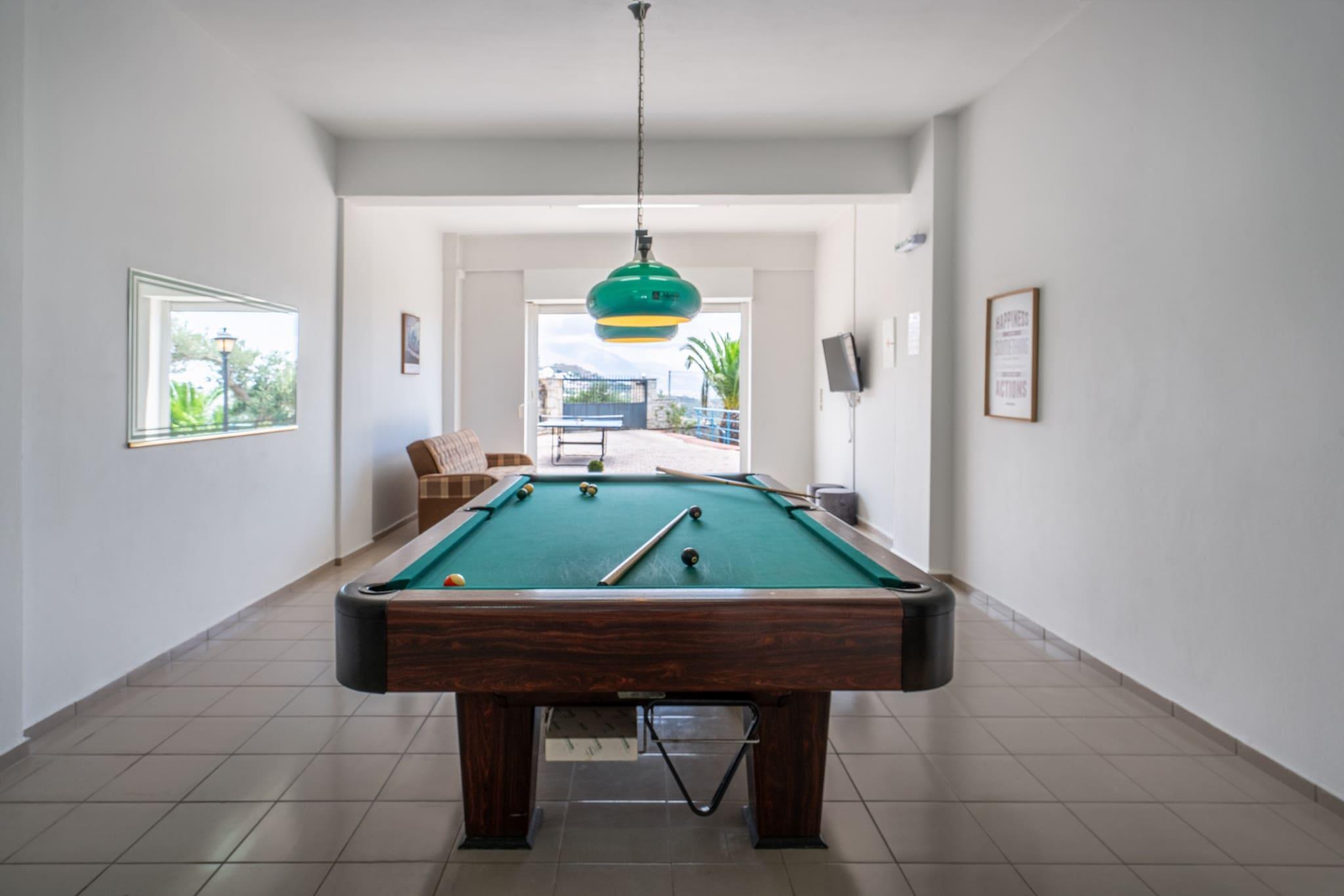 Villa's Evenos building consists of two independent apartments with seperate entrance. This can be the ideal for two families who want to be together, but at the same time enjoy their own privacy or groups who want to secure more autonomy. Starting from the ground floor, one can find a spacious and cozy open plan living room and a well equiped kitchen (oven, stove, microwave, kettle, fridge, filter coffee machine, toaster, blender etc.) where you can prepare all of your favourite meals. Moving further, you get two see 2 bedrooms, one of them consisting a double bed, while the second consists two twin beds. There is a full bathroom with a shower in this fisrt apartment as well. On your right side, a playroom is placed, featuring a pool table, a comfortable sofa, a flat satelite Tv and a Wc.