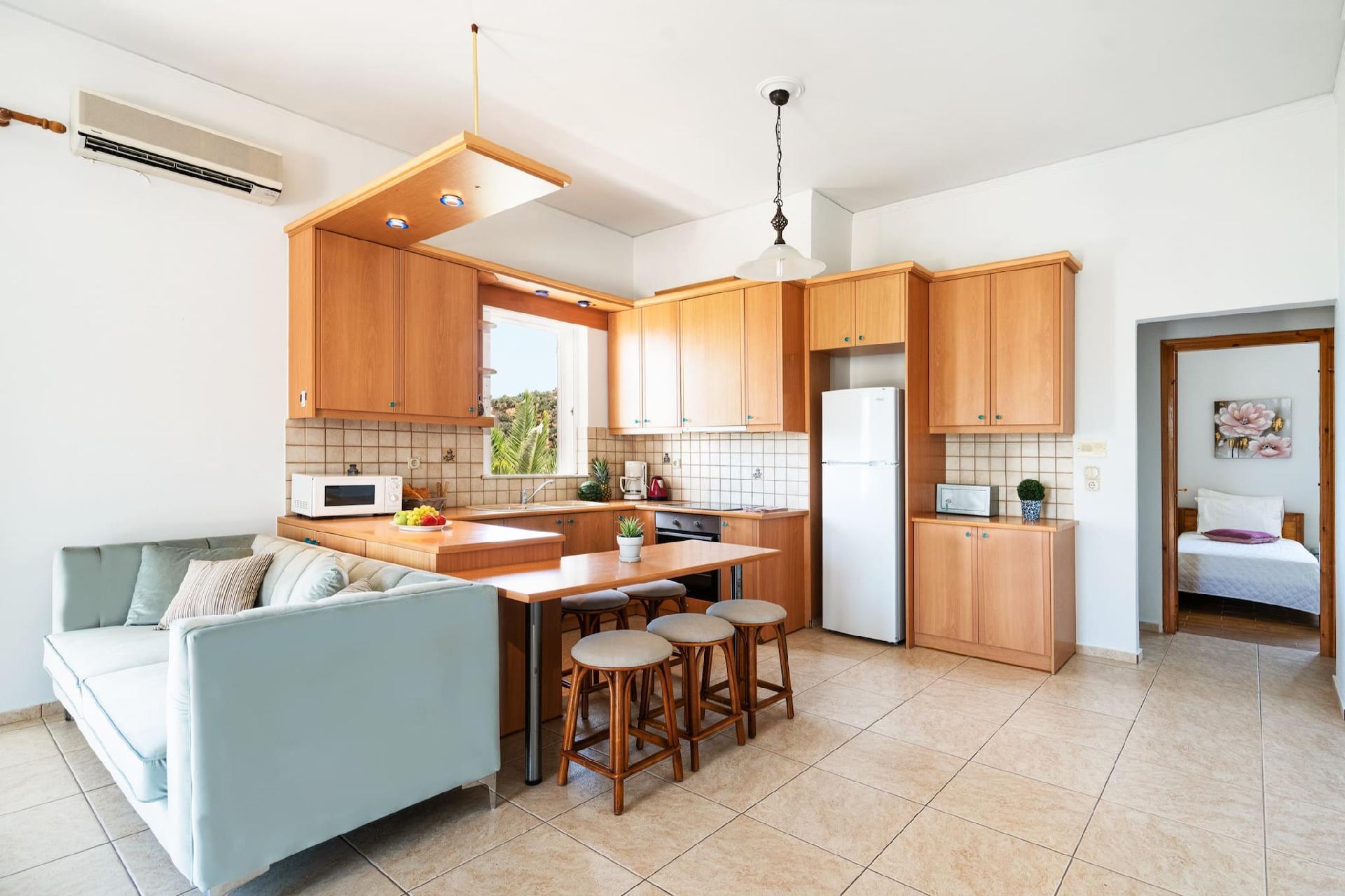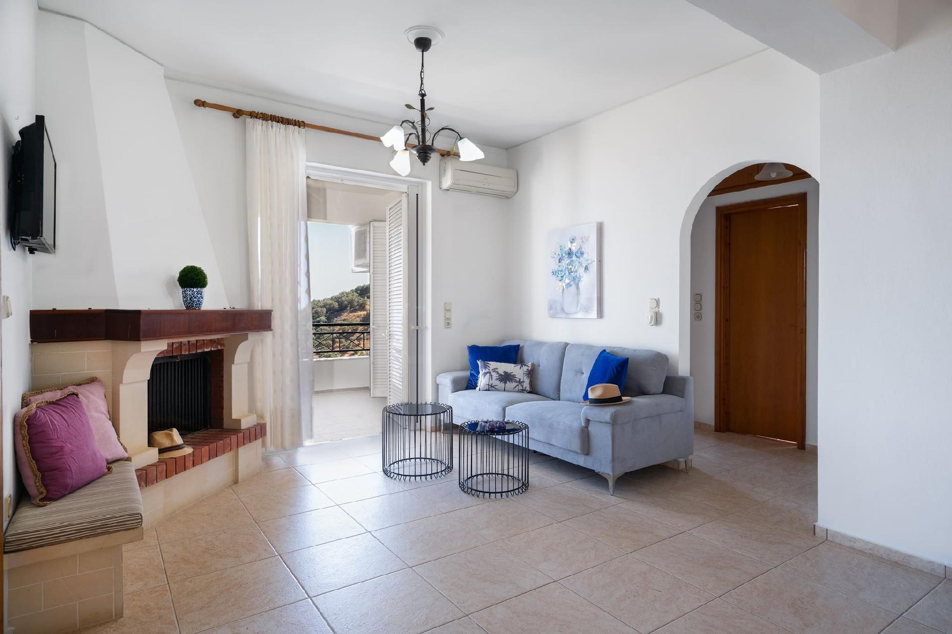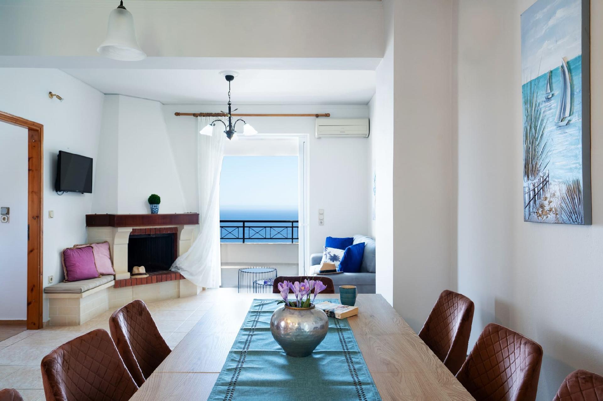 Moving on the upper apartment, you face a corner well equipped kitchen, a dinner table and a well appointed living room,with access to a balcony. Upper's floor seaviews are just impeccable! Three more bedrooms are placed there, one featuring a adouble bed, while the two others feature 2 single beds. Last there is one more full bathroom with a shower there.