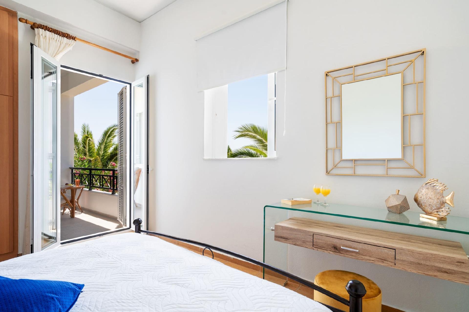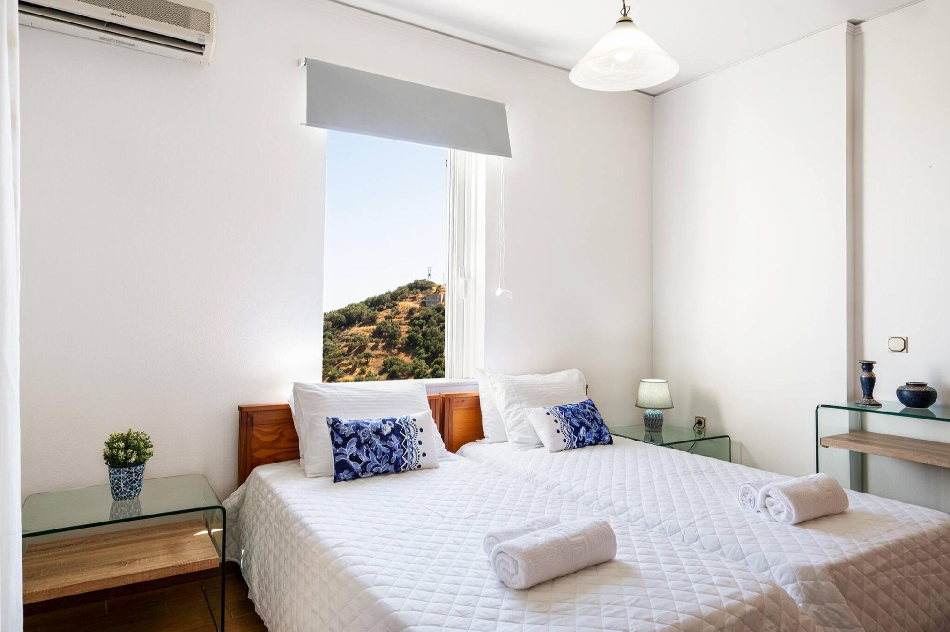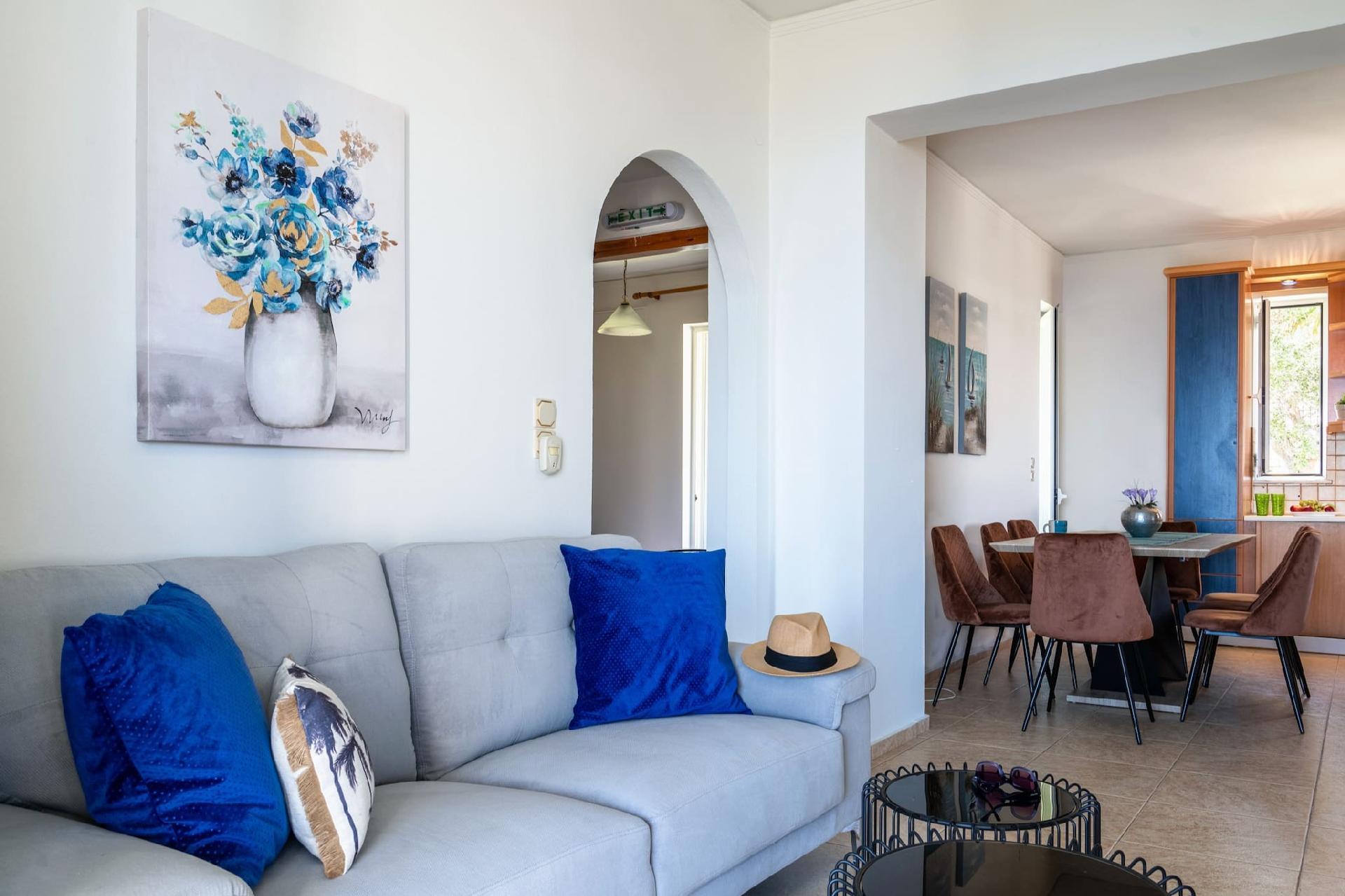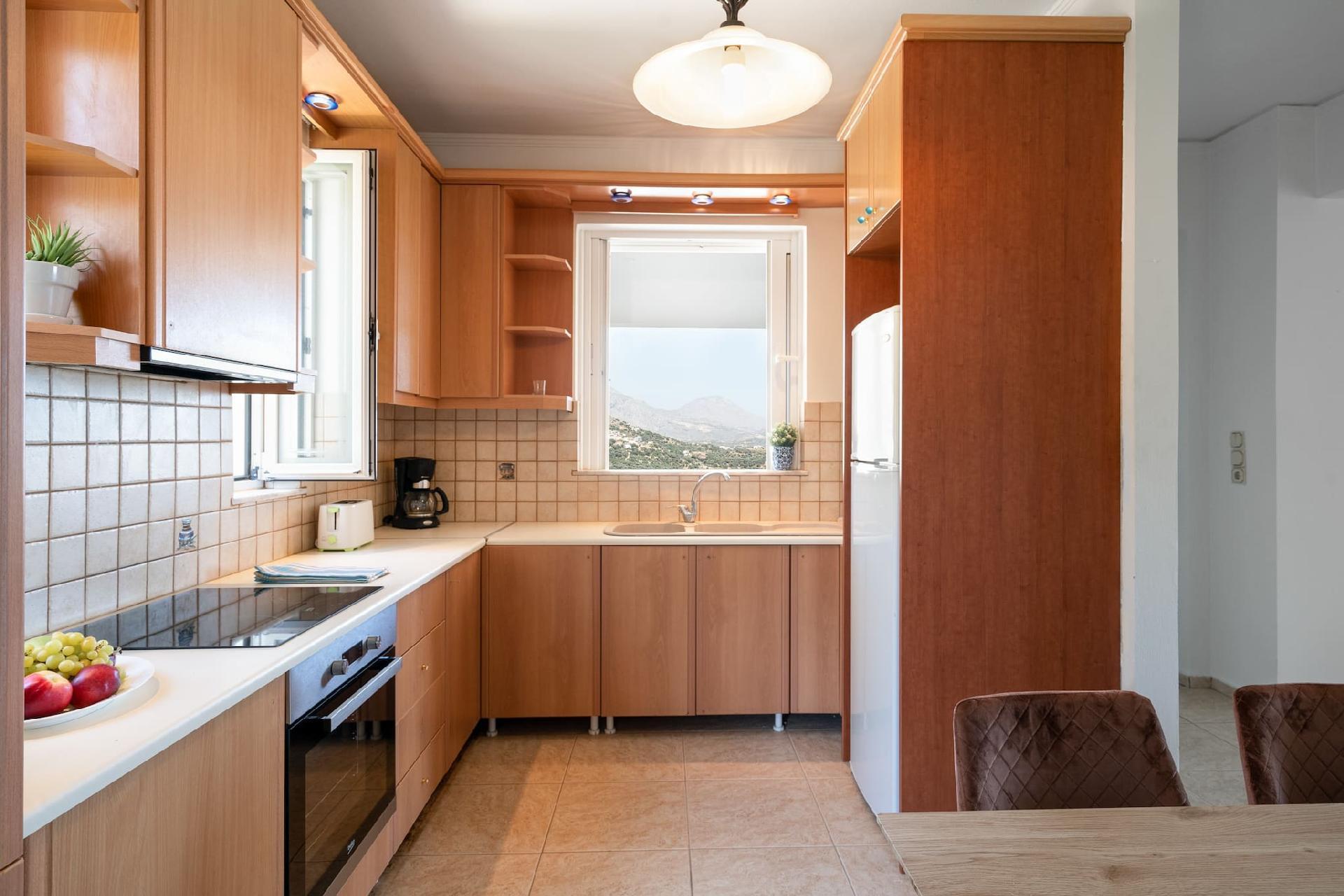 Moving on the upper apartment, you face a corner well equipped kitchen, a dinner table and a well appointed living room,with access to a balcony. Upper's floor seaviews are just impeccable! Three more bedrooms are placed there, one featuring a adouble bed, while the two others feature 2 single beds. Last there is one more full bathroom with a shower there.
