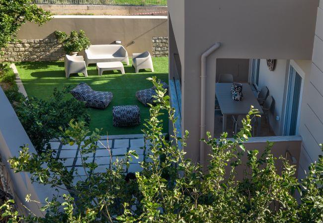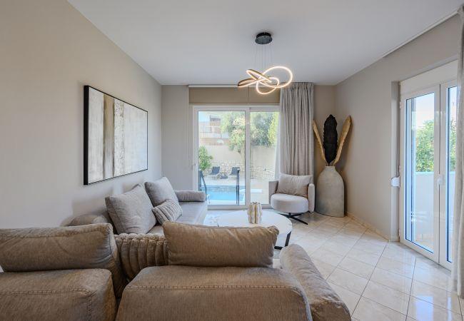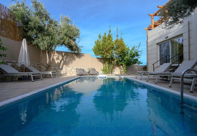 The villa’s outdoor spaces are designed to make the most of Crete’s natural beauty. At the center is a private pool, surrounded by sun loungers and umbrellas, perfect for basking in the Mediterranean sun. The pool area is beautifully lit at night, creating an enchanting setting for evening swims or relaxed gatherings.Balconies and terraces throughout the property offer seating areas with panoramic views of the sea and mountains. The landscaped garden adds charm to the surroundings, while a dedicated outdoor dining area invites guests to enjoy al fresco meals under the stars.