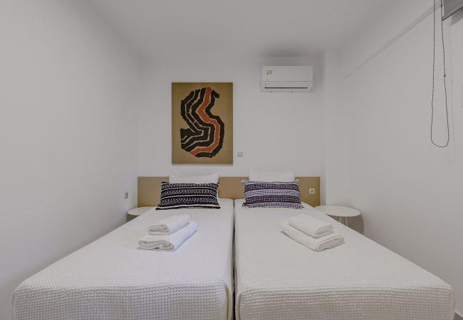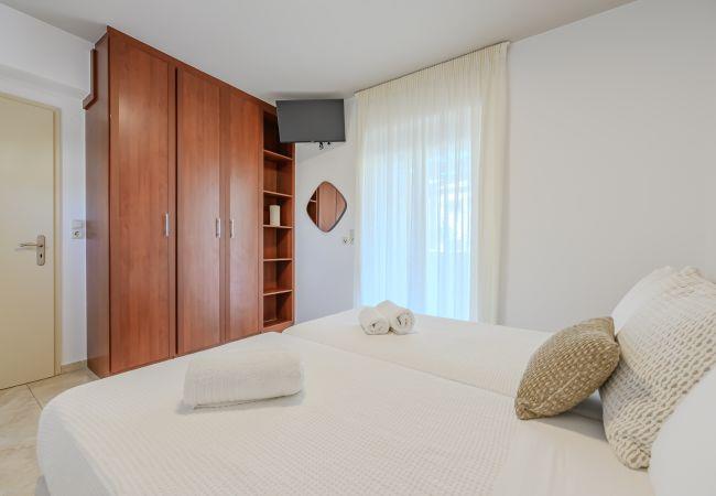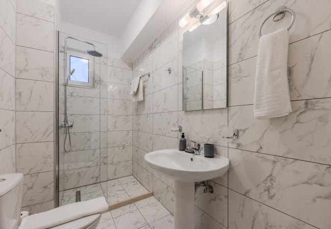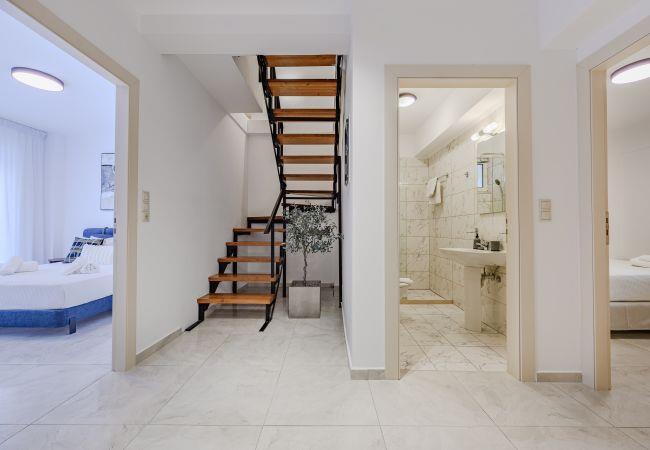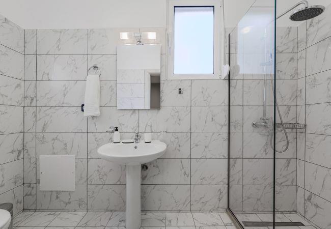 The first floor offers a variety of sleeping arrangements to suit all guests. The master bedroom is a highlight, featuring a double bed, an en-suite bathroom with a walk-in shower, and access to a shared balcony with stunning sea and mountain views.A second bedroom has two single beds, which can be converted into a double bed, and also shares the balcony with the master bedroom. The third bedroom on this floor includes a double bed and a private balcony overlooking the sea, offering a tranquil retreat.A shared bathroom with a bathtub serves the second and third bedrooms, providing a luxurious and functional space for relaxation.
