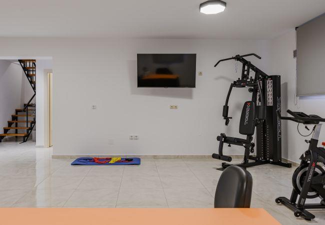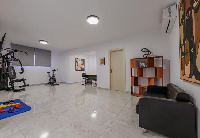 The villa has a three storey layout connected through an internal staircase. The lower level of the villa is thoughtfully designed for both activity and relaxation. It features a fully equipped gym, complete with a variety of fitness equipment, and a private office area furnished with a desk, ergonomic chair, printer, and a 55-inch Smart TV, ensuring you can work or unwind as needed.Two bedrooms are located on this floor: one with two single beds that can be converted into a double, and the other with a double bed. These rooms are beautifully styled and provide ample storage space. A shared bathroom with a luxurious bathtub is also on this level, catering to comfort and convenience.