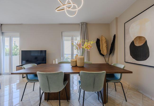The ground-middle floor serves as the social hub of the villa, combining an inviting living space, dining area, and kitchen. The living room features a plush L-shaped sofa, a coffee table, and a 55-inch Smart TV, along with sliding doors that open onto a balcony offering stunning sea views and outdoor seating. Adjacent to the living area is the dining space, which includes a large table that comfortably seats 8 guests. The modern kitchen is fully equipped with premium appliances, such as an oven, stovetop, microwave, dishwasher, refrigerator, Nespresso machine, and filtered coffee maker.This floor also features two bathrooms: one with a bathtub and a separate bedroom with an en-suite bathroom that includes a walk-in shower.