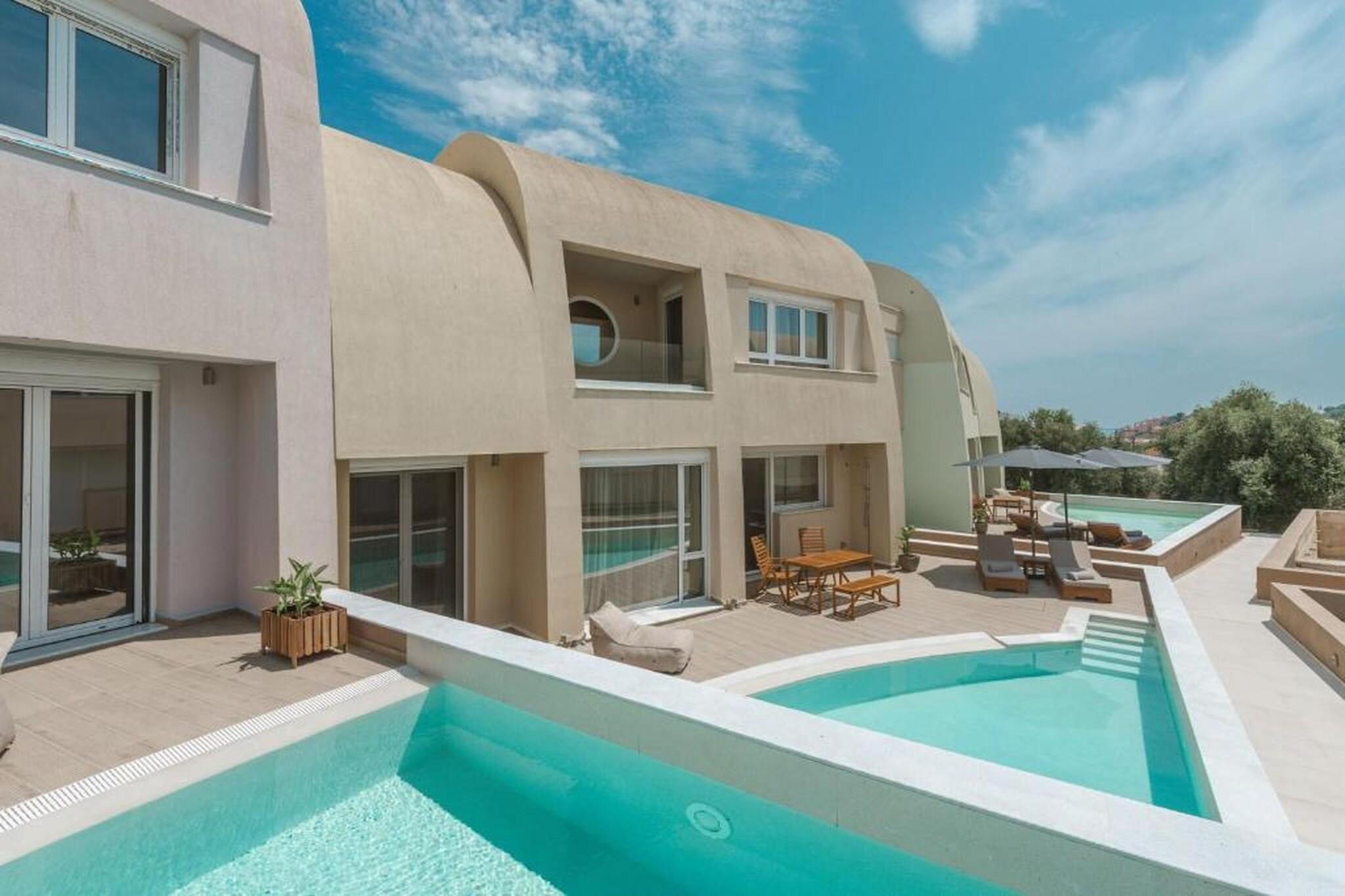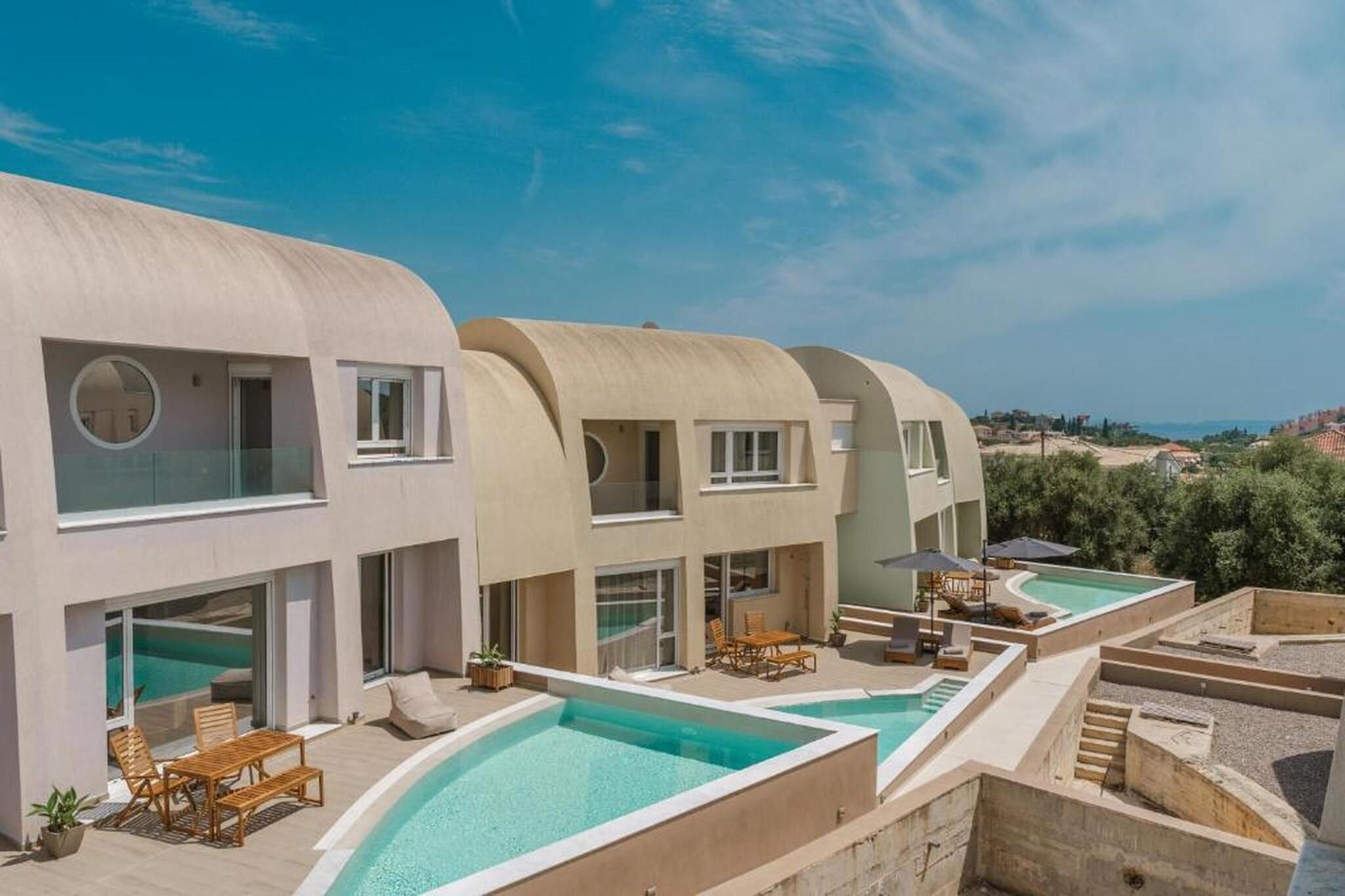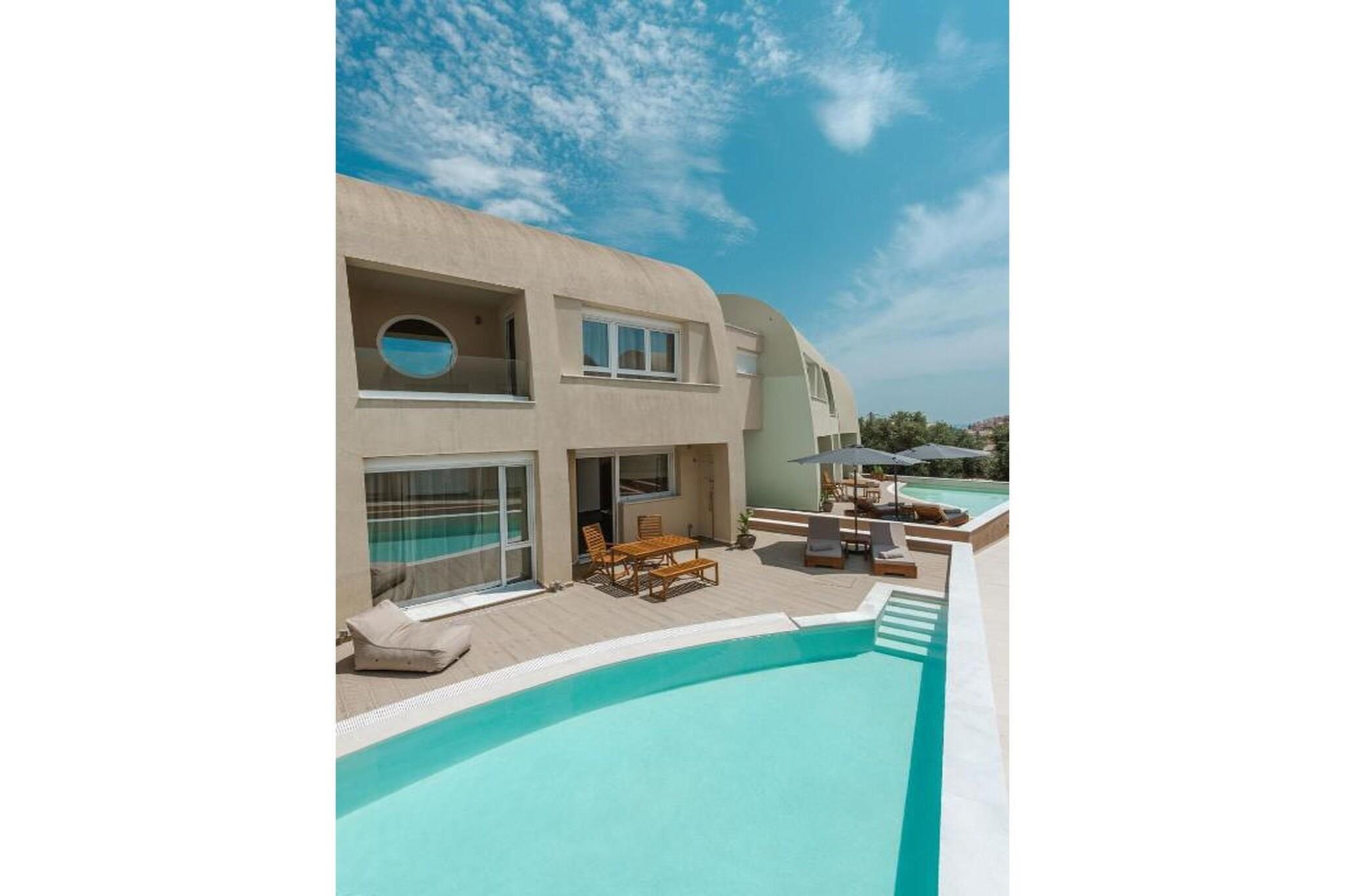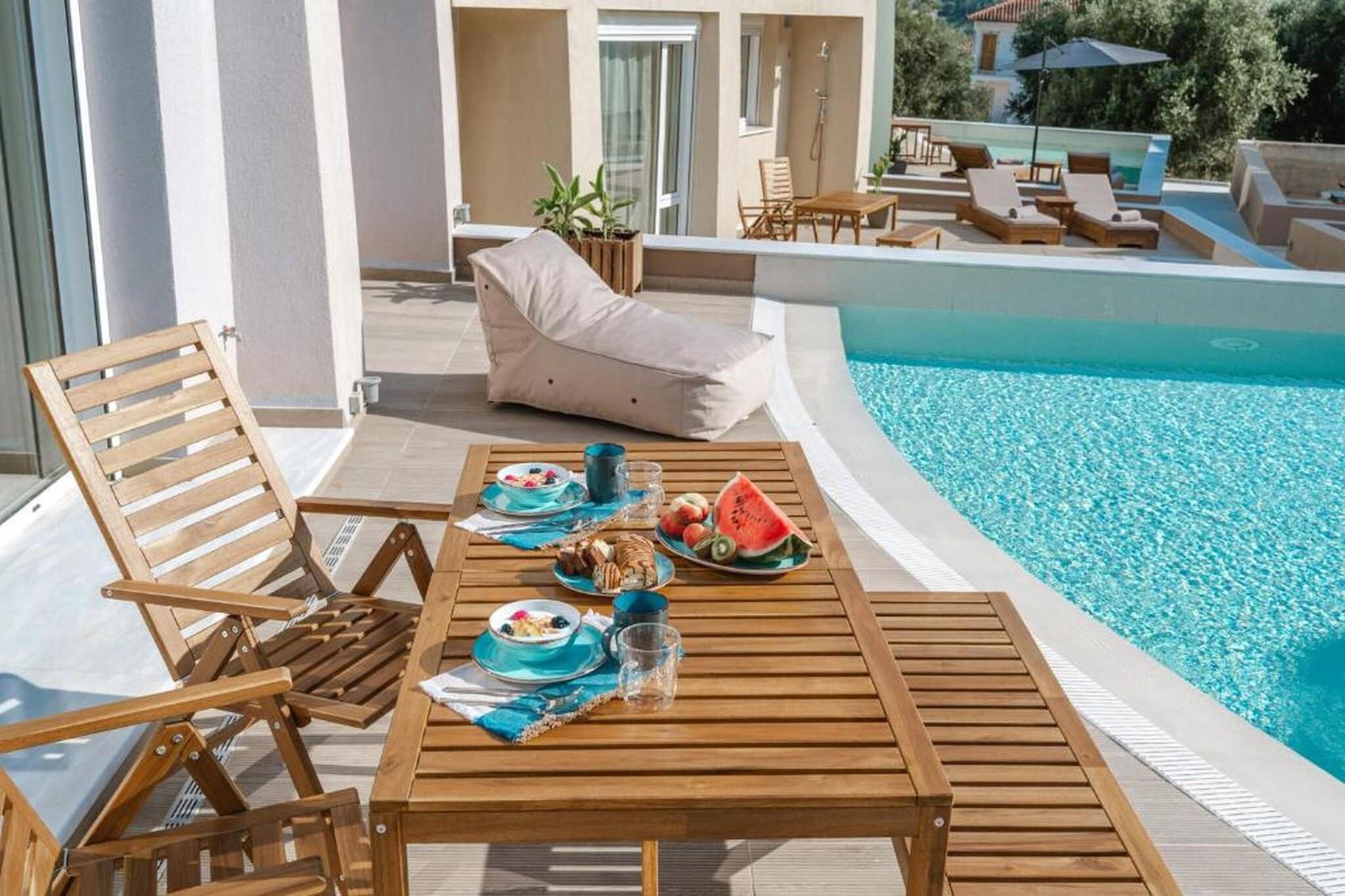 Fordyb dig i en raffineret middelhavsferie på Tortuga Luxury Villas Sivota, hvor moderne arkitektonisk elegance møder den uberørte naturlige skønhed ved den joniske kyst. Denne villa på 130 m²-135 m² med tre soveværelser er designet til kræsne rejsende og tilbyder en problemfri blanding af indendørs og udendørs ophold og førsteklasses faciliteter. Villaen er perfekt egnet til grupper eller familier på op til seks personer og har en sæsonåben privat swimmingpool og en rolig terrasse møbleret med havemøbler og liggestole, hvilket giver et afsidesliggende fristed at slappe af i Grækenlands afslappede rytme. Interiøret er et udstillingsvindue for sofistikeret komfort med tre soveværelser med eget badeværelse, store dobbeltsenge og en rummelig opholdsstue med satellit-tv og højhastigheds-Wi-Fi. Det fuldt udstyrede åbne køkken inkluderer high-end apparater såsom espressomaskine, ovn, opvaskemaskine og endda et raclette-sæt til mindeværdige aftener. Yderligere faciliteter såsom parkering, aircondition og vaskeri er omhyggeligt udvalgt for at sikre et fredeligt og luksuriøst ophold. Ideelt beliggende i et roligt boligområde i Sivota, kun 17 minutters gang (1,4 km) fra det krystalklare vand ved Zavia-stranden og en kort tur på 1,5 km til den pulserende Sivota-havn. Ejendommen tilbyder bekvemmeligheden af gratis privat parkering på stedet, lufthavnstransport og fuld tilgængelighed for handicappede gæster. Uanset om du nyder en grillfest på terrassen eller nyder udsigten over bjergene og poolen fra din private balkon, tilbyder disse villaer en autentisk og fornemt græsk ø-livsoplevelse.