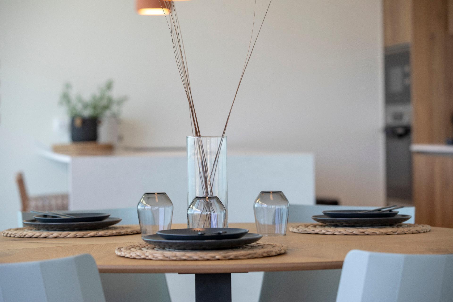 The fully equipped kitchen includes high-end appliances such as a refrigerator, oven, stove, microwave, and dishwasher. A stylish dining area with a large table invites guests to enjoy meals together in comfort.