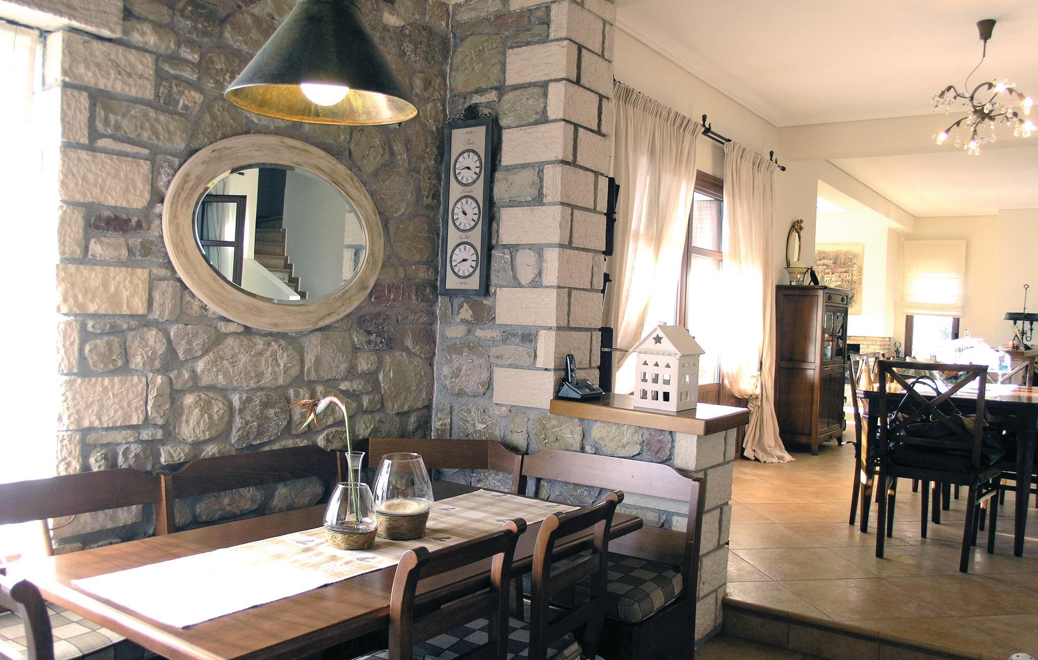 Nyd jeres kaffe og måltiderne på den store, overdækkede terrasse ved det store bord. På første sal findes yderligere tre soveværelser, alle med eget badeværelse og en stor overdækket terrasse til afslapning. Stenstranden ligger kun 200 m fra huset, og lidt længere væk ligger små typisk græske tavernaer, hvor I kan smage lokale specialiteter.