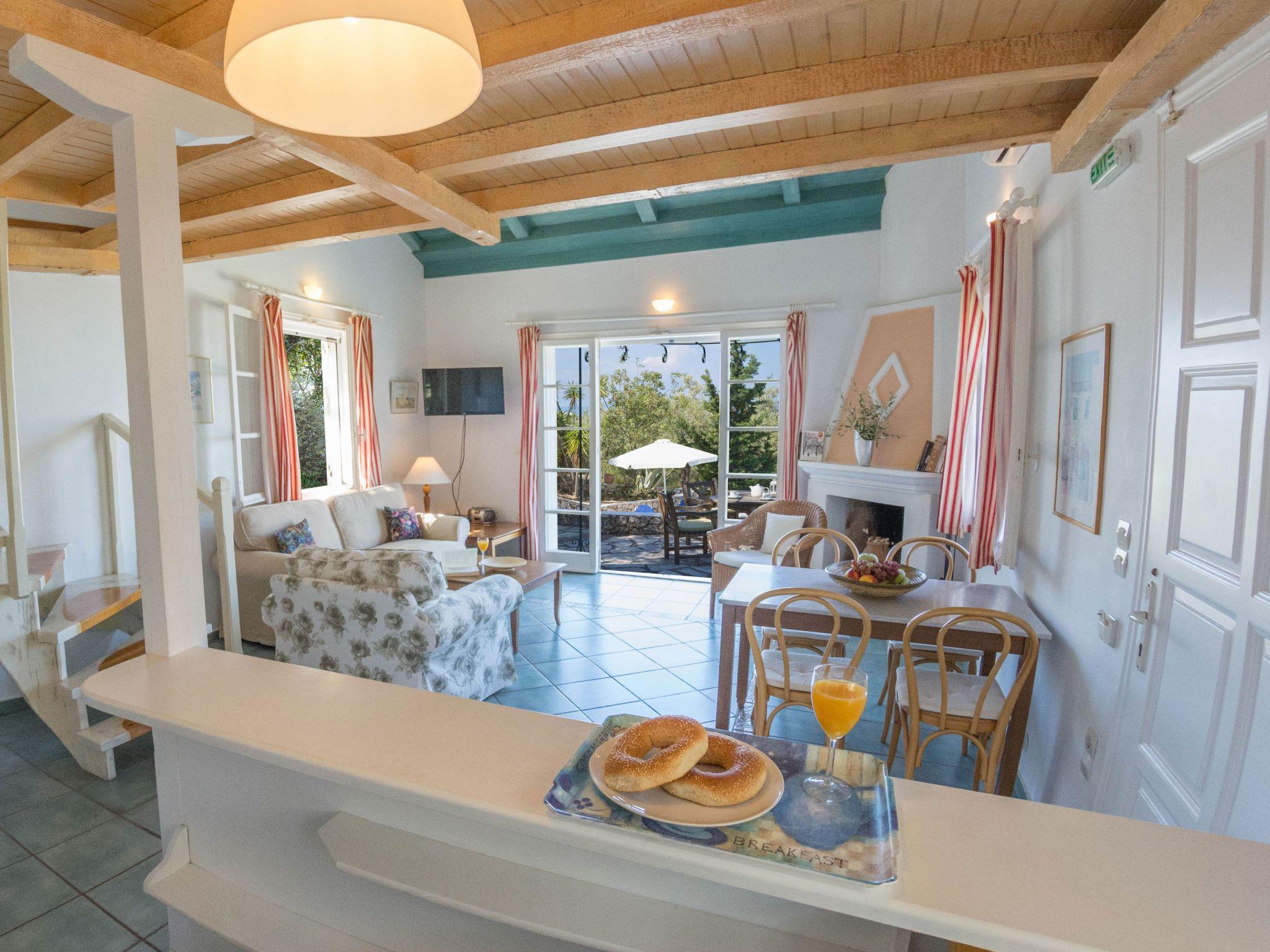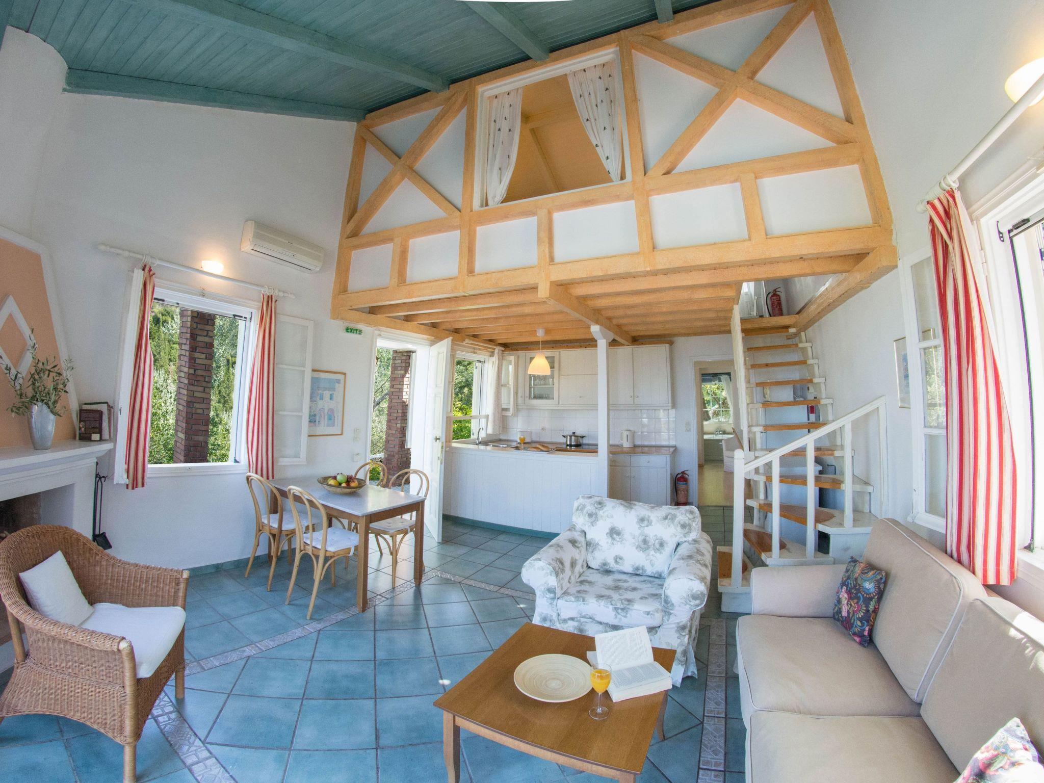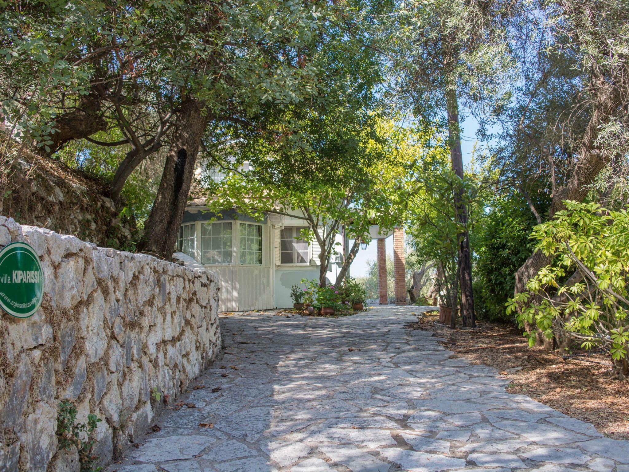 An asphalt drive leads up from the village of Agios Nikitas to the villa. Situated on different levels, natural stone walls, olive trees, shrubs, climbers and cacti surround each villa to create privacy.
