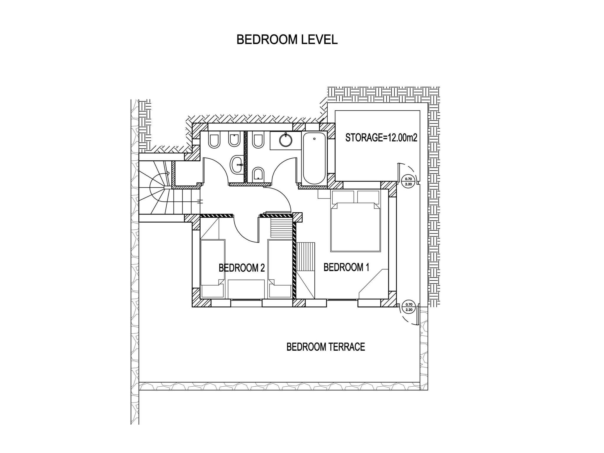 The villa counts approx. 100 m² split in two main levels and an attic, with 2 bedrooms, 2 bathrooms & 1 w.c with a shower, plus the attic as a third bedroom. Entering the villa the main entrance level has an open plan living/dining/kitchen area. The living area has a fire-place and French windows that open onto a wide canopy balcony to the sea views. The dining area has French windows open onto the large swimming pool terrace. Next to the kitchen are the stairs leading up to the attic and down to the bedrooms .There is also one bathroom with shower in common use for this floor and the attic. Staircase leads down to one double bedroom, with en-suite spacious bathroom, leading to big open terrace and one twin bedded room, leading to the same open terrace, next to another bathroom with shower. From the main level, an open staircase leads up to the attic ,as a third bedroom with two single beds.