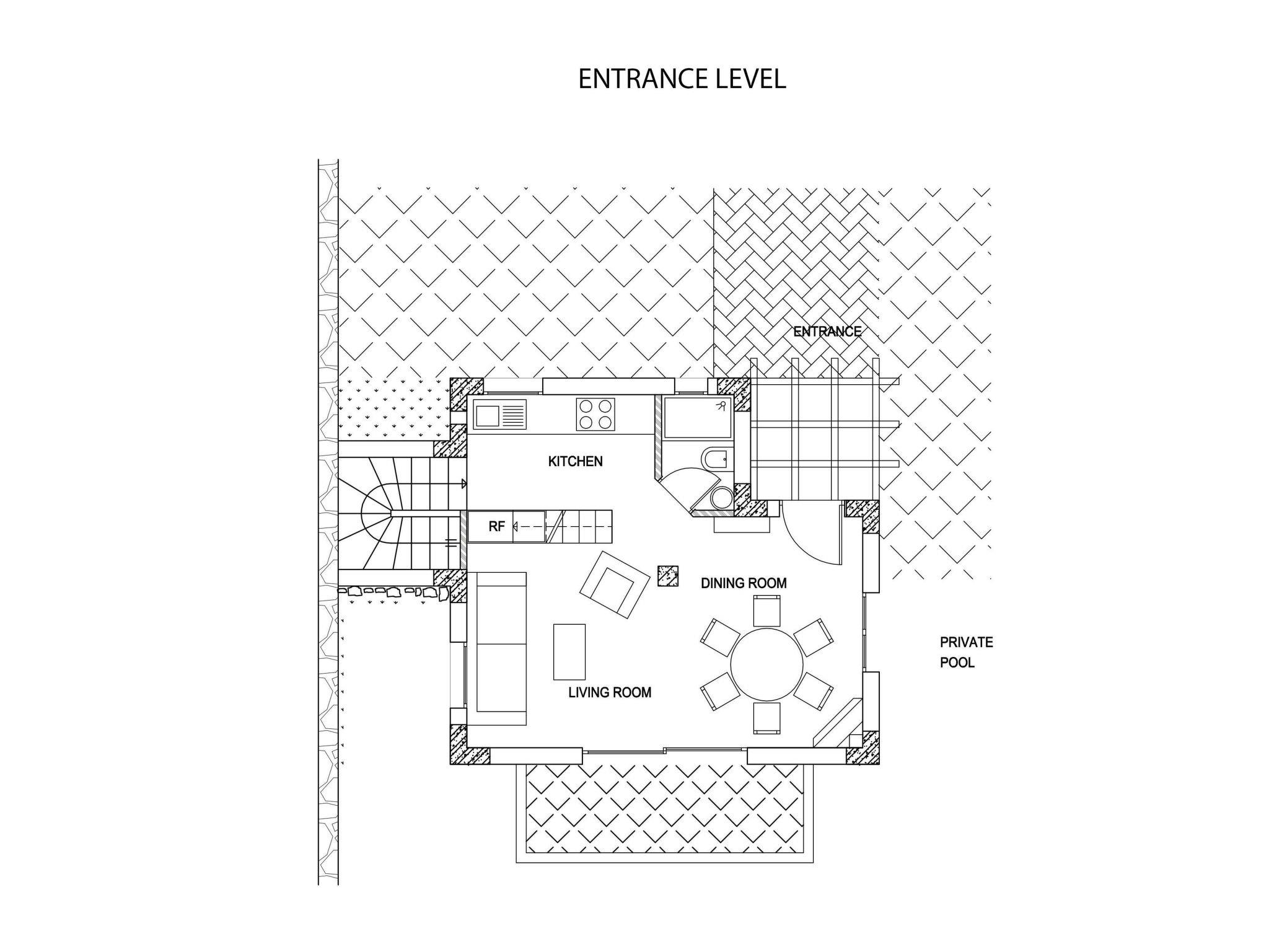 Entrance level: Entering the villa, the main entrance level has an open plan living/dining/kitchen area. The living area has a fire-place and French windows that open onto a wide canopy balcony to the sea views. The dining area has French windows open onto the large swimming pool terrace. Next to the kitchen are the stairs leading up to the attic and down to the bedrooms .There is also one bathroom with shower in common use for this floor and the attic.?