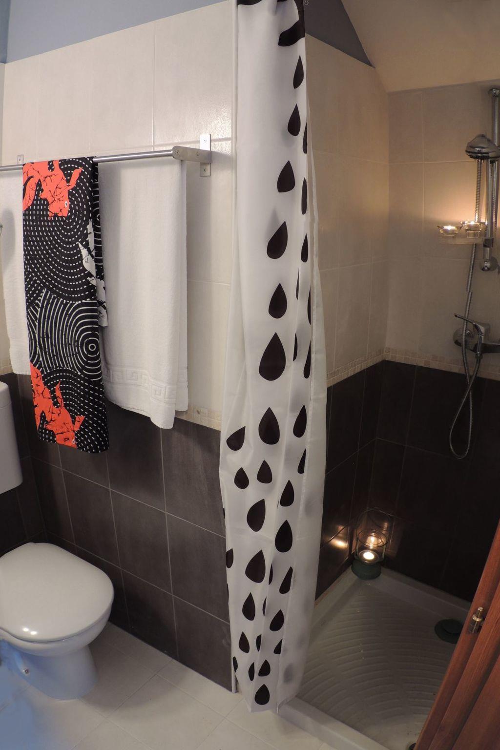 The villa counts approx. 100 m² split in two main levels and an attic, with 2 bedrooms, 2 bathrooms & 1 w.c with a shower, plus the attic as a third bedroom. Entering the villa the main entrance level has an open plan living/dining/kitchen area. The living area has a fire-place and French windows that open onto a wide canopy balcony to the sea views. The dining area has French windows open onto the large swimming pool terrace. Next to the kitchen are the stairs leading up to the attic and down to the bedrooms .There is also one bathroom with shower in common use for this floor and the attic. Staircase leads down to one double bedroom, with en-suite spacious bathroom, leading to big open terrace and one twin bedded room, leading to the same open terrace, next to another bathroom with shower. From the main level, an open staircase leads up to the attic ,as a third bedroom with two single beds.