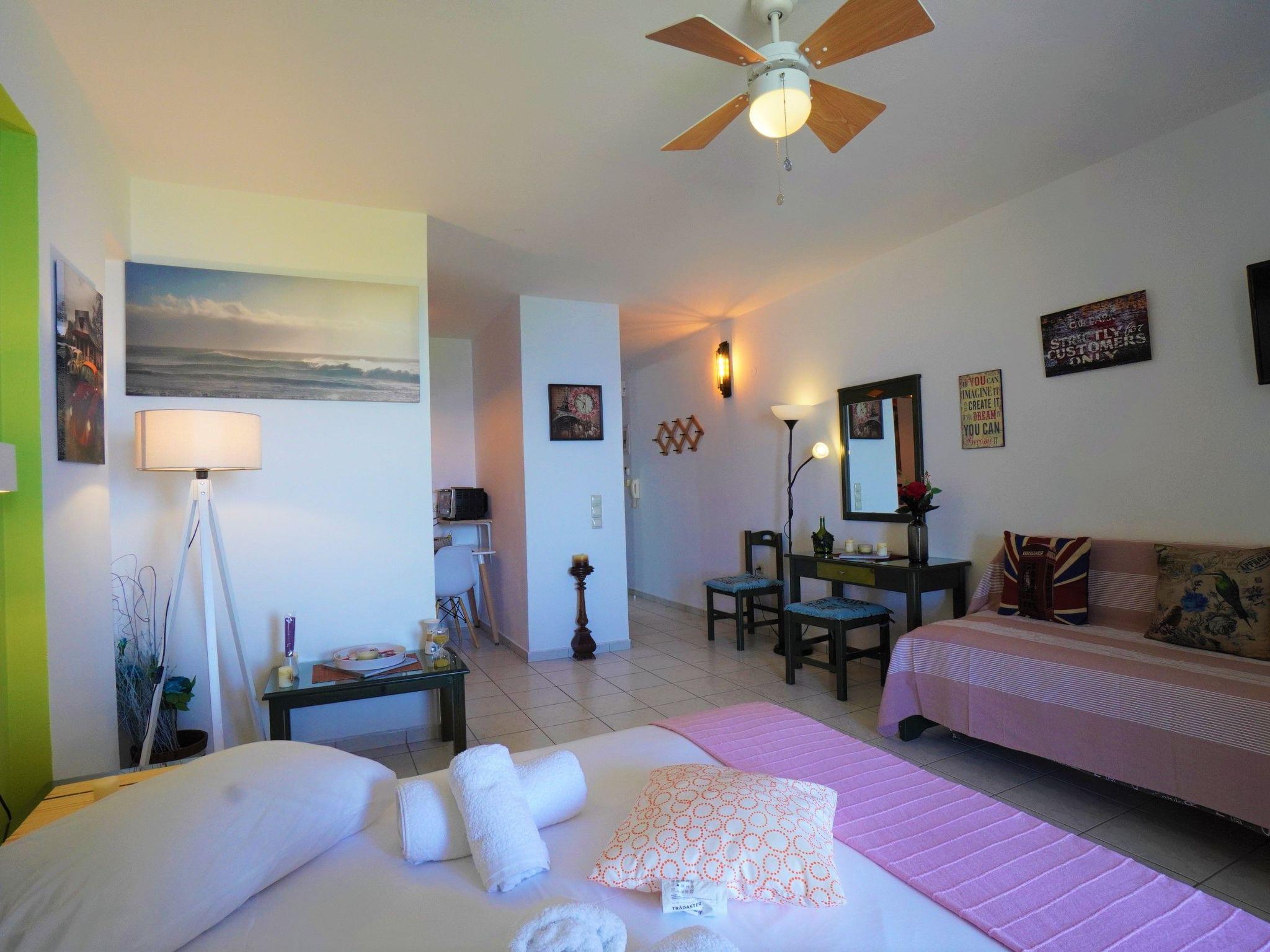 A quiet studio apartment on the third floor about 45 square metres in size. It is a modern in a minimalist style apartment with an open living space with a double bed, a half-separate kitchenette and a bathroom. There is a flat-screen TV 32 inches, an A/C along with a ceiling fan and a half-separate kitchenette equipped with an oven. A fridge and a stovetop are also featured, as well as a coffee machine and a kettle. There is a private bathroom with a shower and towels, bed linen and toiletries are offered. A washing machine is available, while guests will find extra bed linen and towels in the closet.