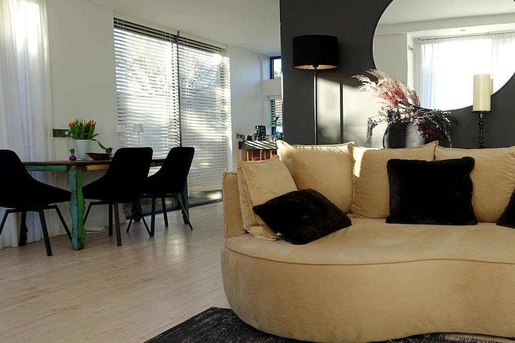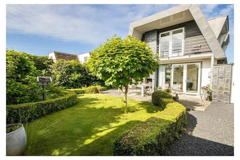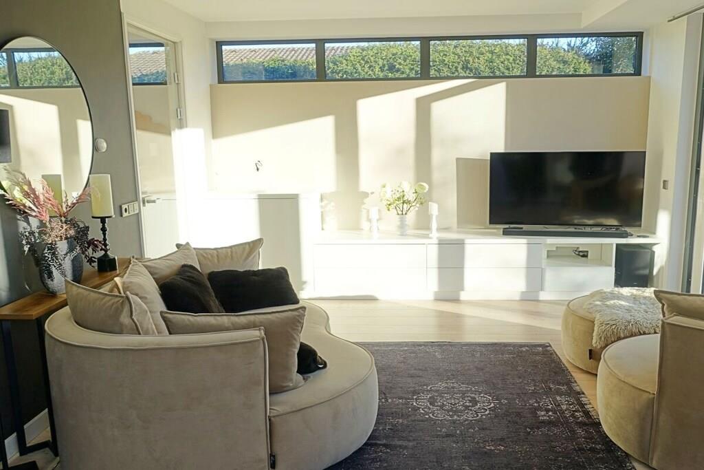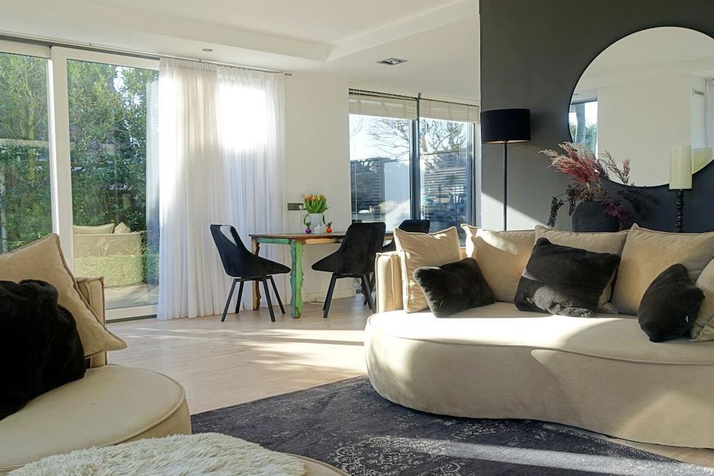 Ein einzigartiges Urlaubsgefühl inmitten der Ruhe und der Weite der nordholländischen Küstenlandschaft zwischen Egmond aan Zee und Bergen. Die Villa befindet sich hinter dem Dünengebiet nur 15 Fahrradminuten vom Strand entfernt. Parken Sie Ihr Auto auf Ihrem eigenen Stellplatz und betreten Sie Ihre lichtdurchflutete und freistehende Ferienvilla. Das Wohnzimmer ist durch mehrere Terrassentüren und Fenster mit dem schönen Garten verbunden und die luxuriöse Einrichtung fällt sofort ins Auge. Ein Gaskamin sorgt für gemütliche Abende und draußenfinden Sie einen Kamin für schöne Sommerabende. Die Küche ist modern und gut ausgestattet mit hochwertigen Arbeitsflächen und Induktionsherd. Neben der Kaffeemaschine verfügt Sie auch über eine Nespresso Maschine. Der helle Eingangsbereich bietet Platz für Ihre Garderobe und ein WCIm Obergeschoss befinden sich die beiden Schlafzimmer. Das Hauptschlafzimmer verfügt über ein Boxspringbett und einen privaten Balkon mit Weitblick über die Felder. Das zweite Schlafzimmer ist mit Liebe zum Detail eingerichtet. Das sehr große und luxuriöse Badezimmer verfügt über eine Regendusche, einen großen Waschtisch und eine Badewanne für zusätzliche Entspannung. Der liebevoll angelegte Garten geht rund um das Haus und kann durch Türen an beiden Seiten des Hauses betreten werden. Der Garten ist uneinsehbar und bietet Ihnen sonnige oder auch schattige Plätzchen und viel Privatsphäre. Stellen Sie Ihr Fahrrad in einem der beiden Schuppen unter, relaxen Sie windgeschützt im überdachten Sitzbereich oder genießen Sie ein leckeres Essen auf der geräumigen Terrasse am Außenkamin.