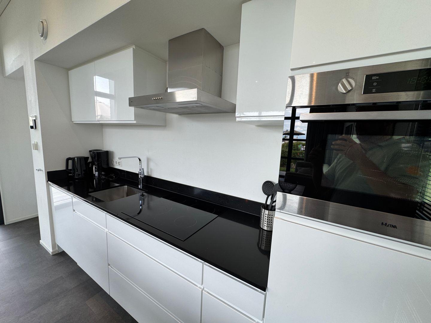 Die großzügige offene Küche ist mit Induktionsherd, Backofen, Mikrowelle, Spülmaschine, Kühlschrank mit Gefrierfach, Kaffeemaschine, Wasserkocher, Küchenutensilien sowie umfangreicher Geschirrausstattung ausgestattet. Eine Waschmaschine und ein Trockner stehen zur gemeinschaftlichen Nutzung bereit, Wäscheständer, Staubsauger und Feuerlöscher ergänzen das praktische Angebot.