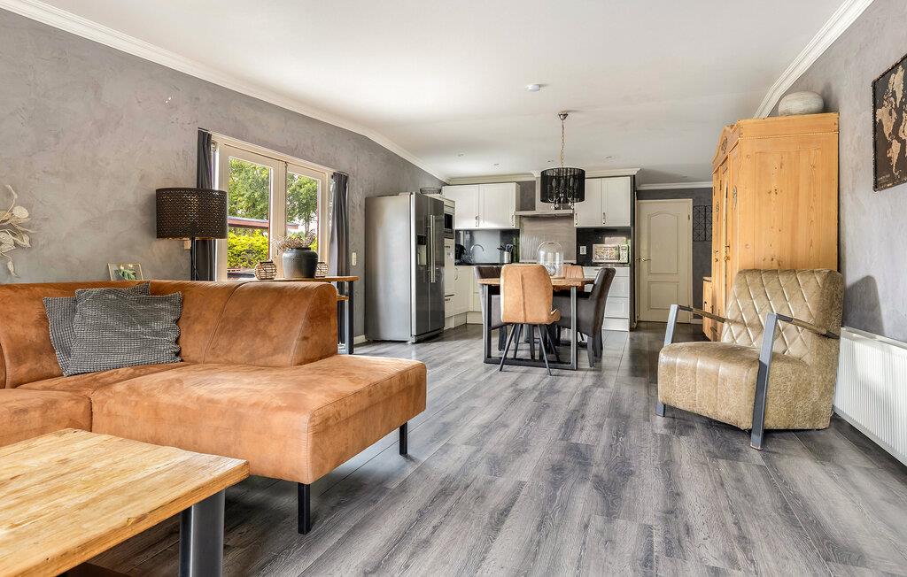 Tilbring afslappende dage i et charmerende feriehus omgivet af natur og med masser af komfort. Træd ind i den lyse, kærligt møblerede opholdsstue med store vinduer og komfortable sofaer. De smagfulde møbler i bløde farver skaber en venlig og indbydende atmosfære. Læn jer tilbage og lad blikket vandre over det grønne. Nyd jeres måltid ved spisebordet ved siden af ??det åbne køkken, som lægger op til at lave mad sammen.