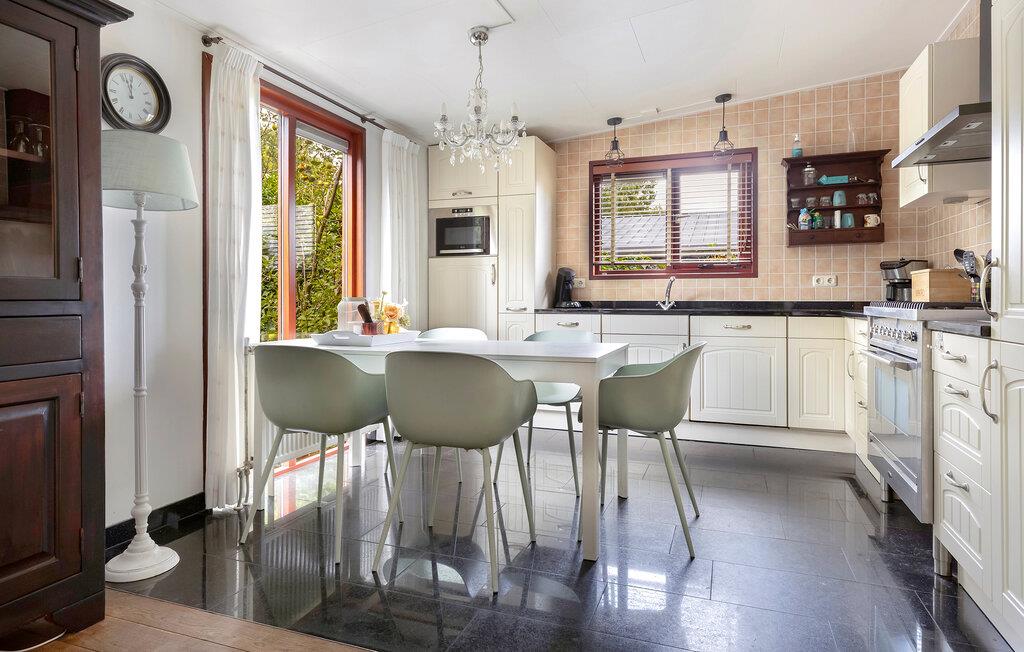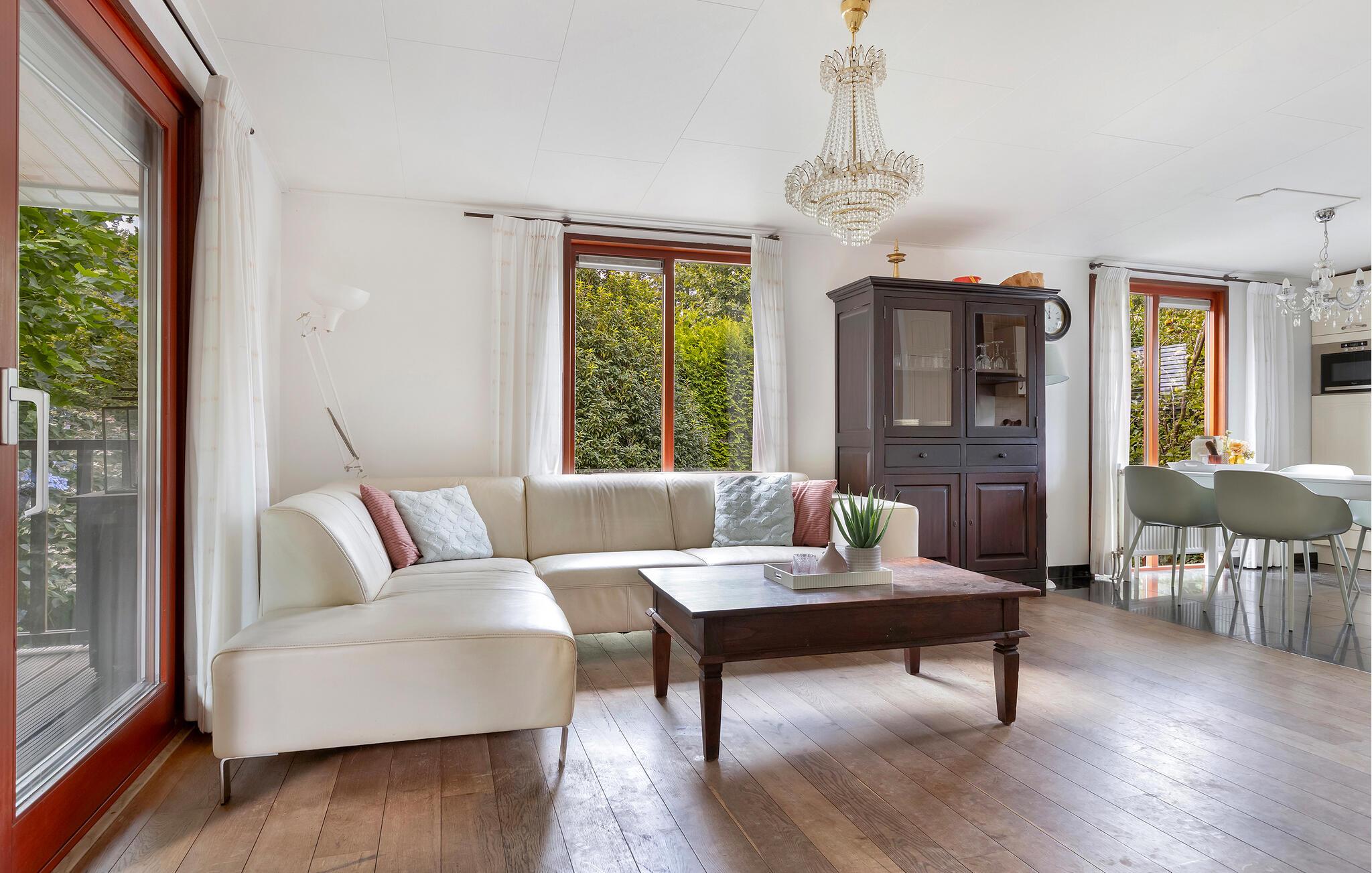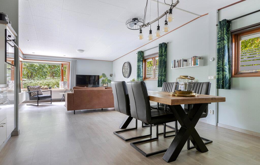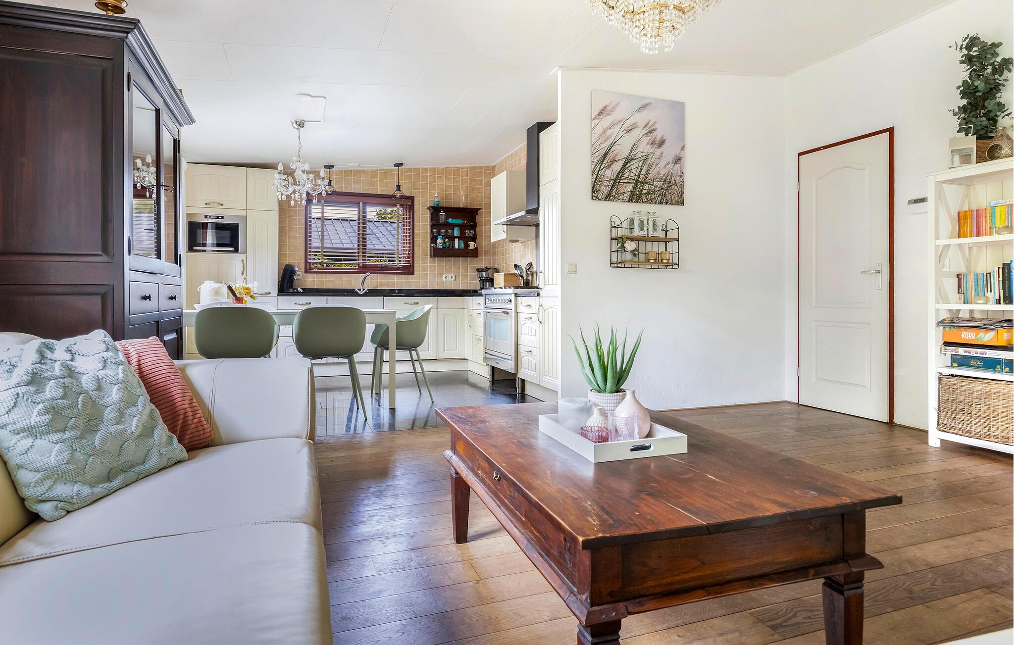 Tilbring afslappende dage i et charmerende feriehus omgivet af natur og med masser af komfort. Træd ind i den lyse, kærligt møblerede opholdsstue med store vinduer og komfortable sofaer. De smagfulde møbler i bløde farver skaber en venlig og indbydende atmosfære. Server jeres måltider ved spisebordet ved siden af ??det åbne køkken, eller læn jer tilbage, og nyd blikket ud i det grønne.