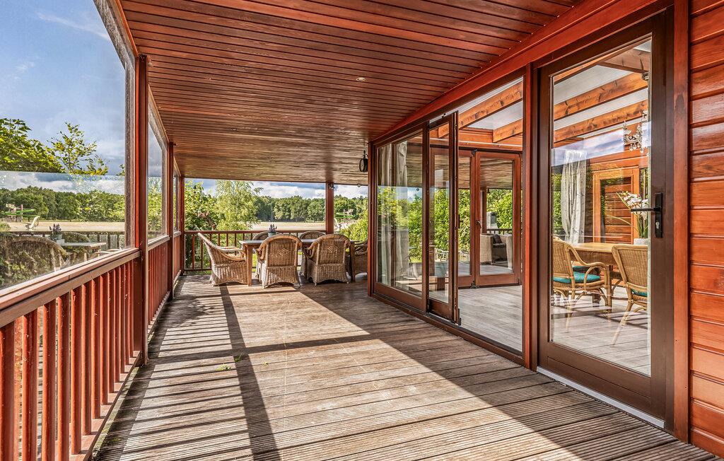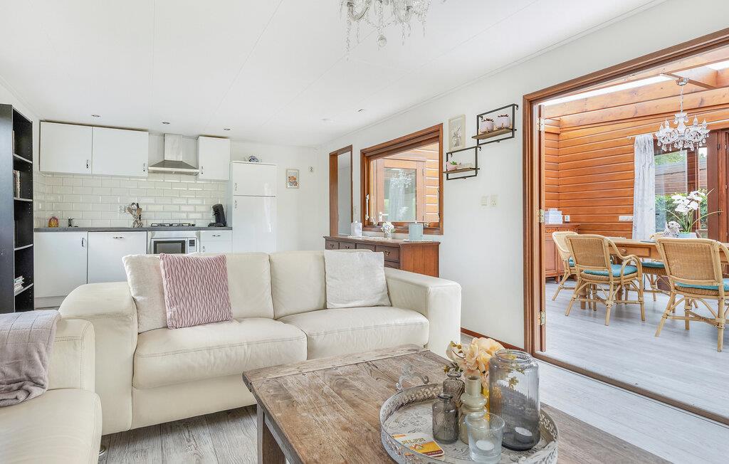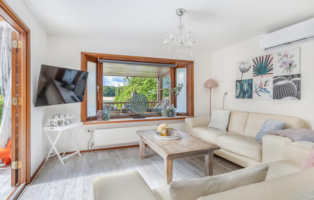 Træd ind i den lyse, velindrettede opholdsstue med store vinduer og komfortable sofaer. De smagfulde møbler i bløde farver skaber en venlig og indbydende atmosfære. Læn jer tilbage, og lad blikket vandre over det grønne. Spis sammen ved det hyggelige spisebord i udestuen, eller brug det åbne køkken til at lave mad sammen. Fra stuen og udestuen har I udsigt til stranden og søen.