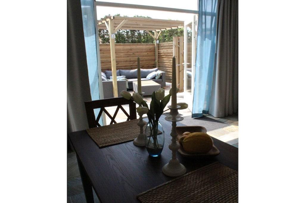 Stueetage: (Stue/soveværelse(, , , toilet, dobbeltseng, Fjernsyn, varme), badeværelse(, Hytte, toilet, sauna, Tyrkisk bad, bruser, håndvask, varme)) , , , åbent køkken(, spisebord, kogeplade, elkedel, brødrister, kaffemaskine, ovn, mikrobølgeovn, opvaskemaskine , køleskab, fryser, varme), Internetadgang, tørretumbler, vaskemaskine, varme, terrasse(grill, havemøbler, solstole), parkering