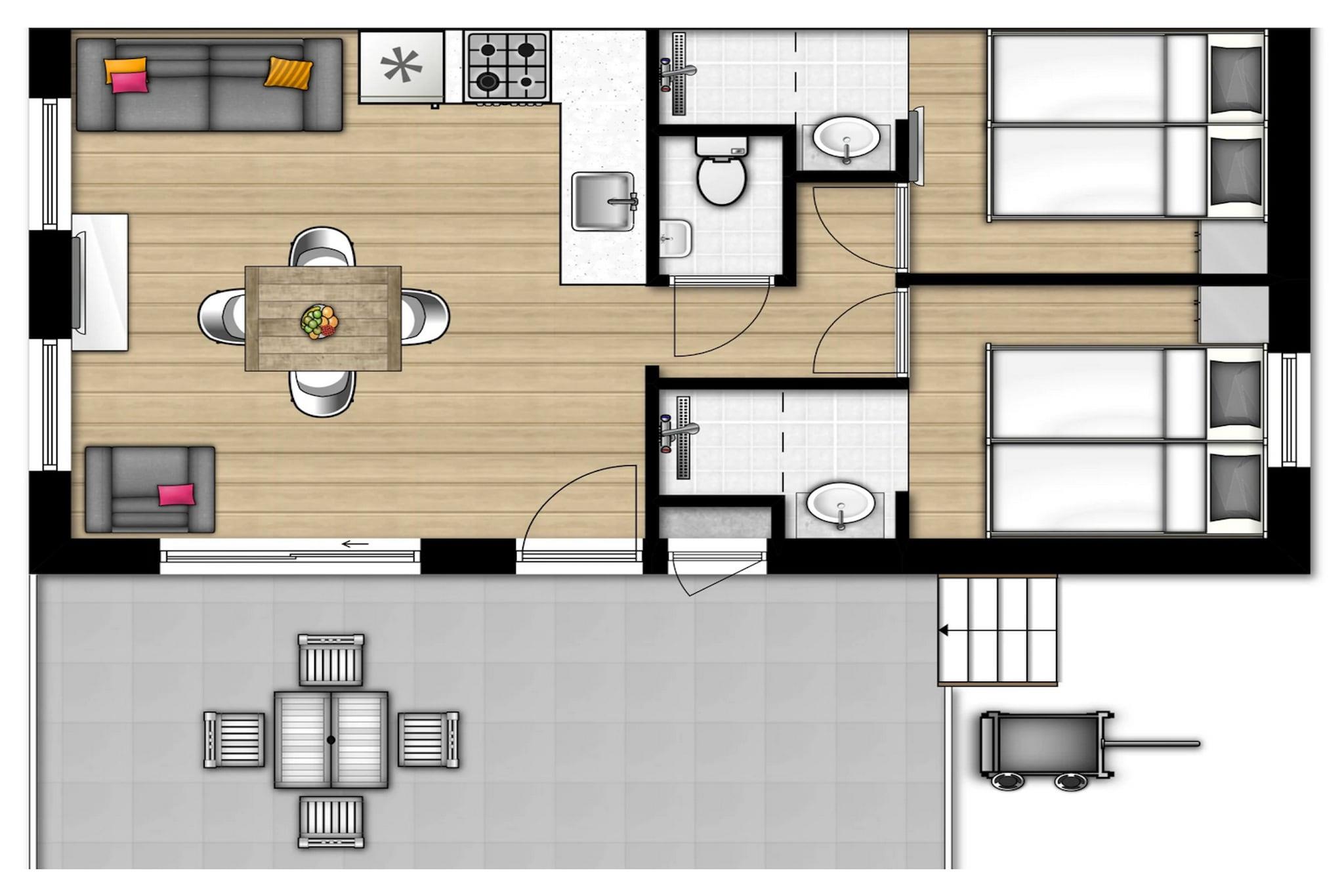 Stueetage: (entre(toilet), åbent køkken(elkedel, kaffemaskine(kopper), combi-mikroovn, opvaskemaskine , køleskab(+ fryser)), stue / spisestue(Fjernsyn), Soveværelse med badeværelse(dobbeltseng eller 2 enkeltsenge Senge, bruser, håndvask), Soveværelse med badeværelse(dobbeltseng eller 2 enkeltsenge Senge, bruser, håndvask)) varme(central), terrasse, havemøbler, swimmingpool(deles med andre gæster, overdækket)