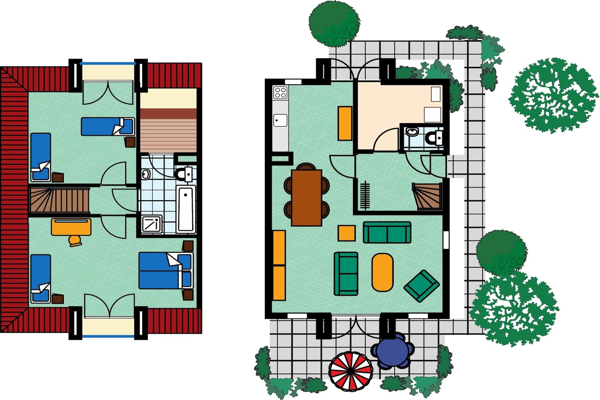 Stueetage: (entre(toilet), Stue(Fjernsyn(kabel)), åbent køkken(kaffemaskine(kaffetragt))) På 1. etage: (soveværelse(enkeltseng(boxmadras), dobbeltseng(boxmadras)), soveværelse(2x enkeltseng(boxmadras)), badeværelse(badekar, sauna, håndvask, toilet), Repos) varme(central), terrasse, have, havemøbler, swimmingpool(deles med andre gæster, overdækket)