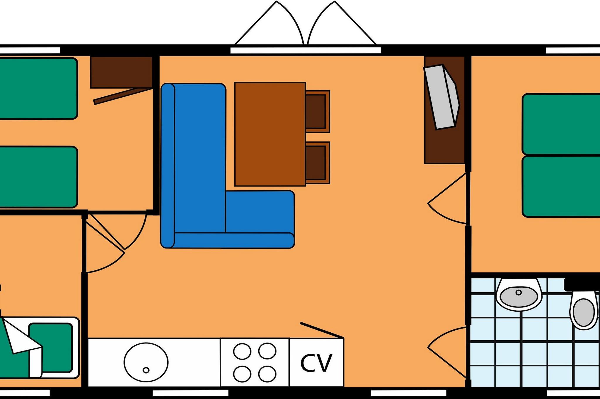 Stueetage: (Stue(Fjernsyn(kabel), radio), åbent køkken(komfur(Komfur med fire kogeplader), kaffemaskine(kaffepude), mikrobølgeovn, opvaskemaskine ), soveværelse(dobbeltseng eller 2 enkeltsenge Senge, Fjernsyn(kabel)), soveværelse(dobbeltseng eller 2 enkeltsenge Senge), soveværelse(køjeseng), badeværelse(bruser, håndvask, toilet)) varme(central), terrasse(overdækket), have, havemøbler, swimmingpool(deles med andre gæster, overdækket)