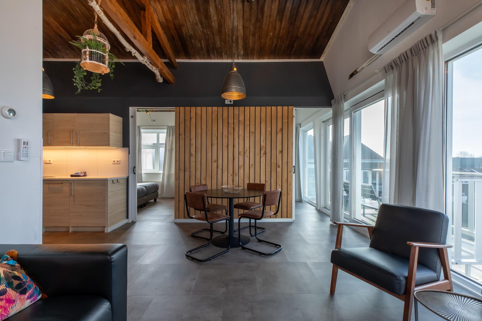 Stueetage: (Stue(Fjernsyn(fladskærm, Hollandske TV-kanaler, Tyske TV-kanaler, Internationale TV-kanaler), sofahjørne), åbent køkken(emhætte, combi-mikroovn, opvaskemaskine ), soveværelse(enkeltseng(boxmadras), enkeltseng(boxmadras)), soveværelse(enkeltseng(boxmadras), enkeltseng(boxmadras)), badeværelse(bruser, håndvask), toilet) balkon, klimaanlæg, havemøbler, Ladestation til el-biler