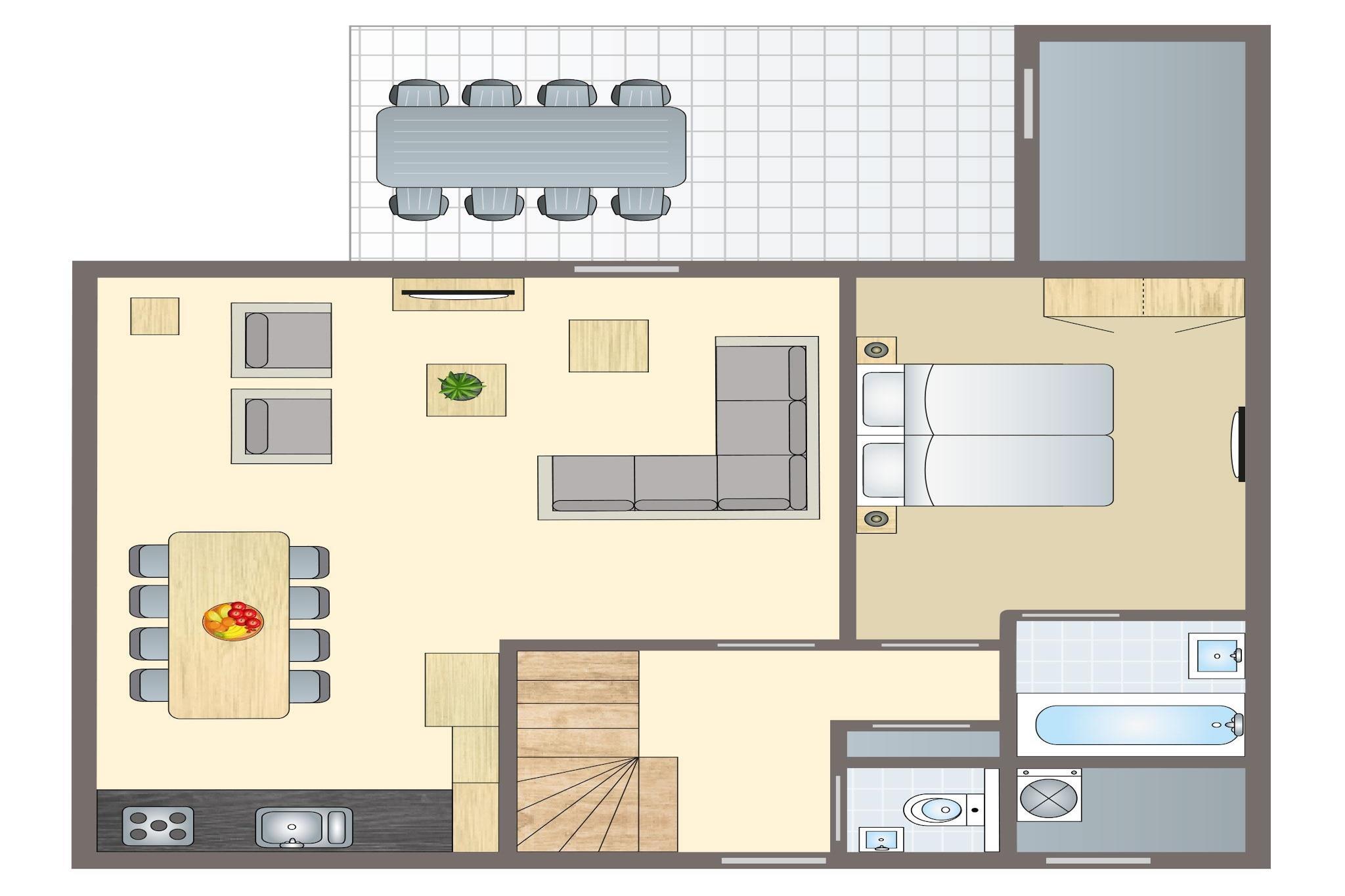 Stueetage: (entre(toilet), Stue(Fjernsyn), åbent køkken(elkedel, komfur(gas), kaffemaskine(kopper, kaffetragt), ovn, mikrobølgeovn, opvaskemaskine , køle-fryseskab), Soveværelse med badeværelse(dobbeltseng eller 2 enkeltsenge Senge, Fjernsyn, badekar med bruser, håndvask), pulterkammer(vaskemaskine)) På 1. etage: (soveværelse(dobbeltseng eller 2 enkeltsenge Senge), soveværelse(dobbeltseng eller 2 enkeltsenge Senge), soveværelse(dobbeltseng eller 2 enkeltsenge Senge), badeværelse(bruser, håndvask), badeværelse(bruser med lysterapi, sauna, håndvask, toilet), Repos) terrasse(overdækket), have, havemøbler, liggestole, swimmingpool(deles med andre gæster, overdækket), barneseng, barnestol, trappegitter