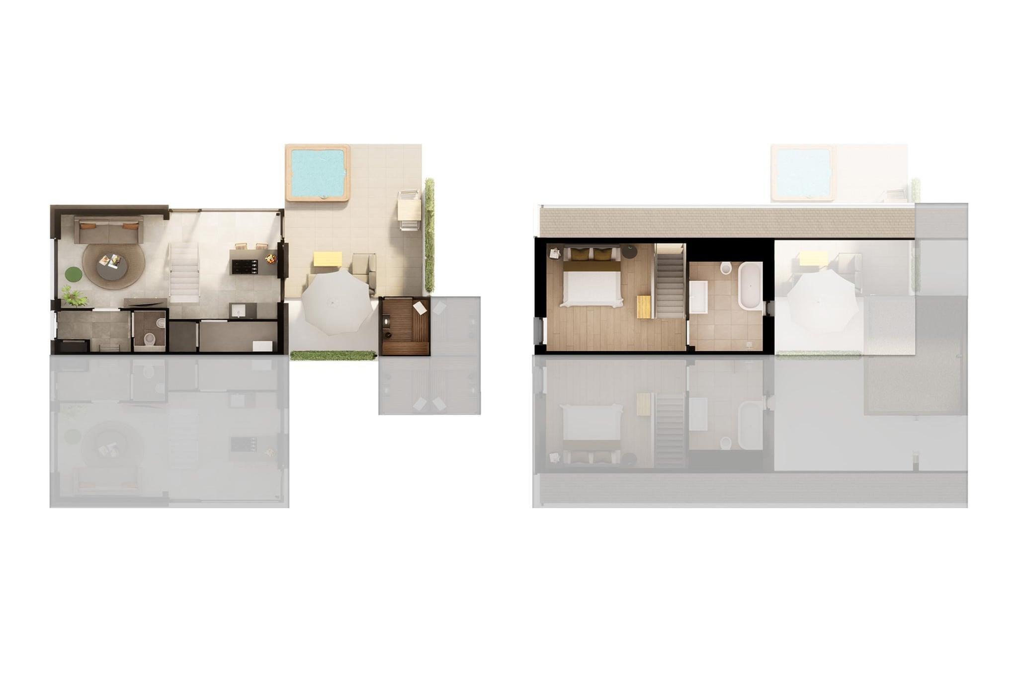 Stueetage: (entre(toilet), Stue(Fjernsyn(Smart-TV), sofahjørne), åbent køkken(kogeplade(Komfur med fire kogeplader, induktion), kaffemaskine(kopper), combi-mikroovn, opvaskemaskine , køle-fryseskab)) På 1. etage: (Soveværelse med badeværelse(dobbeltseng eller 2 enkeltsenge Senge, badekar, bruser(Walk-in-bruser), håndvask, toilet), Repos) Bubble bath(udendørs), bruser(udendørs), sauna, terrasse, have, havemøbler, parkering, swimmingpool(deles med andre gæster, udendørs, indendørs), Ladestation til el-biler