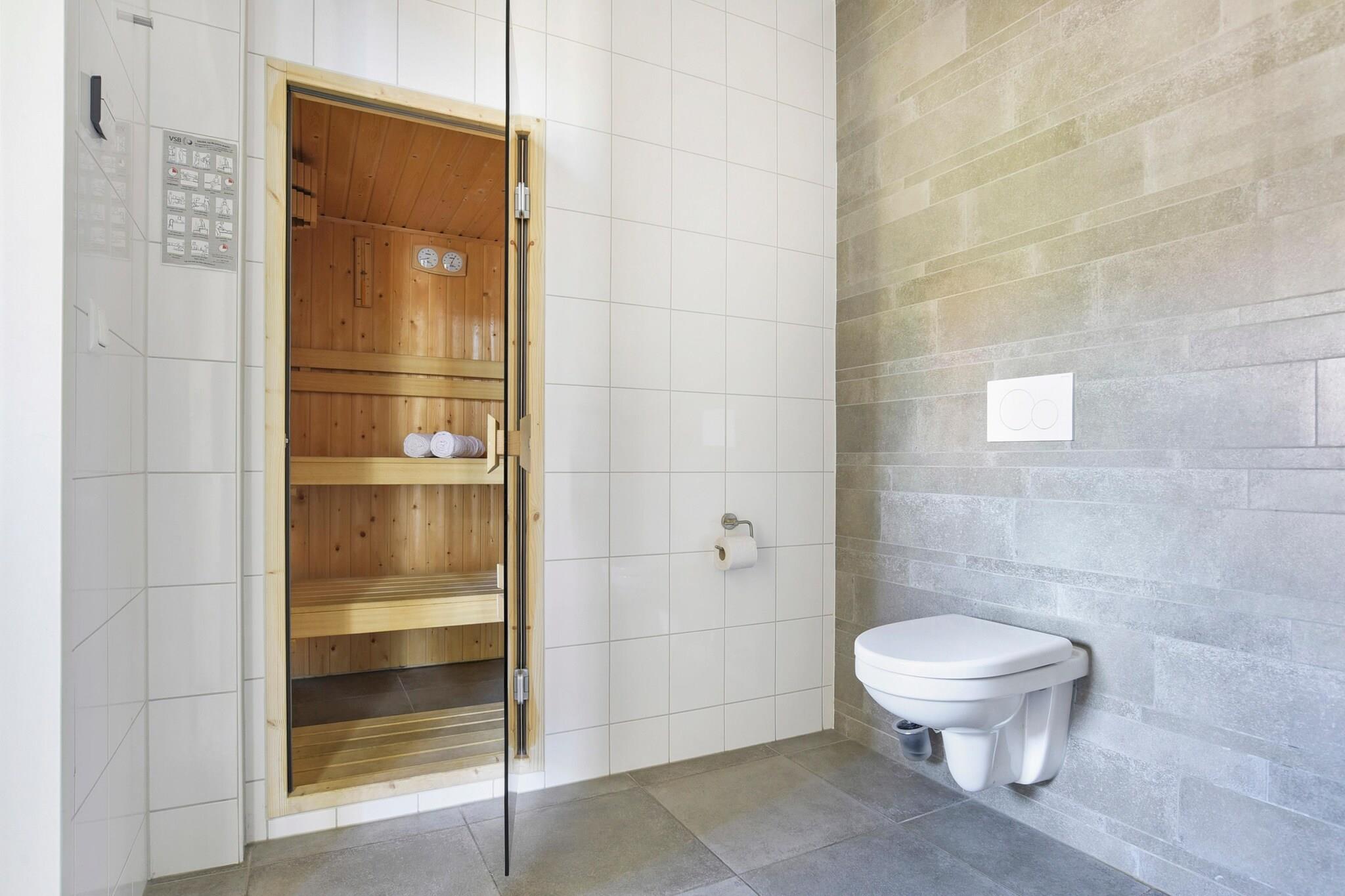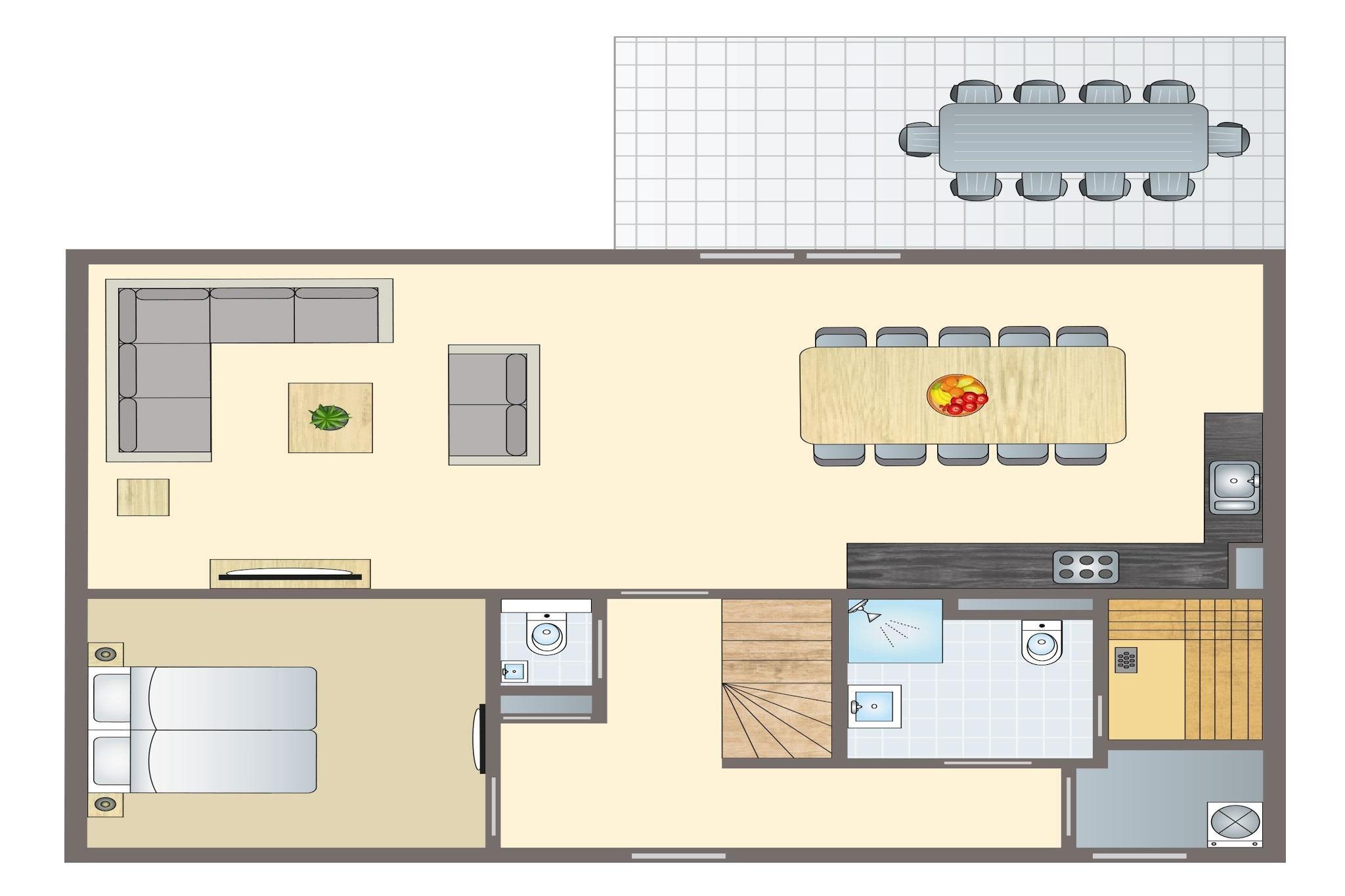 Stueetage: (entre(toilet), Stue(Fjernsyn), åbent køkken(elkedel, komfur(gas), kaffemaskine(kopper), ovn, mikrobølgeovn, opvaskemaskine , køle-fryseskab), soveværelse(dobbeltseng eller 2 enkeltsenge Senge, Fjernsyn), badeværelse(bruser, sauna, håndvask, toilet), pulterkammer(vaskemaskine)) På 1. etage: (soveværelse(dobbeltseng eller 2 enkeltsenge Senge), soveværelse(dobbeltseng eller 2 enkeltsenge Senge), soveværelse(dobbeltseng eller 2 enkeltsenge Senge), soveværelse(dobbeltseng eller 2 enkeltsenge Senge), badeværelse(badekar med bruser, håndvask), badeværelse(bruser med lysterapi, håndvask), Repos(toilet)) terrasse, have, havemøbler, liggestole, swimmingpool(deles med andre gæster, overdækket), barneseng, barnestol, trappegitter