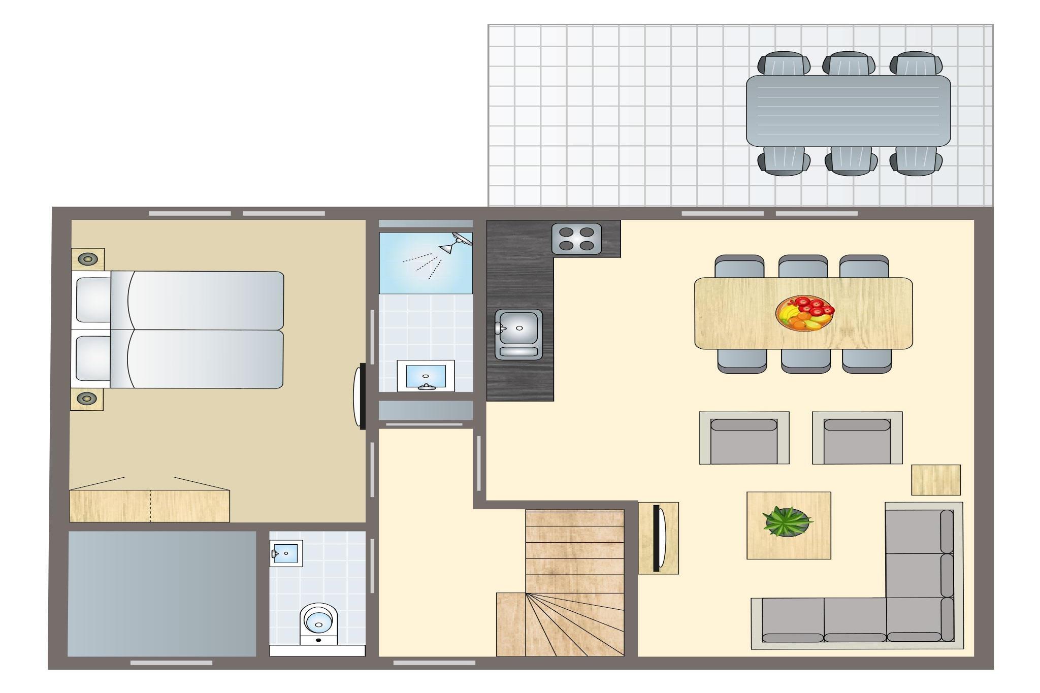 Stueetage: (entre(toilet), Stue(Fjernsyn), åbent køkken(elkedel, komfur(gas), kaffemaskine, ovn, mikrobølgeovn, opvaskemaskine , køleskab), Soveværelse med badeværelse(dobbeltseng eller 2 enkeltsenge Senge, bruser, håndvask), pulterkammer) På 1. etage: (soveværelse(dobbeltseng eller 2 enkeltsenge Senge), soveværelse(dobbeltseng eller 2 enkeltsenge Senge), badeværelse(badekar med bruser, håndvask, toilet), Repos) terrasse, have, havemøbler, swimmingpool(deles med andre gæster, overdækket)