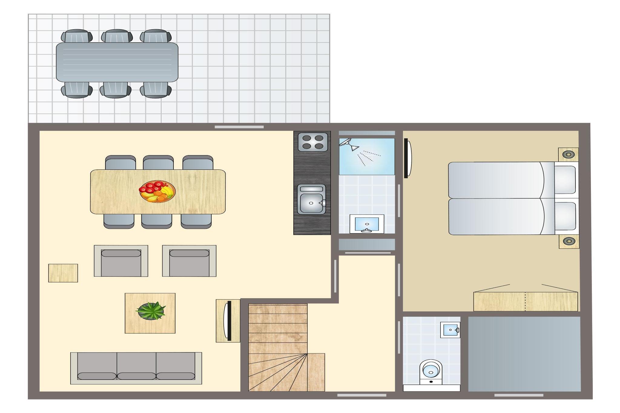 Stueetage: (entre(toilet), Stue(Fjernsyn), åbent køkken(elkedel, komfur(gas), kaffemaskine(kaffetragt, kaffepude), ovn, mikrobølgeovn, køle-fryseskab), Soveværelse med badeværelse(dobbeltseng eller 2 enkeltsenge Senge, Fjernsyn, bruser, håndvask), pulterkammer) På 1. etage: (soveværelse(dobbeltseng eller 2 enkeltsenge Senge), soveværelse(dobbeltseng eller 2 enkeltsenge Senge), badeværelse(badekar med bruser, håndvask, toilet), Repos) terrasse, have, havemøbler, swimmingpool(deles med andre gæster, overdækket)