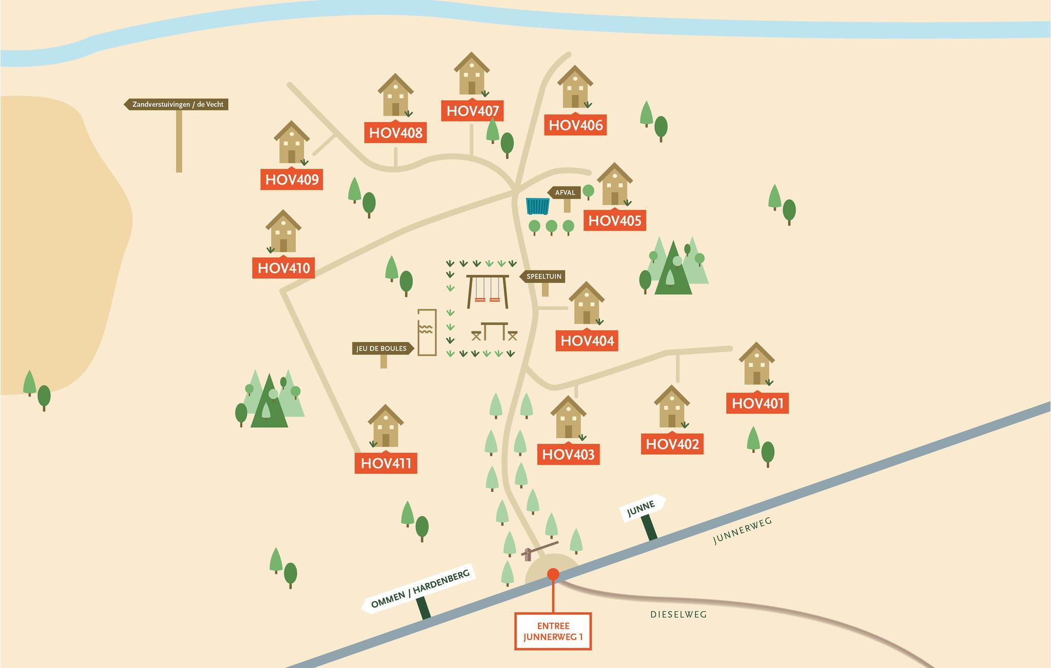 Her kan du nyde et behageligt ophold i sommerhusbyen Bospark Landgoed Junne i Ommen. Med et unikt udvalg af komfortabelt indrettede feriehuse, en stor legeplads, en smukt anlagt petanquebane og en rolig beliggenhed i et skovområde er denne feriehuslandsby den ideelle destination for hele familien. Nyd en afslappende picnic på en bakketop med panoramaudsigt over floden, eller tag på fiskeri i nærheden af ??slusen.