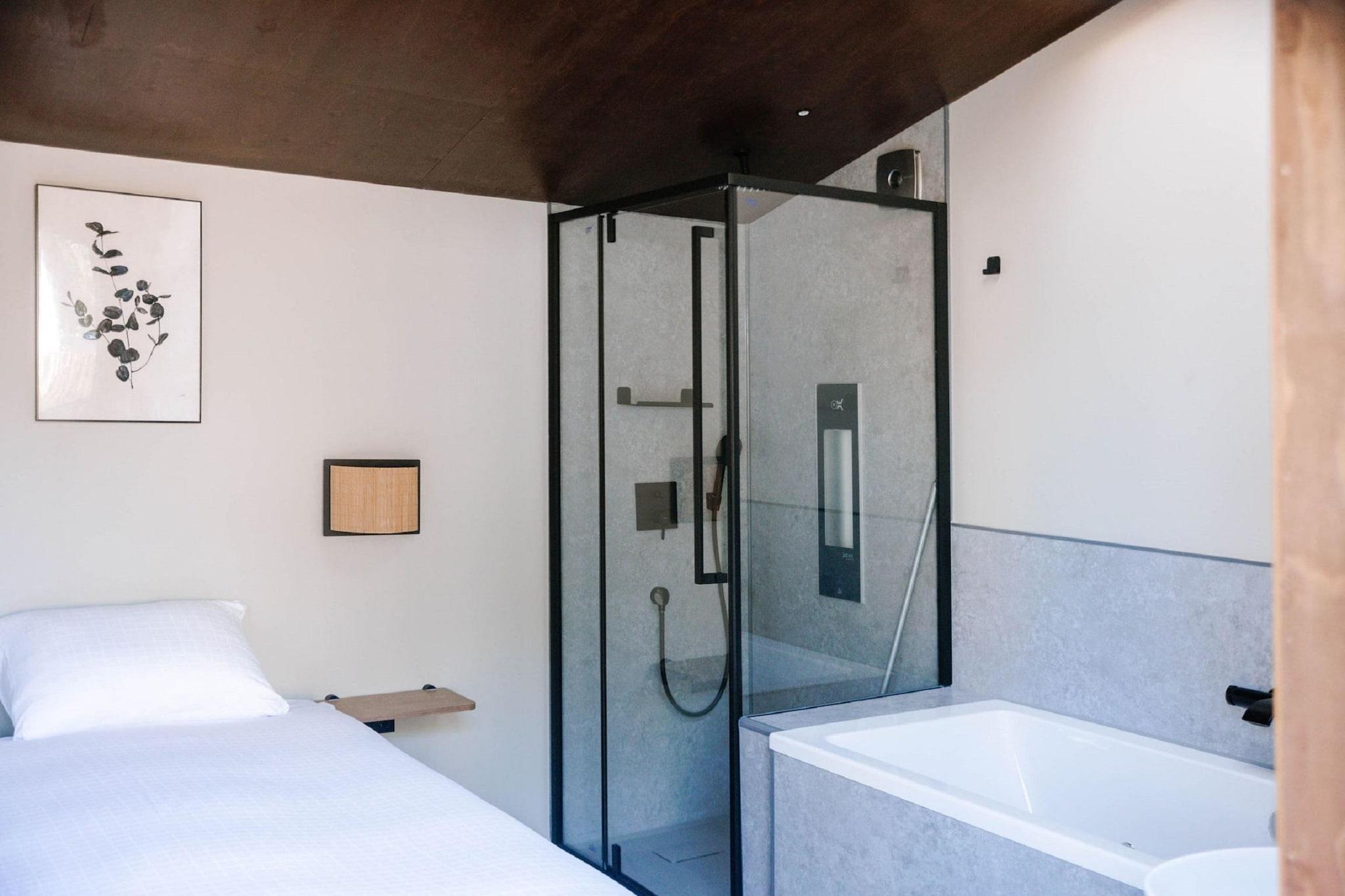 Luksus wellnesshytte i naturen - et romantisk tilflugtssted Undslippe hverdagen i denne fredfyldte og stilfulde wellnesshytte i Voorthuizen, beliggende i hjertet af Gylden. Udformet med naturlige materialer og designet til fred og privatliv, tilbyder dette lille hus en hyggelig, men alligevel raffineret atmosfære. Det åbne koncept opholdsstue er fyldt med lys takket være gulv-til-loft vinduer, der åbner bredt for at udviske grænsen mellem inde og ude. Det er den perfekte ramme for et pars flugt eller en solo-opladning, med alle hjemmets bekvemmeligheder smukt pakket ind i naturen. Wellness-fokuseret komfort og privatliv Træd ind i det spa-lignende soveværelse og oplev ægte afslapning. En plys dobbeltseng sidder ved siden af et fritstående badekar og en overbærende solbruser, der tilbyder både foryngelse og stil. Det fuldt udstyrede køkken omfatter en kombination af mikrobølgeovn, opvaskemaskine og kaffemaskine i Nespresso-stil, perfekt til dovne morgenmad eller intime middage. Udenfor fortsætter din private wellness-oplevelse: Slap af i det udendørs boblebad eller skyl af under udendørsbruseren, alt sammen gemt bag en træskærm for fuldstændig afsondrethed. Central beliggenhed og nærliggende kulinariske lækkerier Beliggende i et fredeligt hjørne af Voorthuizen, er du kun få minutter fra skovstier, charmerende landsbybutikker og hyggelige hollandske caféer. Nyd lokal spisning på gård-til-bord-restauranter eller nyd pandekager på traditionelle "pannenkoekenhuizen".