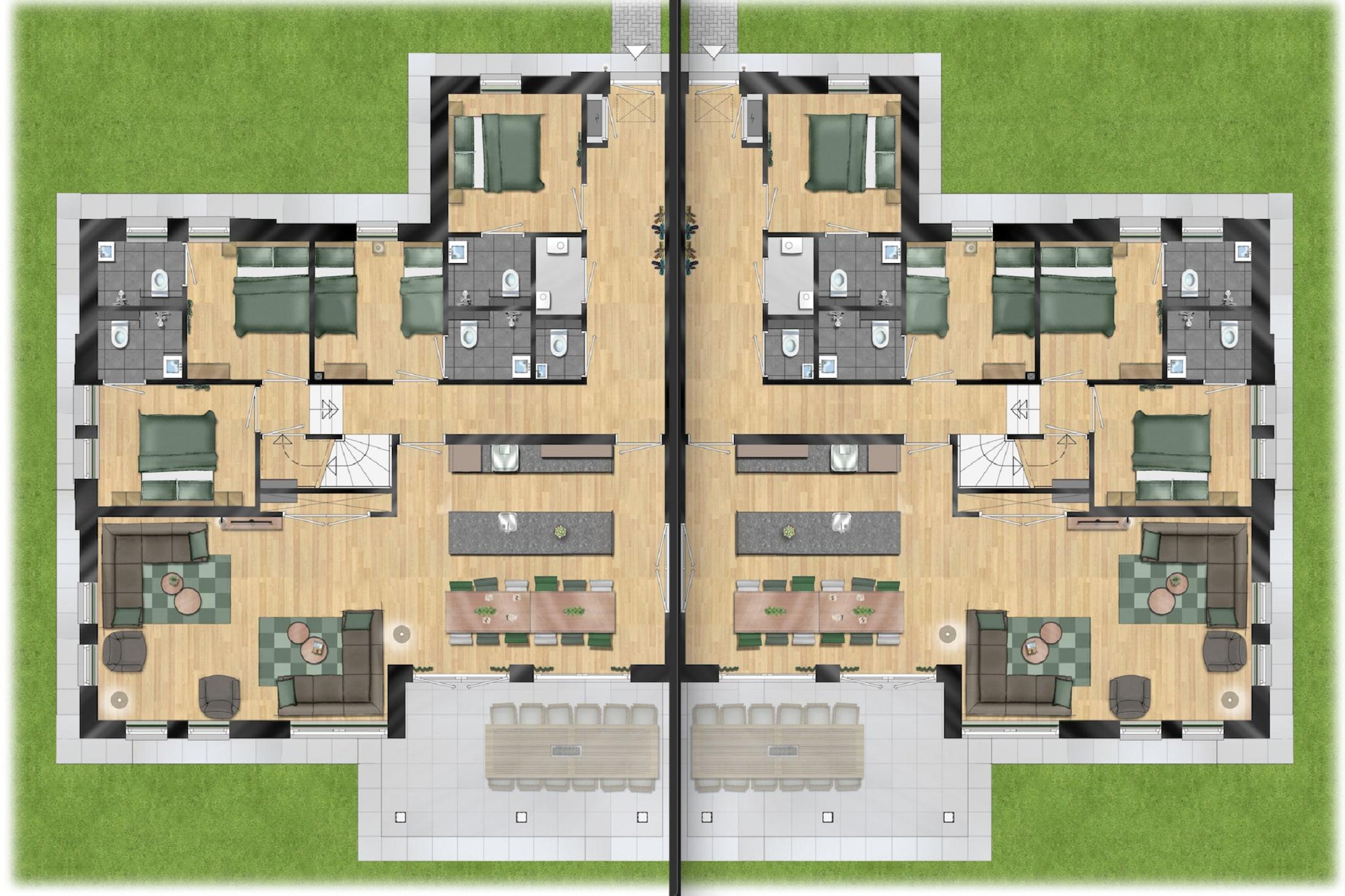 Rummelig luksus til store grupper Velkommen til din ultimative grupperejse i hjertet af Veluwe! Denne moderne 20-personers villa kombinerer to stilfulde 12-personers hytter til et ekspansivt tilflugtssted, perfekt til familiesammenkomster, teamrejser eller ferier i flere generationer. Indenfor finder du ti private soveværelser - hver med sit eget ensuite badeværelse - hvilket sikrer, at alle nyder komfort og privatliv. To fuldt udstyrede køkkener og to hyggelige stuer med tv giver dig plads til at lave mad sammen eller slappe af hver for sig, hvilket gør dette hjem både omgængeligt og fredfyldt. Natur, ro og aktiviteter i nærheden Beliggende i det fredelige feriested De IJsvogel i Voorthuizen, vil du være kun få minutter væk fra de frodige stier i Veluwe National Park - ideel til vandreture, cykling eller spotte hjorte. Tilbage til villaen kan du slappe af på den rummelige haveterrasse med siddepladser til alle eller tage en dukkert i resortets fælles indendørs og udendørs swimmingpools. Med så meget plads og naturlig skønhed omkring, er det en sand flugt fra hverdagen. Bemærk venligst: kæledyr er ikke tilladt, hvilket gør det perfekt til gæster med allergi eller søger et kæledyrsfrit miljø. Charmerende spisesteder i Voorthuizen Efter en dag udendørs kan du forkæle din gruppe med det bedste fra det lokale køkken. Kun en kort køretur derfra serverer Gasterij Zondag sæsonbestemte retter i hyggelige omgivelser, mens De Bunckman byder på rustikke hollandske retter med flair. Foretrækker at blive i? Få fat i regionale specialiteter på det lokale marked, og nyd et gruppemåltid på terrassen.