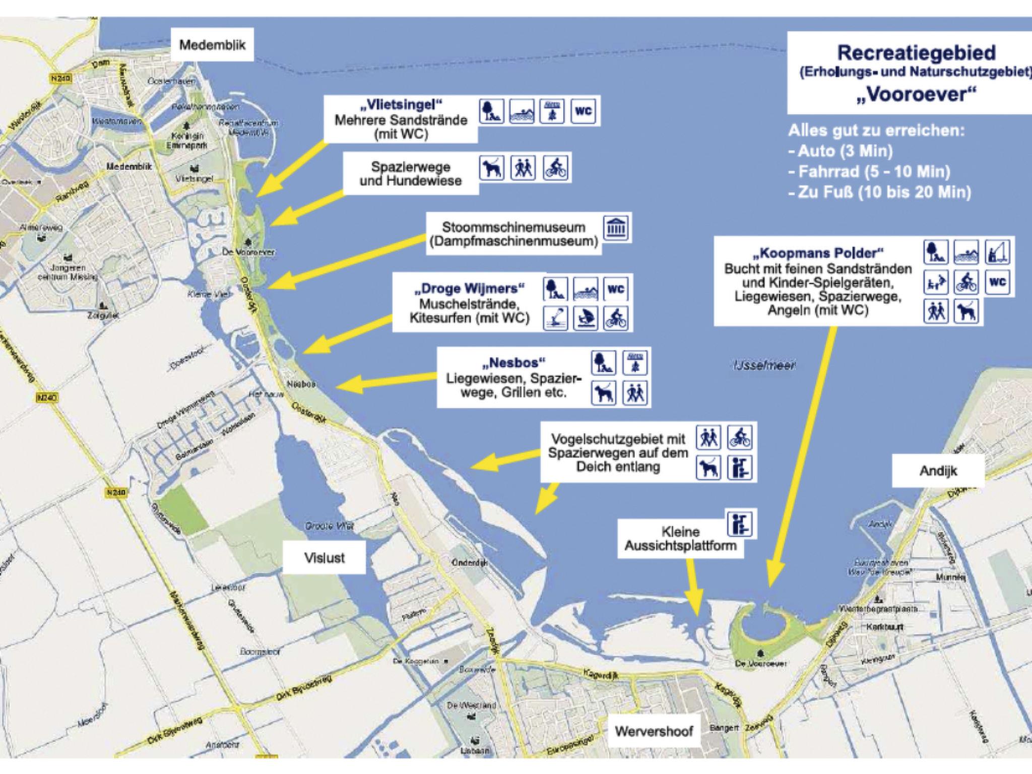 Allergy-free and fishing-friendly holiday home on a small holiday island surrounded by water (lake for swimming, boating, relaxing on the sunbathing lawn) where all those seeking relaxation will feel at home. Distance approx. 300m to the Ijsselmeer with pebble and fine sandy beaches. Swimming, surfing, kite surfing, fishing, cycling and long walks are the order of the day here. Shopping, good restaurants - one right next to our holiday park - make your holiday a pleasure. In summer there is a large antique and flea market within walking distance on Sundays. Sights, museums, for young and old in the immediate vicinity. Beautiful old Dutch towns with charming architecture are only a few minutes away by car, e.g. Medemblik - 5 km - old and new sailing harbour - Hoorn 20 km - Enkuizen - 25 km - with harbour and Zuiderzee Museum worth seeing - or even Amsterdam 60 km, indescribably beautiful. For children there is a large private playground with a kiosk within walking distance of our small children's playground, free admission for Vislust guests. Coffee terrace and many highlights for the kids, such as trampolines, large slides, wooden railway, swings and and and - which can be used free of charge by our small + large guests. Three kilometres away an Indor swimming pool with water slide - Indore playground in Medemblik - for children up to 16 years approx. 5 km away. The nearest harbour can be found here - historic train station to take the historic train to Hoorn and the long dyke with jetty for boat trips. In Enkuizen there is another large Indore swimming pool directly adjacent to a fine sandy beach by the sea. Spokjesland, also in Enkuizen, for children up to the age of 12, is a popular attraction for young families or grandparents with grandchildren. Golf course in the immediate vicinity Our manager will be happy to help you plan day trips, e.g. to the island of Texel or the North Sea.