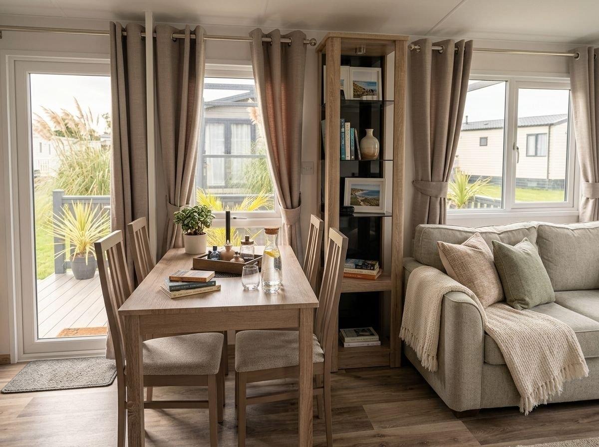 Das Chalet bietet Platz für 4 Personen und überzeugt durch einen hellen, offenen Wohn- und Essbereich. Große Fenster sorgen für viel Licht und ein angenehmes Raumgefühl.