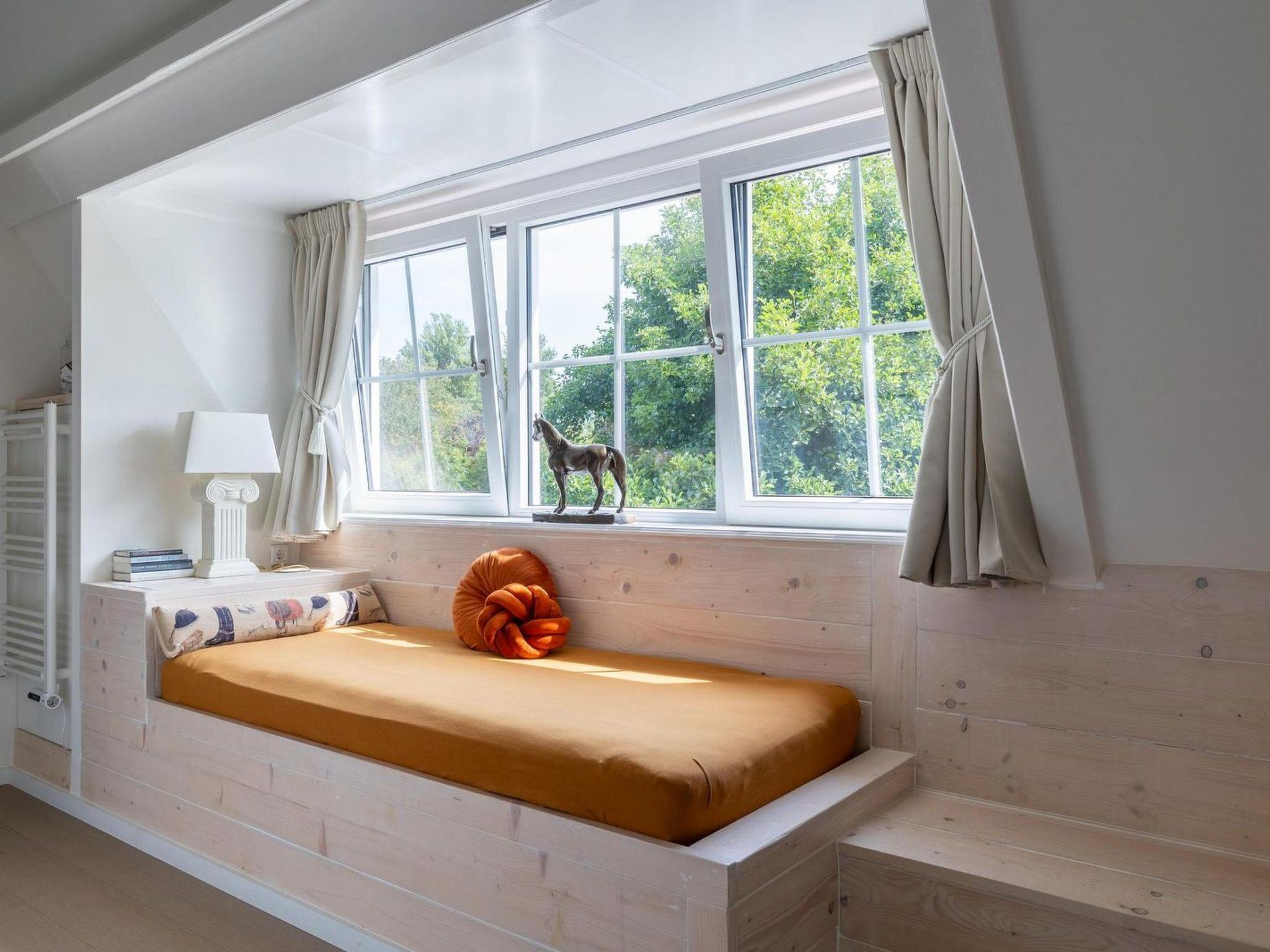 On the first floor, you'll find the bedroom and an adjoining bathroom. The bedroom is an oasis of peace with a comfortable double box spring (160x200cm), a cozy seating/single bed (80x200cm) by the window, and a second television for extra entertainment. A spacious wardrobe with ample hanging and storage space and a practical full-length mirror complete the setup. Bedside lamps by the bed provide both functional and ambient lighting.