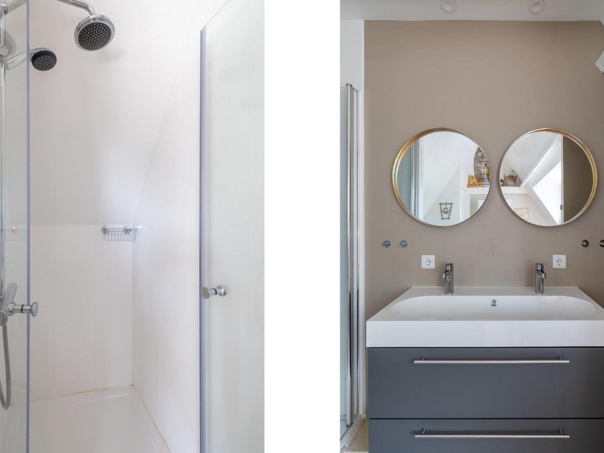The adjoining open bathroom offers ultimate comfort with a walk-in rain shower, a second toilet, and a double sink unit, where you can freshen up. For added convenience during your stay, there is a storage room downstairs with a washing machine.