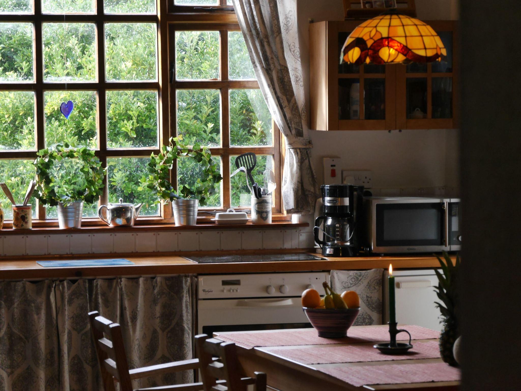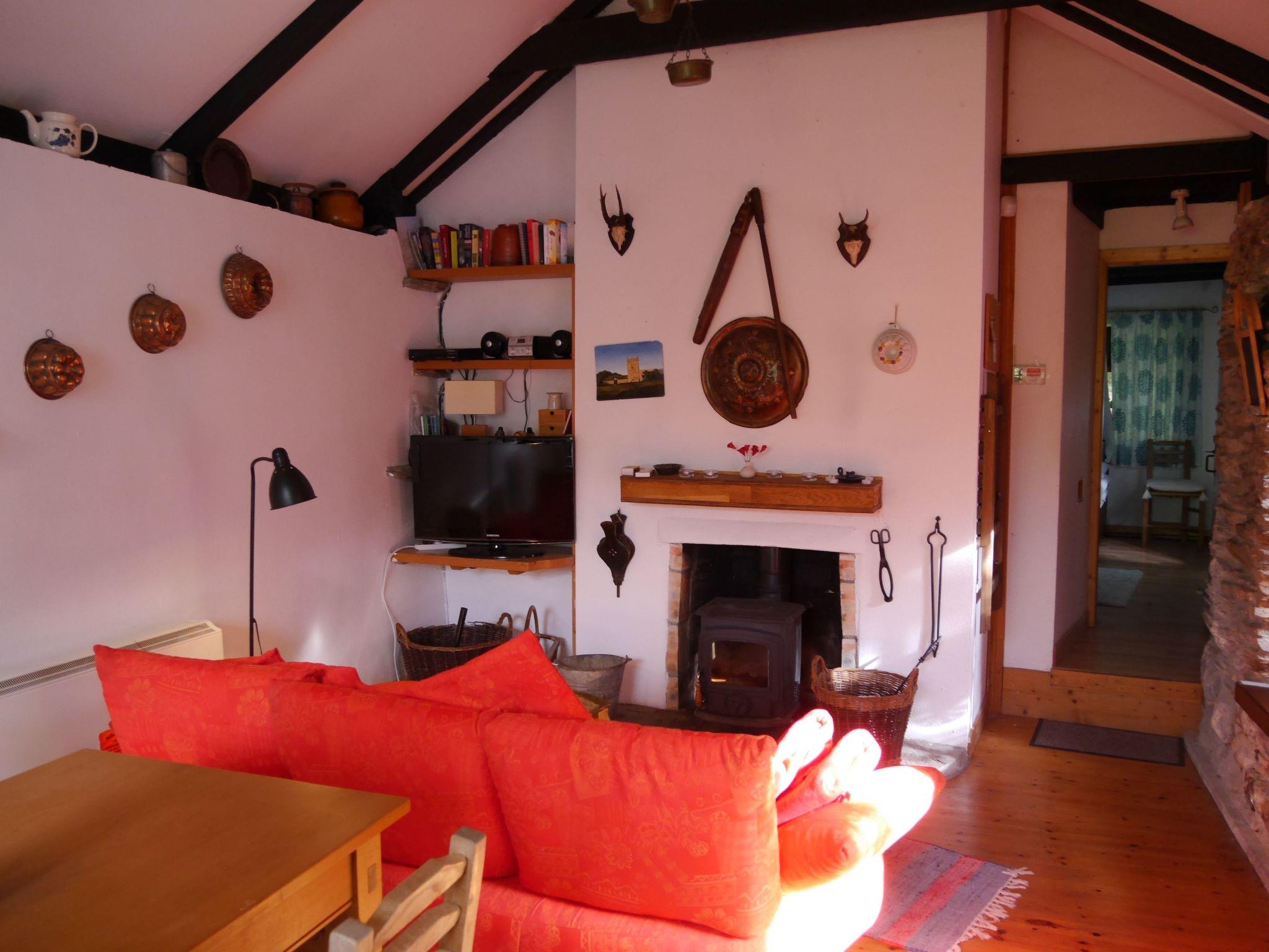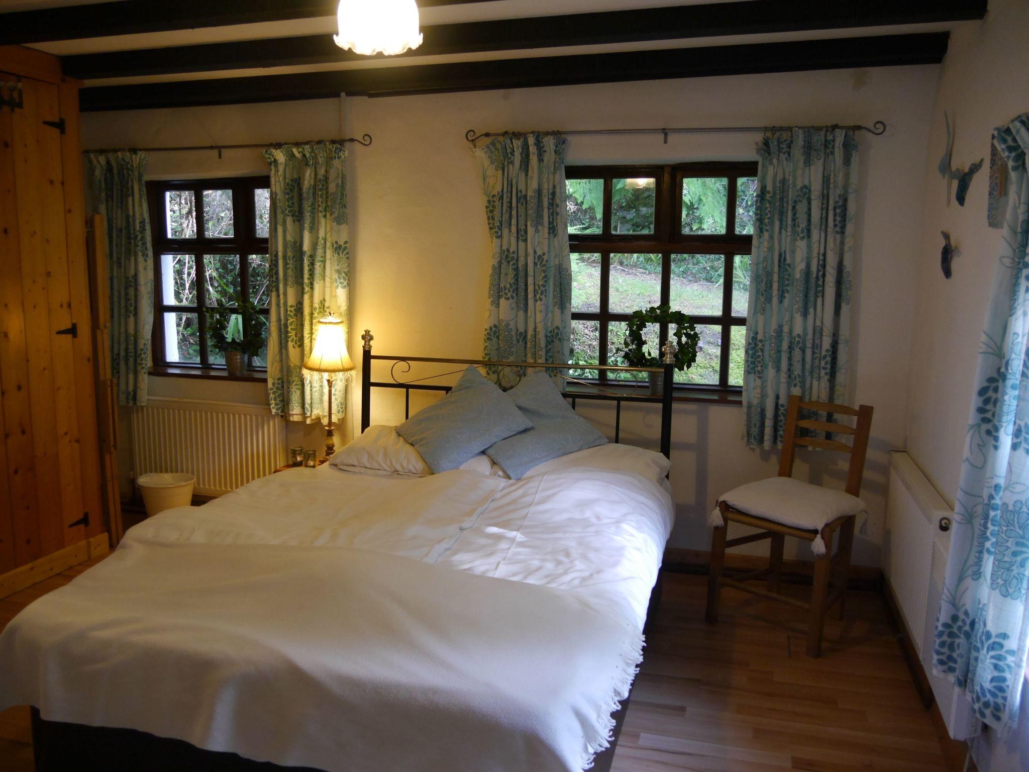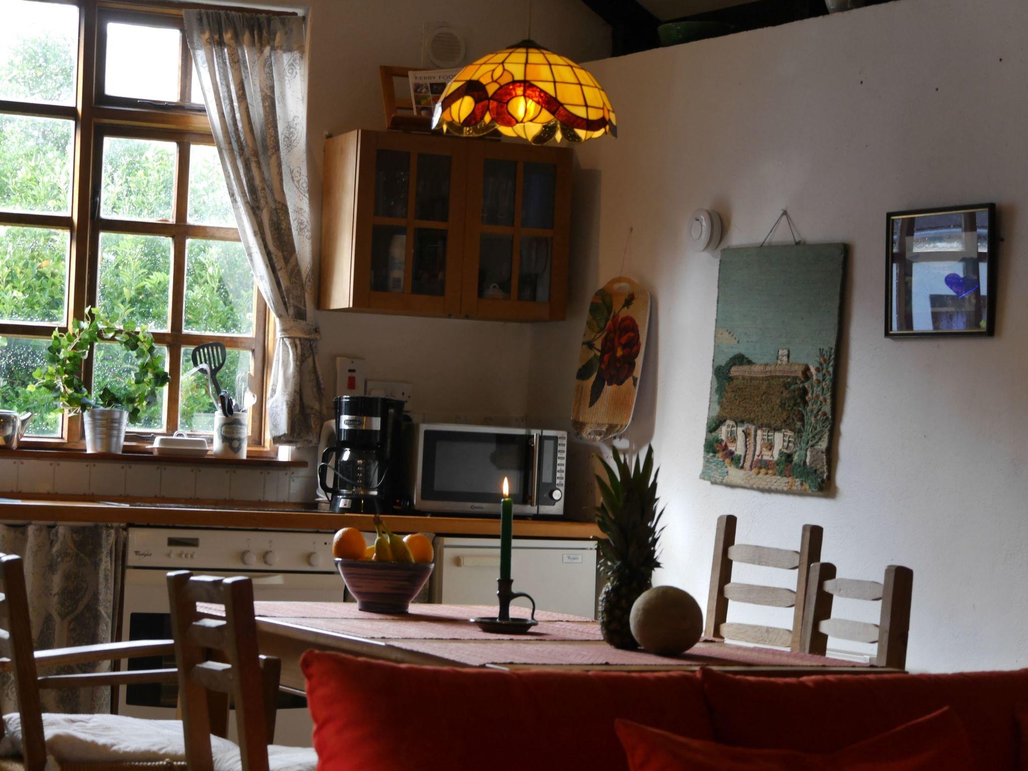 1 bedroom (small double approx. 1.40 m). Living room with wood-burning stove. Living room with small flatscreen TV (approx. 20 German channels; no Irish TV). Combined living/dining room/kitchen (one room), kitchen with ceramic hob, microwave, washing machine, kettle. Small sauna. Bathroom with walk-in shower and WC. Oil central heating. Laminate/tiled floor. No carpet. Non-smoking house. No pets allowed.