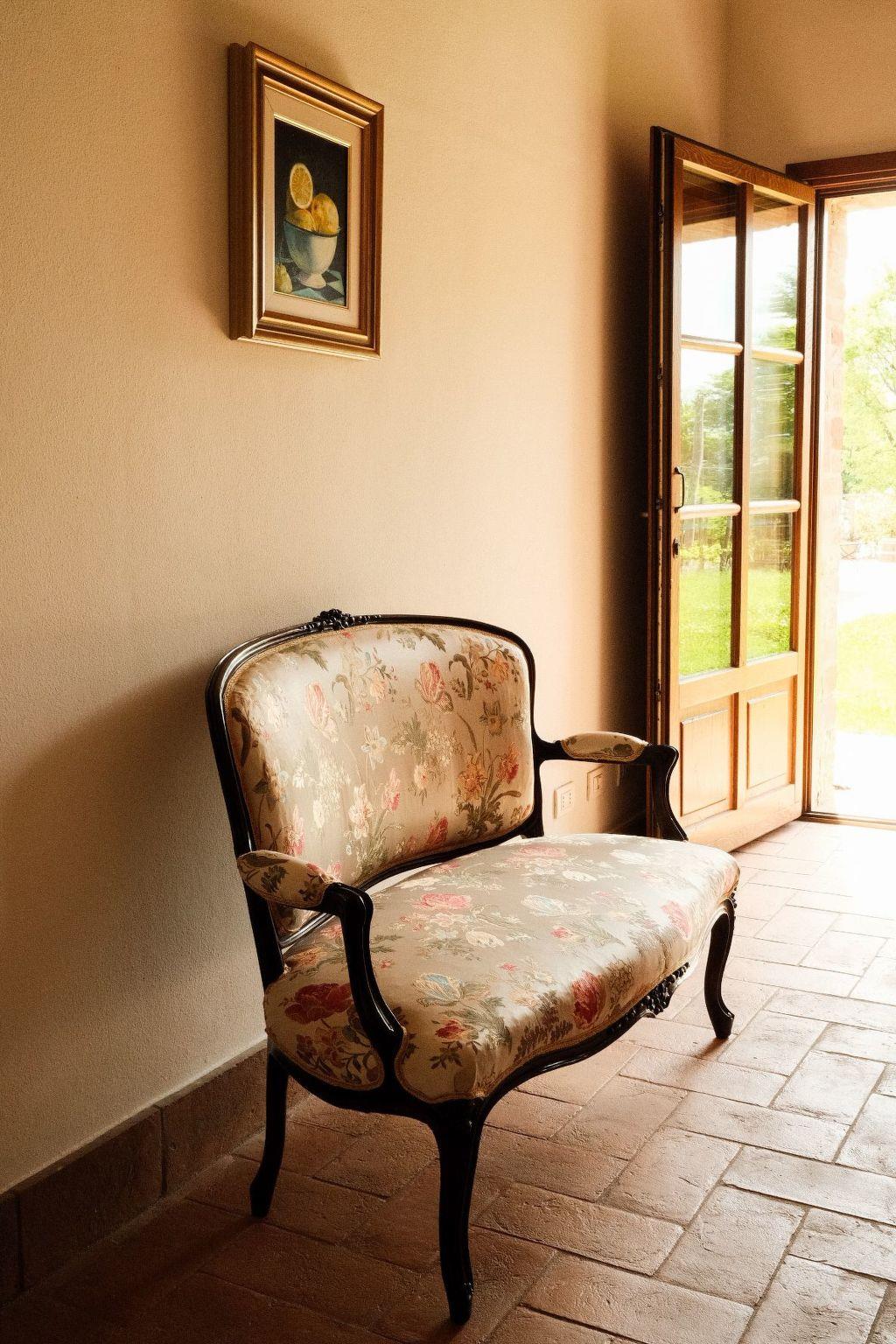 Our "Molino" flat has a kitchen-cum-living room with a fireplace and a bedroom with a gallery on which there is a children's bed. The spacious bathroom has a bathtub and a bidet. The flat is located right next to the garden, with a view as far as Montepulciano, and the pool is just a few steps away.